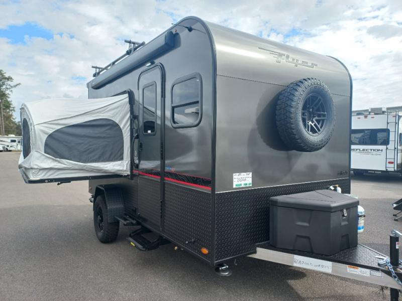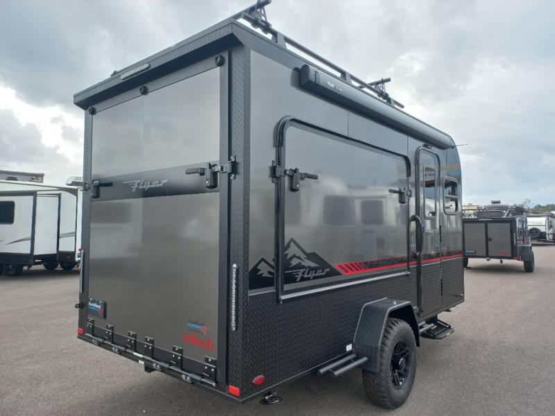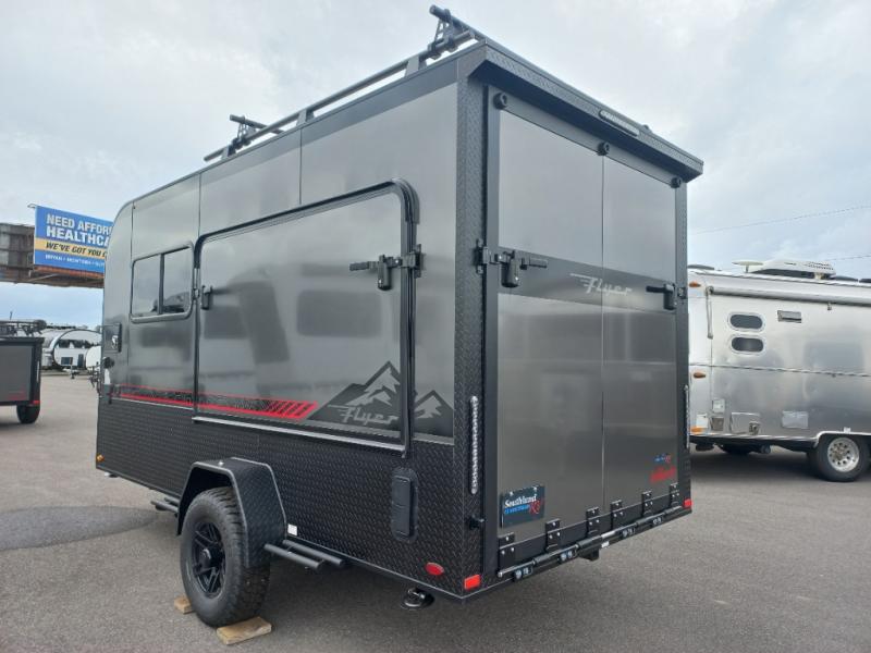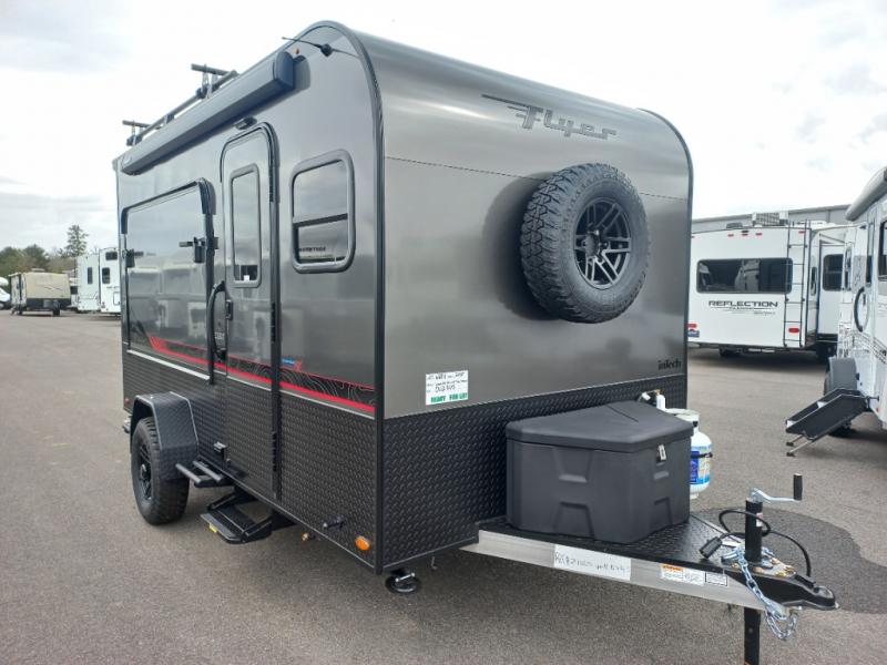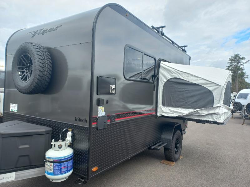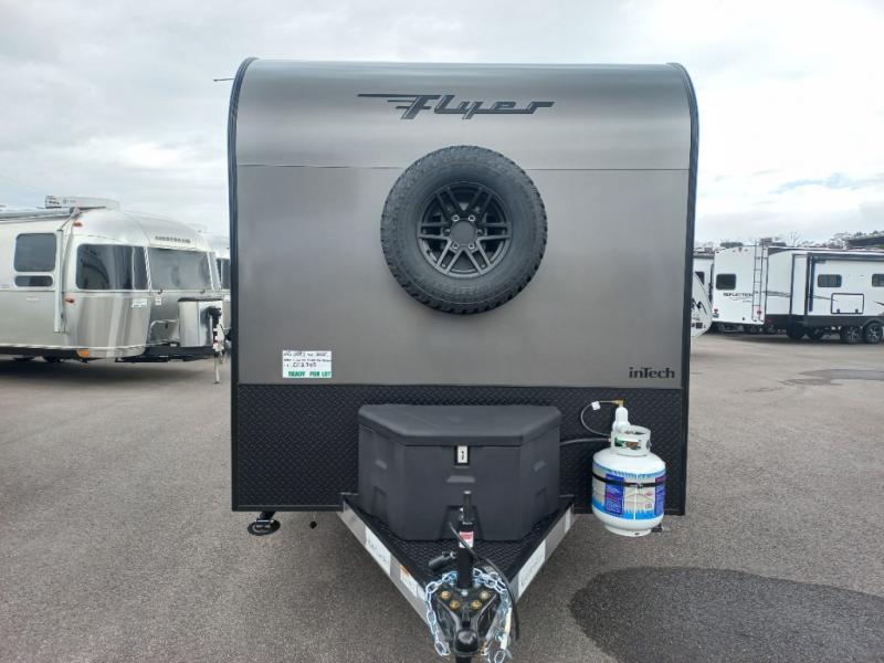 The inTech RV Flyer travel trailers and toy hauler expandables are ready for adventure whenever you are! With the all-aluminum, all-tube cage frame, the Flyer has been built with lightweight and long-lasting materials so that you can enjoy your unit for many, many years. The Flyer has a rugged design so that you can confidently explore new territory and go where traditional RVs cannot. The Flyer has a 2" rear receiver rated for 175 pounds which allows you to bring along your bikes, and the front tongue box is the perfect solution for your storage needs because it is easily accessible and out of the interior. The Flyer also comes with a Bluetooth stereo that has two speakers so that you can always have your best music playing, and the list of optional features is going to entice you to make your Flyer even more exceptional. The optional roof rack will allow you to bring along kayaks, and the optional A/C with heat is definitely going to be tempting to add.