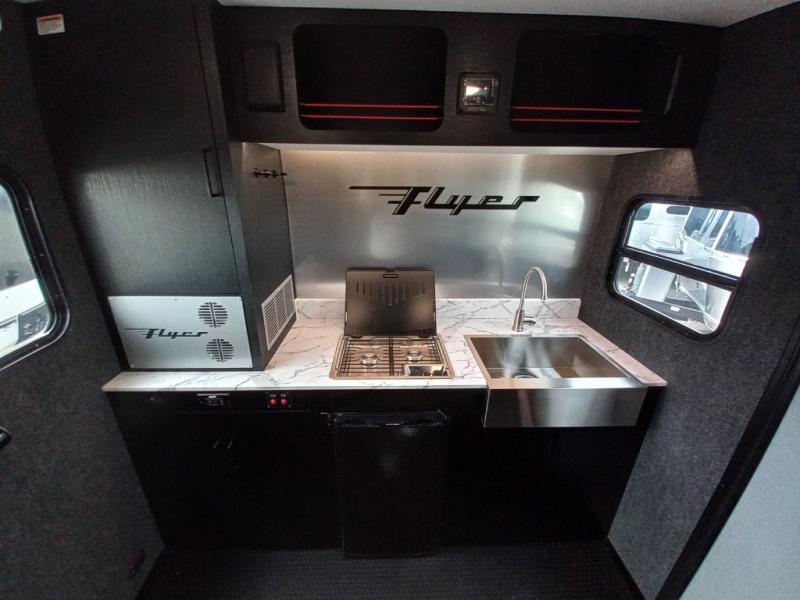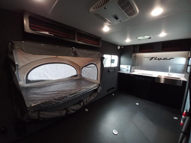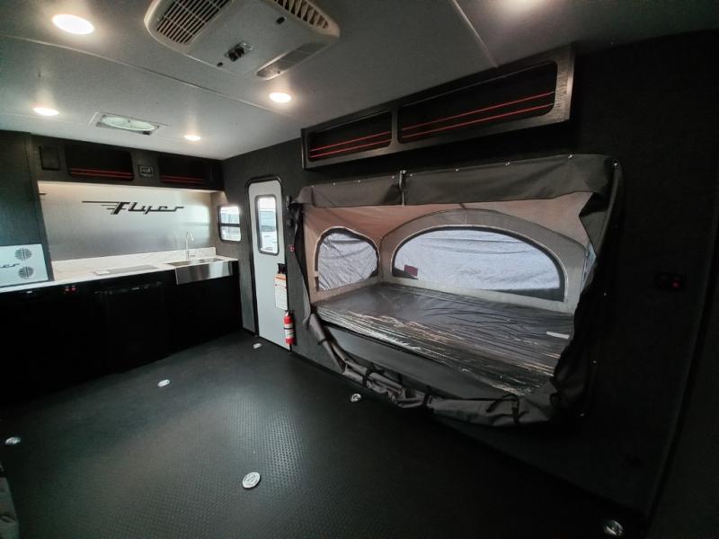 This Flyer expandable toy hauler is the biggest and the best model offered in the Flyer line-up! Not only does this toy hauler provide you with a spacious and versatile interior, but it also gives you a desirable cargo space so that you can bring along some toys for the adventure. This expandable comes standard with one tip-out bed, but you can easily add on the second optional tip-out bed which will add lots of extra room for sleeping and relaxing. The other feature found on this Flyer that is going to make your trips truly effortless is the front kitchen that comes with a two-burner stainless steel cooktop, a 3.1-cubic foot refrigerator, a large farmhouse sink, and an 8.5-gallon fresh water tank. This expandable toy hauler has a dry weight that ranges from 2,440-2,760 LBS and a net carrying capacity that ranges from 2,440-2,760 LBS, so come check it out!