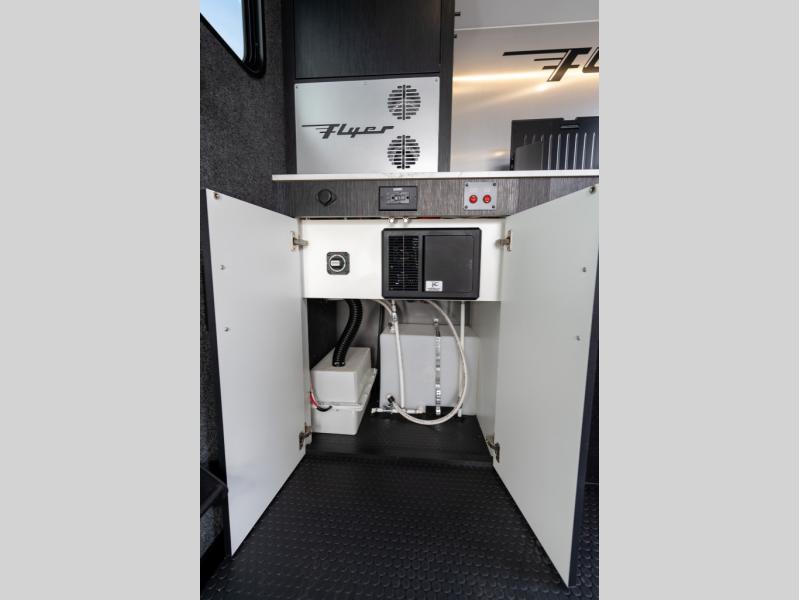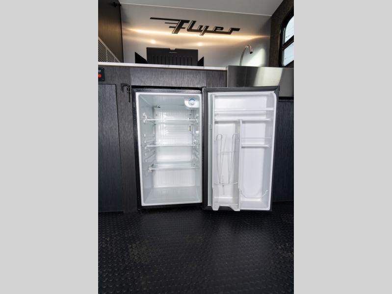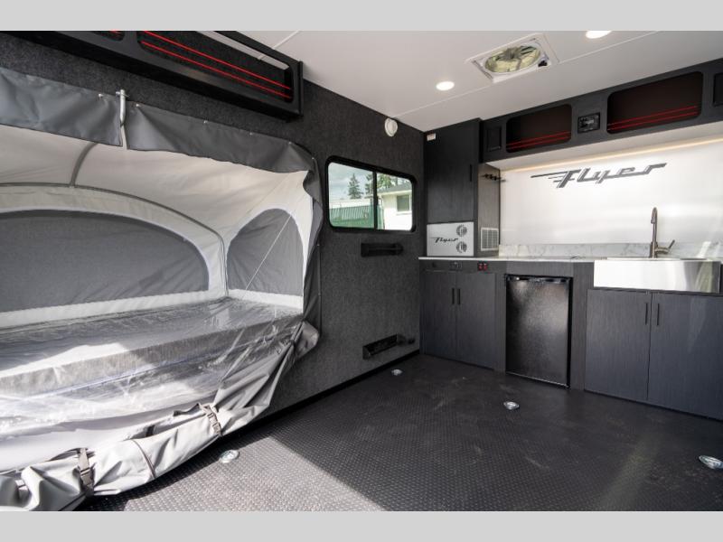 This Flyer expandable toy hauler is perfect for all your outdoor adventure! Not only does this toy hauler provide you with a spacious and versatile interior, but it also gives you a desirable cargo space so that you can bring along some toys for the adventure. This expandable comes standard with one tip-out bed, but you can easily add on the second optional tip-out bed which will add lots of extra room for sleeping and relaxing. The other feature found on this Flyer that is going to make your trips truly effortless is the front kitchen that comes with a two-burner stainless steel cooktop, a 3.1-cubic foot refrigerator, a large farmhouse sink, and an 8.5-gallon fresh water tank. This expandable toy hauler has a dry weight and net carrying capacity that ranges from 2,440-2,760 LBS.