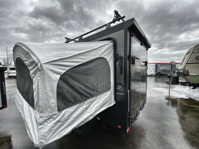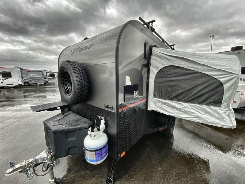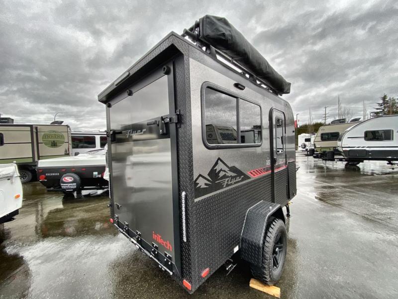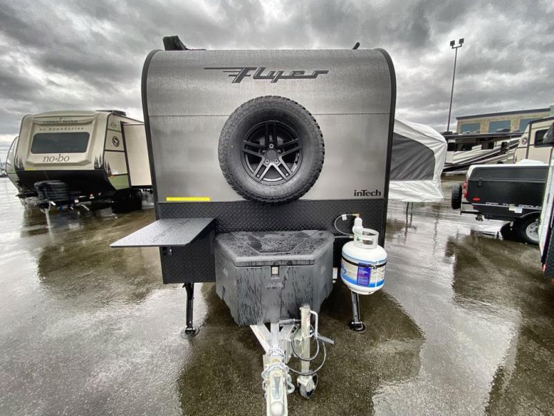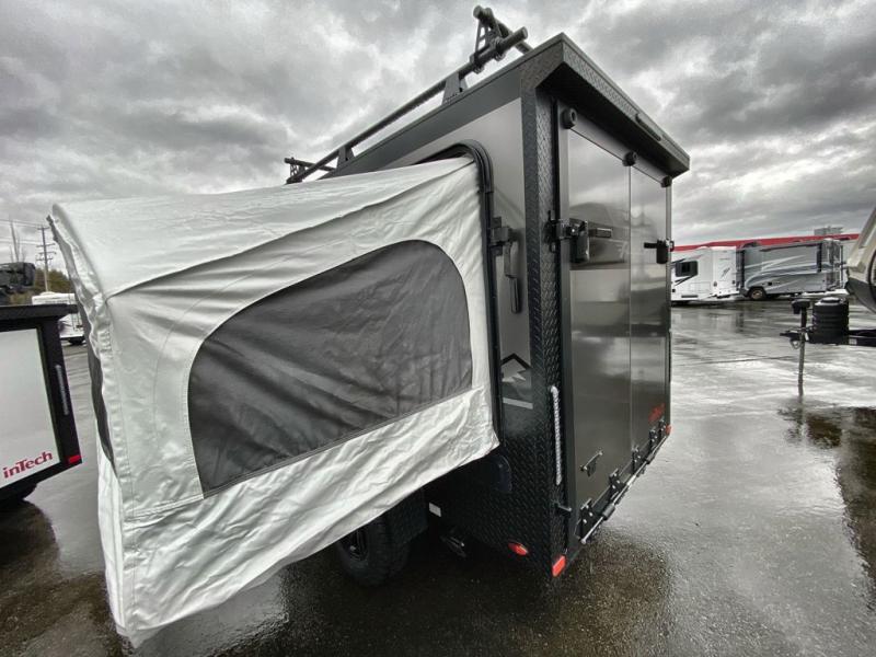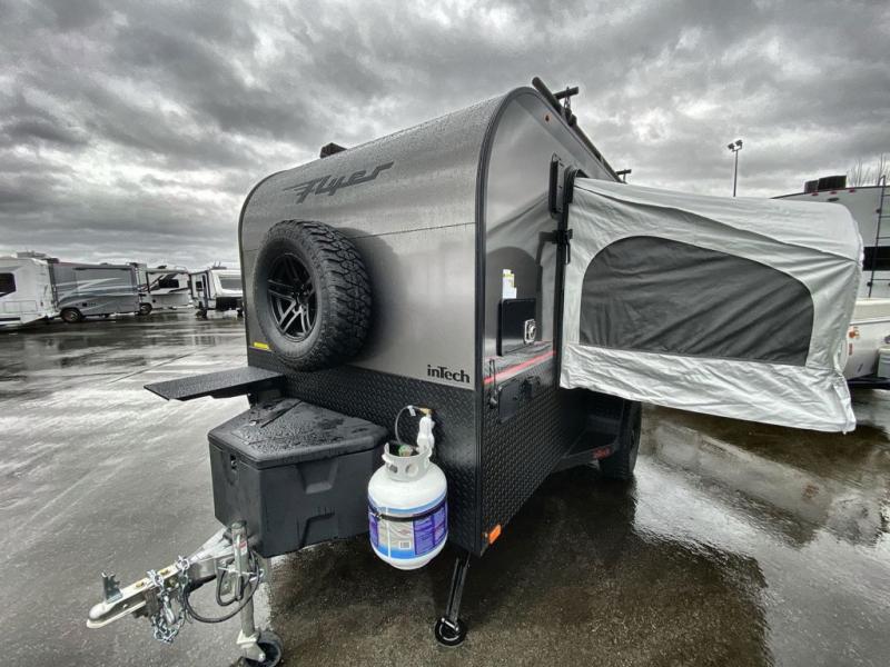The inTech RV Flyer travel trailers and toy hauler expandables are ready for adventure whenever you are! With the all-aluminum, all-tube cage frame, the Flyer has been built with lightweight and long-lasting materials so that you can enjoy your unit for many, many years. The Flyer has a rugged design so that you can confidently explore new territory and go where traditional RVs cannot. The Flyer has a 2" rear receiver rated for 175 pounds which allows you to bring along your bikes, and the Bluetooth stereo has two speakers you can always have your best music playing. The optional roof rack will allow you to bring along kayaks, and there are more available options depending on the model you choose.