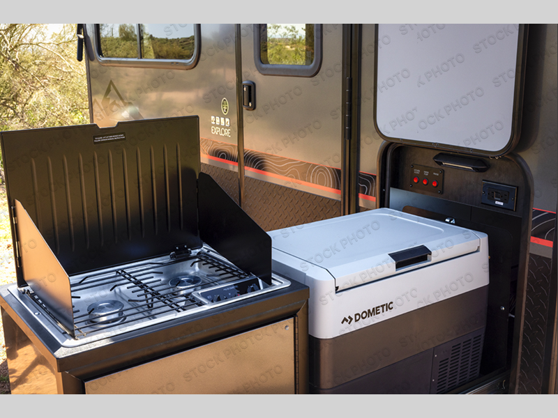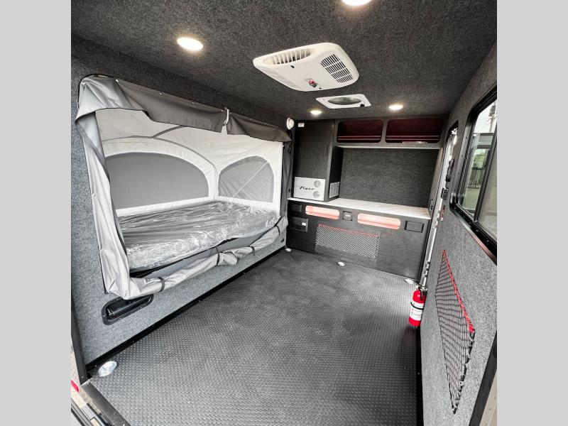 Not only is this Flyer toy hauler built to go where most traditional RVs cannot, but it is also built with a standard rear ramp or optional double rear doors, and six tie-down rings so that it can also serve as the perfect cargo transport too! The interior is spacious with its 46" x 81" tip-out bed, and if you add the second optional tip-out bed, you'll have an amazing amount of space on the inside. This expandable toy hauler is very functional, but you can make it even more enticing by adding optional Adventure Package that comes with an A/C, off-road tires, a roof rack, plus a slide out kitchen! This will allow you to cook wherever you choose to camp. The dry weight for this unit ranges from 1,580-2,110 LBS, the tongue weight ranges from 250-485 LBS, and the net carrying capacity ranges from 880-1,410 LBS.