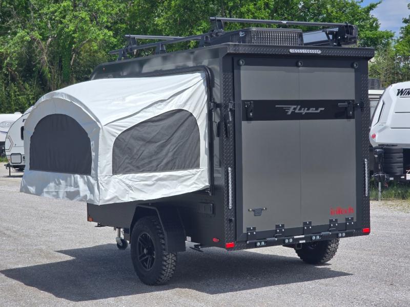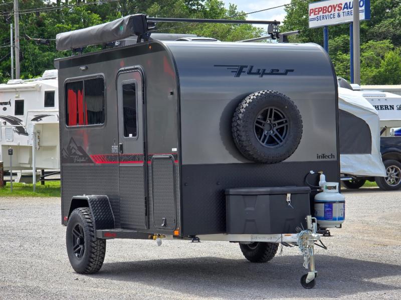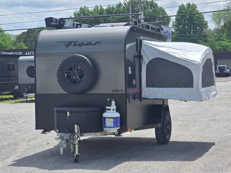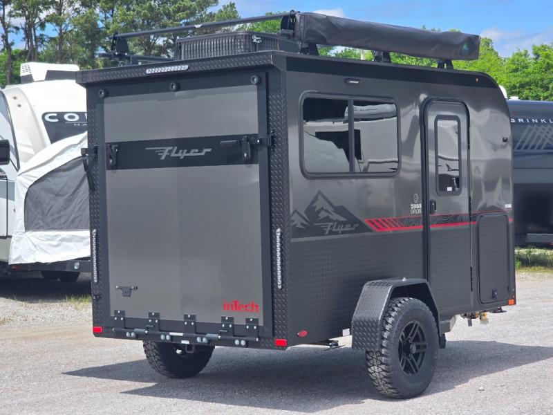 The inTech RV Flyer travel trailers and toy hauler expandables are ready for adventure whenever you are! With the all-aluminum, all-tube cage frame, the Flyer has been built with lightweight and long-lasting materials so that you can enjoy your unit for many, many years. The Flyer has a rugged design so that you can confidently explore new territory and go where traditional RVs cannot. The Flyer has a 2" rear receiver rated for 175 pounds which allows you to bring along your bikes, and the Bluetooth stereo has two speakers you can always have your best music playing. The optional roof rack will allow you to bring along kayaks, and there are more available options depending on the model you choose.