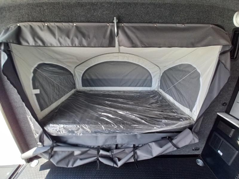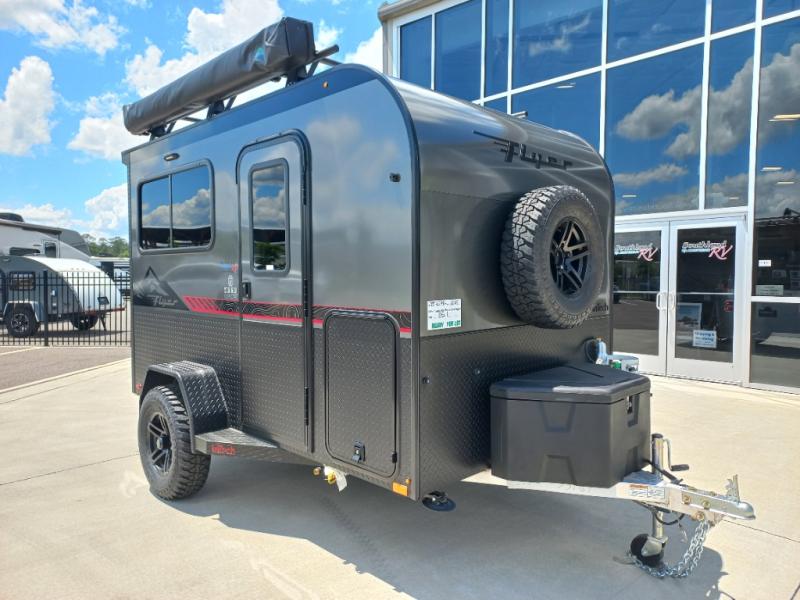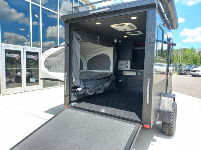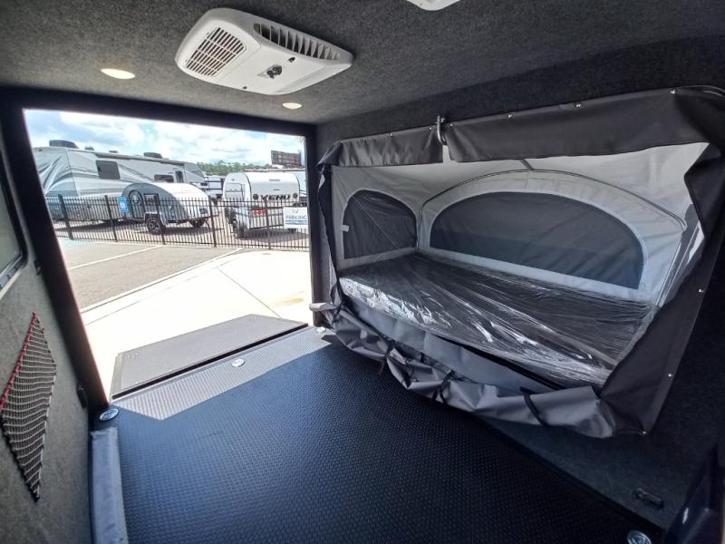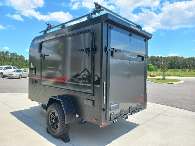 Not only is this Flyer toy hauler built to go where most traditional RVs cannot, but it is also built with a standard rear ramp or optional double rear doors, and six tie-down rings so that it can also serve as the perfect cargo transport too! The interior is spacious with its 46" x 81" tip-out bed, and if you add the second optional tip-out bed, you'll have an amazing amount of space on the inside. This expandable toy hauler is very functional, but you can make it even more enticing by adding optional Adventure Package that comes with an A/C, off-road tires, a roof rack, plus a slide out kitchen! This will allow you to cook wherever you choose to camp. The dry weight for this unit ranges from 1,580-2,110 LBS, the tongue weight ranges from 250-485 LBS, and the net carrying capacity ranges from 880-1,410 LBS.