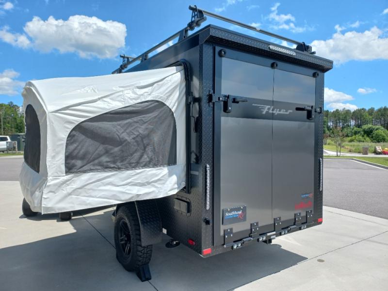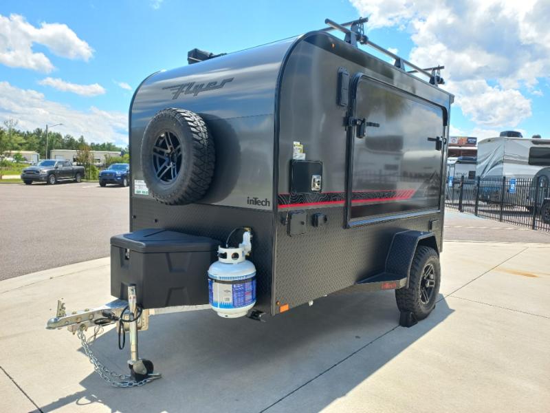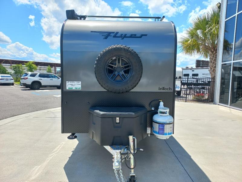 The inTech RV Flyer travel trailers and toy hauler expandables are ready for adventure whenever you are! With the all-aluminum, all-tube cage frame, the Flyer has been built with lightweight and long-lasting materials so that you can enjoy your unit for many, many years. The Flyer has a rugged design so that you can confidently explore new territory and go where traditional RVs cannot. The Flyer has a 2" rear receiver rated for 175 pounds which allows you to bring along your bikes, and the Bluetooth stereo has two speakers you can always have your best music playing. The optional roof rack will allow you to bring along kayaks, and there are more available options depending on the model you choose.