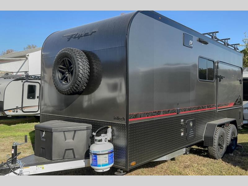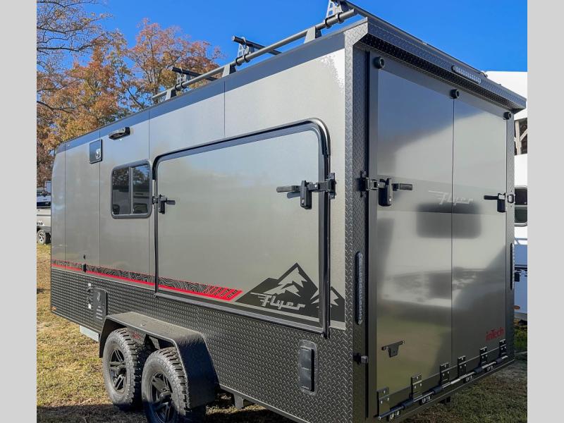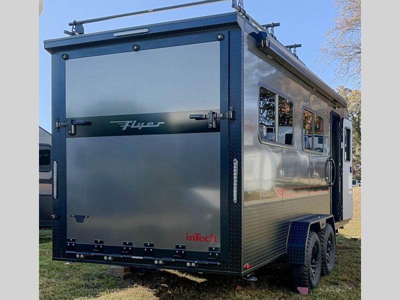 The inTech RV Flyer travel trailers and toy hauler expandables are ready for adventure whenever you are! With the all-aluminum, all-tube cage frame, the Flyer has been built with lightweight and long-lasting materials so that you can enjoy your unit for many, many years. The Flyer has a rugged design so that you can confidently explore new territory and go where traditional RVs cannot. The Flyer has a 2" rear receiver rated for 175 pounds which allows you to bring along your bikes, and the Bluetooth stereo has two speakers you can always have your best music playing. The optional roof rack will allow you to bring along kayaks, and there are more available options depending on the model you choose.