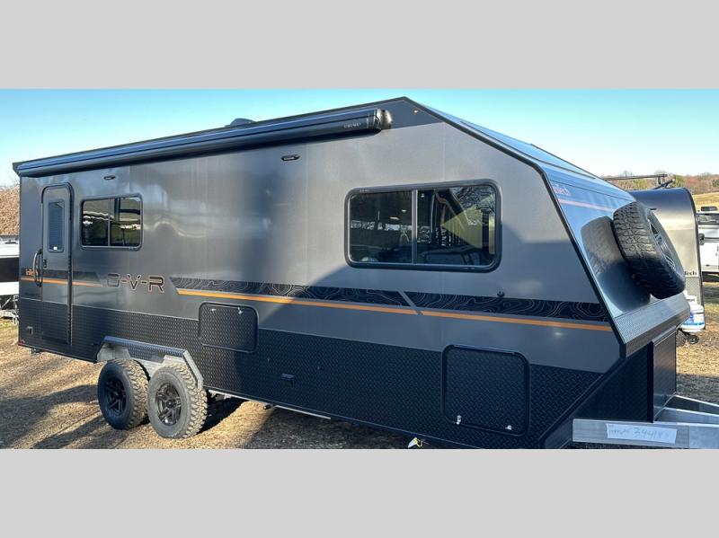 Navigate tough roads in this O-V-R travel trailer! You will love having your own walk-around queen bed in the front bedroom, or you can choose the optional twin beds in place of the queen bed. There is a private porcelain toilet and a round sink across the hall from the shower, allowing two people to freshen up at once, and you'll appreciate the base cabinet with under-sink storage for your toiletries. Once you've worked up an appetite from hiking, head to the kitchen to prepare lunch on the stainless steel two burner cooktop and grab a cold drink from the 10 cu. ft. 12V refrigerator. You can dine at the L-shaped dinette, or head outdoors to relax in your camp chair. Add the optional slide out exterior kitchen or the optional 3.6kW LP generator for even more convenience!