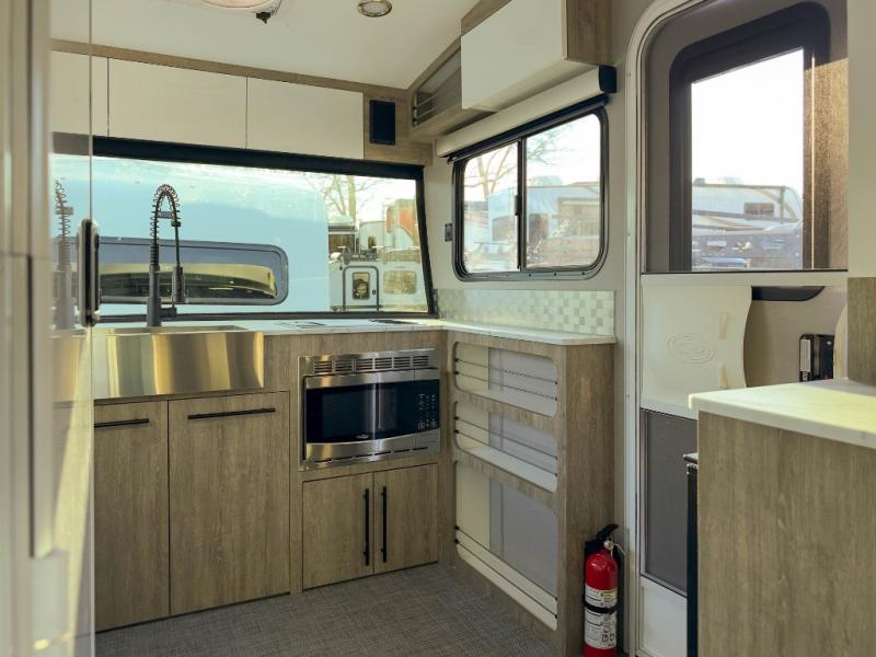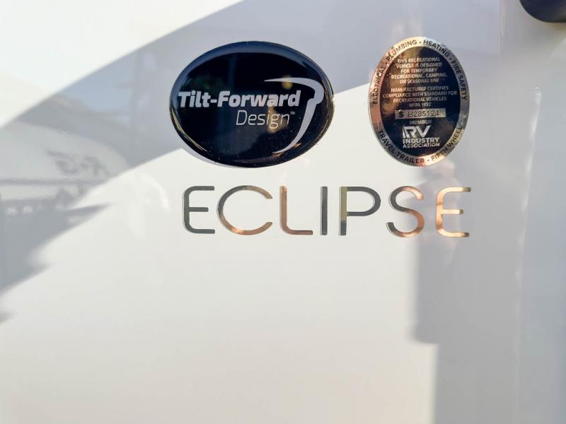 This Eclipse travel trailer will be the perfect companion on all your excursions. The large farmhouse style sink in the front kitchen provides plenty of space to clean up after dinner, and the stainless steel microwave will be perfect for popcorn and game night. The rear twin beds can be used to dine or sleep on, and you'll have a filler cushion if you want to convert them into a king-size bed! You won't have to worry about being bored on those rainy days since this model includes a 28" TV and a Bluetooth stereo with four speakers! This model also has a dry weight that ranges from 3,240-3,660 lbs. lbs., a tongue weight between