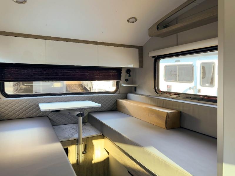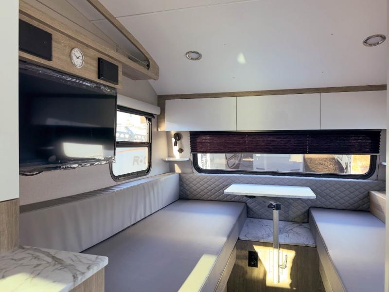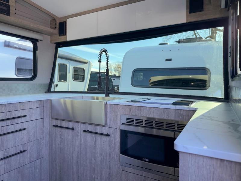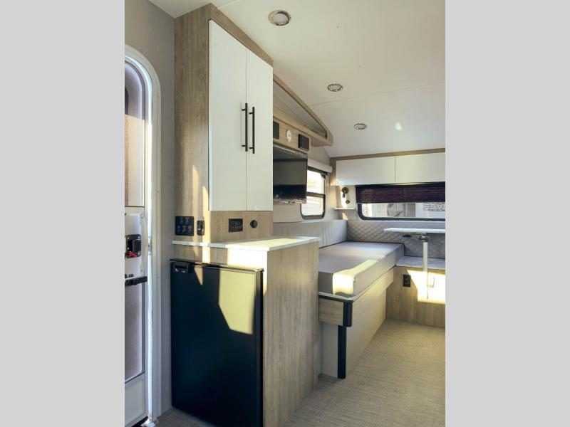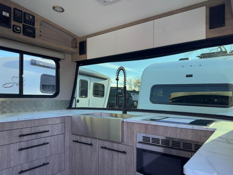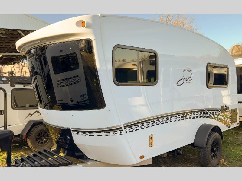 With any Sol travel trailer by inTech RV you will find strong, durable construction consisting of lightweight aluminum that is easier to tow and resists rust, water, and dents. The Tilt-Forward Design creates more space inside so you can stretch out, and the panoramic windshield gives a great view of the mountains, ocean, or forest! The elegant interior features tinted windows with shades, Infinity woven flooring, and a stainless steel cooktop and microwave. You will stay comfortable year around since these models include a 15K BTU A/C and a 16K BTU furnace. The optional Rover Package can also be added that features rugged decals, off-road tires with a 3" lift, two different color choices to choose from, plus more!