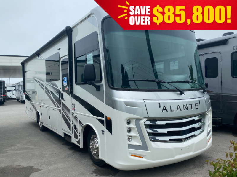 With any Alante Class A gas motorhome by Jayco, the mandatory Customer Value package provides JRide technology with a computer-balanced driveshaft ensuring smooth and efficient power transfer to the wheels, and SACHS shock absorbers offering independent adjustments to the road conditions. There is also a one-piece, seamless, crowned fiberglass roof, and an exterior entertainment center to watch shows and movies. The automatic hydraulic leveling jacks, 120 in. panoramic windshield, 200W solar panel, and the electric-powered entrance step will make traveling that much easier. And the interior equipment includes a Sony infotainment center with Apple CarPlay and Android Auto, a backup and side-view cameras for easy parking, plus a 6-way power driver seat for comfortable and safe driving. You will also love the power front privacy shade with manual side privacy shades, LED-lit hardwood fascia and countertops, a pop-up charging station in the kitchen and a USB port and wireless charging in the nightstands.