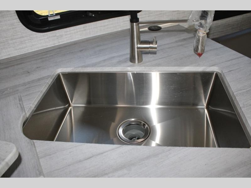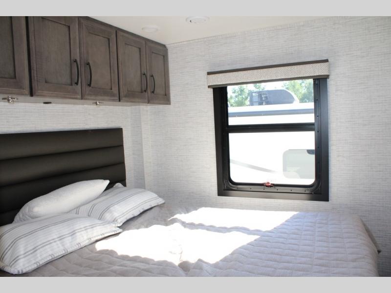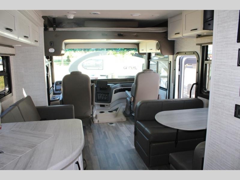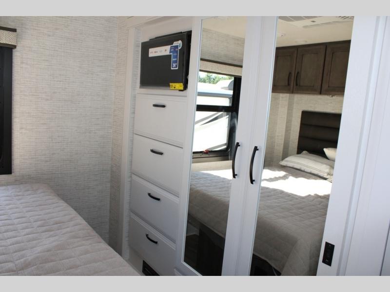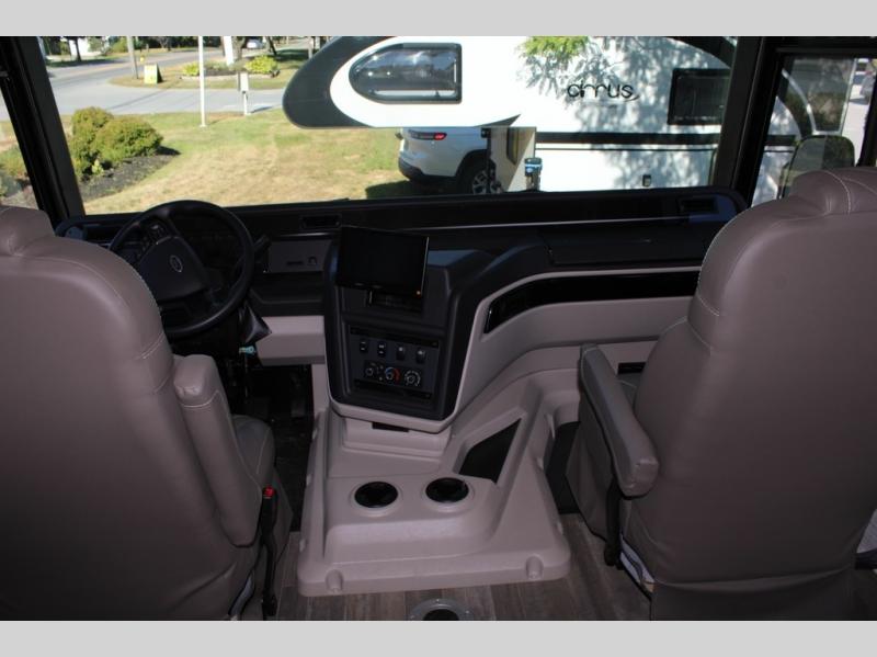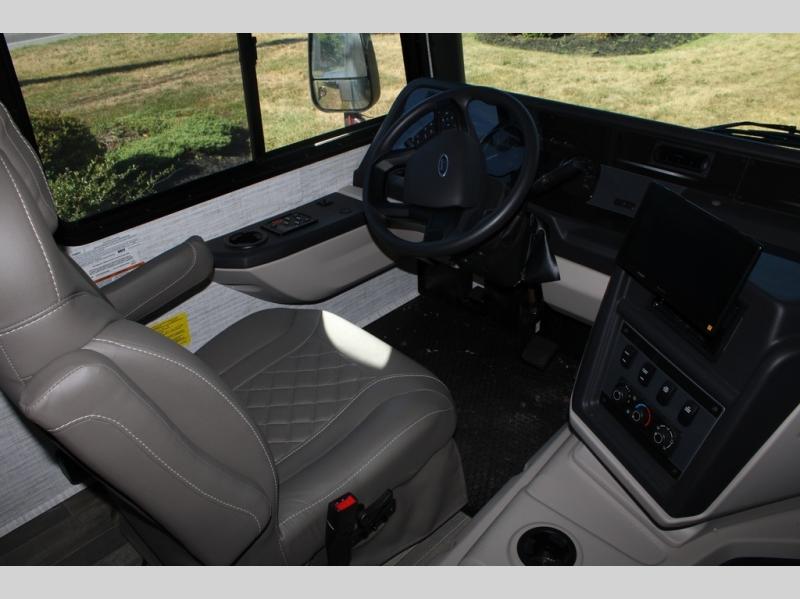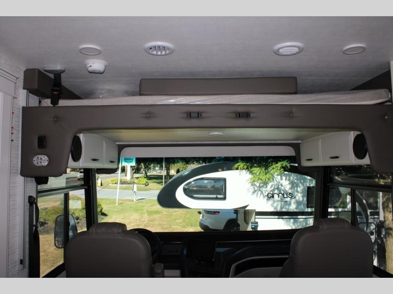 With any Alante Class A gas motorhome by Jayco, the mandatory Customer Value package provides JRide technology with a computer-balanced driveshaft ensuring smooth and efficient power transfer to the wheels, and SACHS shock absorbers offering independent adjustments to the road conditions. There is also a one-piece, seamless, crowned fiberglass roof, and an exterior entertainment center to watch shows and movies. The automatic hydraulic leveling jacks, 120 in. panoramic windshield, 200W solar panel, and the electric-powered entrance step will make traveling that much easier. And the interior equipment includes a Sony infotainment center with Apple CarPlay and Android Auto, a backup and side-view cameras for easy parking, plus a 6-way power driver seat for comfortable and safe driving. You will also love the power front privacy shade with manual side privacy shades, LED-lit hardwood fascia and countertops, a pop-up charging station in the kitchen and a USB port and wireless charging in the nightstands.