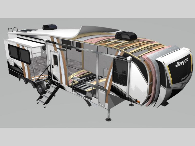 With any Eagle fifth wheel or travel trailer by Jayco you will appreciate durable construction materials, like the Magnum Truss Roof and the Stronghold VBL laminated walls. The JAYCOMMAND Smart RV system puts you in control of your RV's functions, and the 5 Star Handling Package will provide smooth towing from home to camp. Each model features Climate Shield zero-degree tested weather protection and the industry-exclusive HELIX cooling system that features two 15,000 BTU Whisper Quiet A/C's to keep you comfortable year around. Some of the exterior conveniences you are sure to love are the pass-through storage with Slam-Latch baggage doors and an automotive style front cap with max turn radius. The Eagle fifth wheels and travel trailers are designed to make you feel at home with solid hardwood slide fascia, residential vinyl flooring, a bathroom skylight, and plenty of storage for all your belongings.