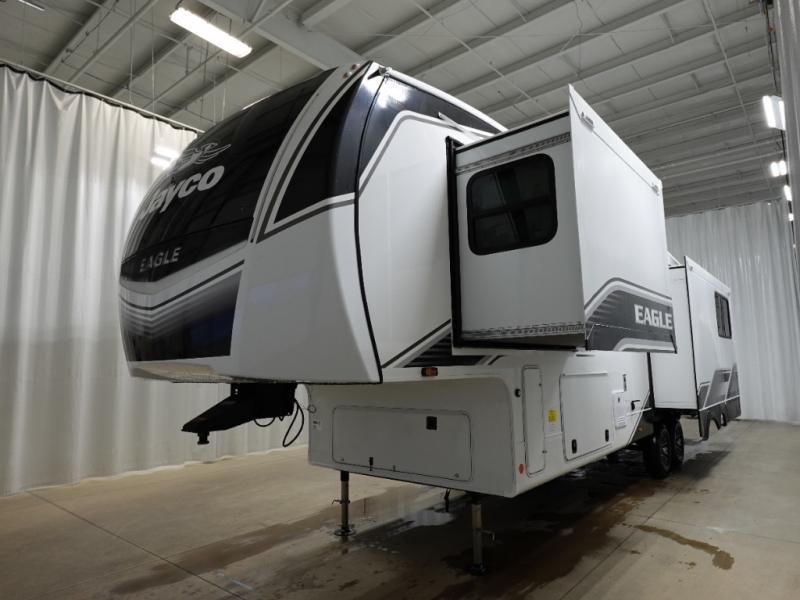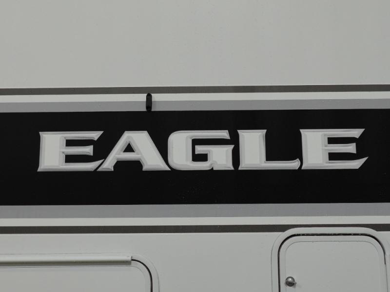 With any Eagle fifth wheel by Jayco you will appreciate durable construction materials, like the Magnum Truss Roof and the Stronghold VBL laminated walls. The JAYCOMMAND Smart RV system puts you in control of your RV's functions, and the 5 Star Handling Package will provide smooth towing from home to camp. Each model features Climate Shield zero-degree tested weather protection and the industry-exclusive HELIX cooling system that features two 15,000 BTU Whisper Quiet A/C's to keep you comfortable year around. Some of the exterior conveniences you are sure to love are the pass-through storage with Slam-Latch baggage doors and an automotive style front cap with max turn radius. The Eagle fifth wheels are designed to make you feel at home with solid hardwood slide fascia, residential vinyl flooring throughout, 100% no floor vents, and blackout roller shades with reflective side throughout for added privacy and insulation.