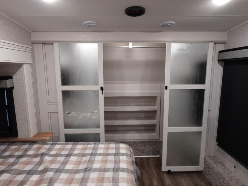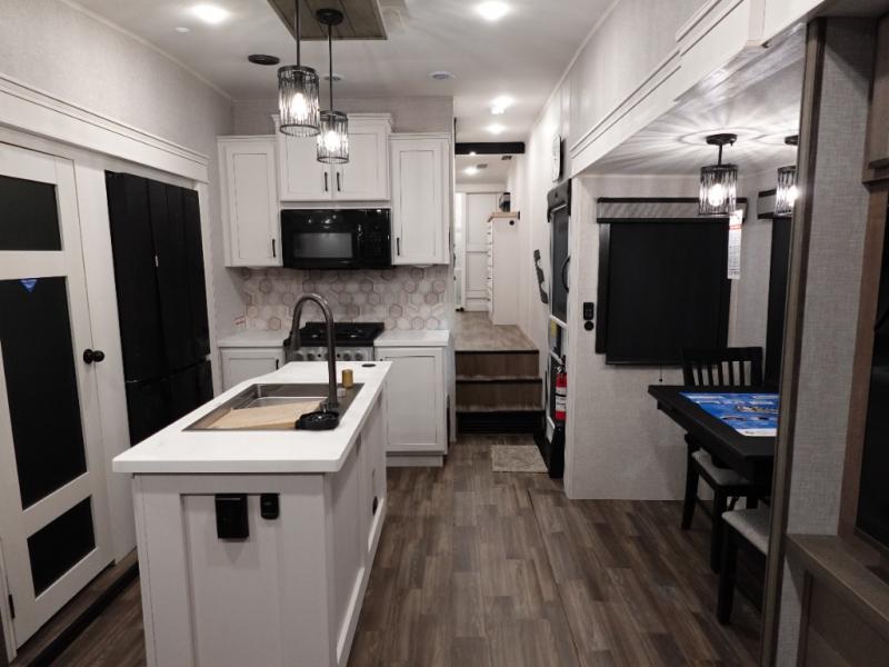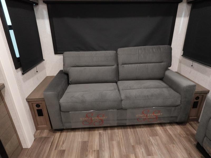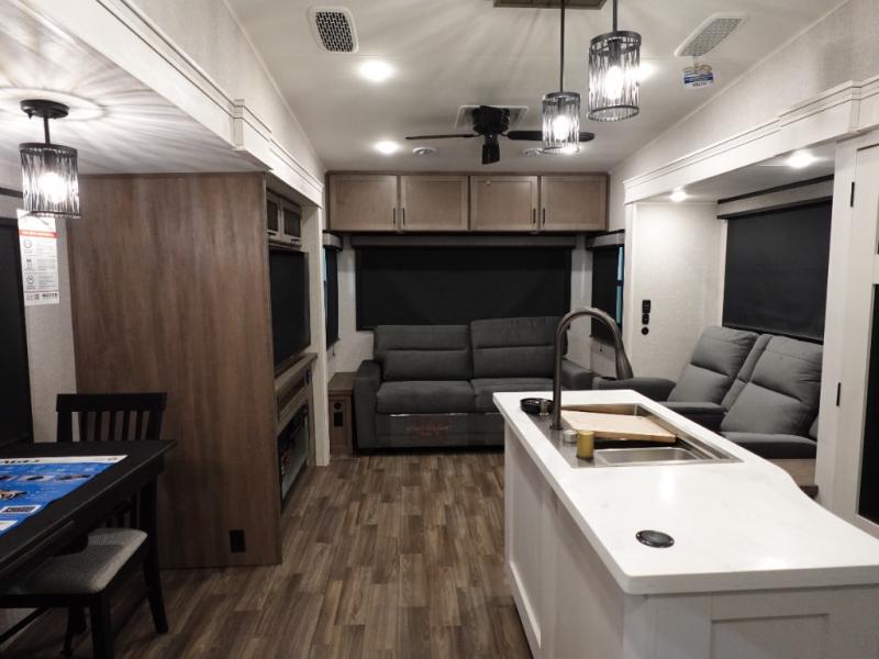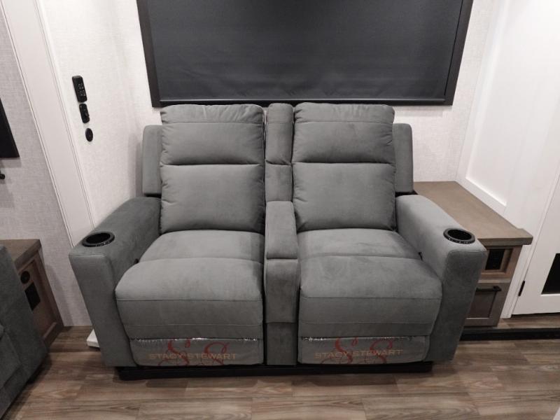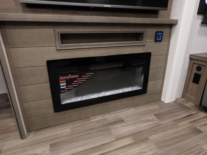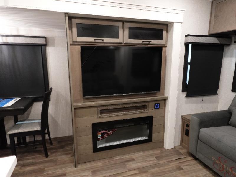 Trips to the lake are made luxurious in this spacious fifth wheel for four! The rear living area includes a tri-fold sofa, a ceiling fan to keep cool, plus theater seats across from the entertainment center and fireplace. You will love the walk-in pantry and 16 cu. ft. 12V refrigerator to store food for the whole week, plus there are overhead cabinets for even more storage. The full bath features a residential style glass shower door, a linen closet, plus a medicine cabinet to keep all your necessities organized. You will feel right at home in the front private bedroom with its king bed slide out, a chest with TV prep plus a walk-in closet with shelves and washer and dryer prep. You can't go wrong with this fifth wheel!