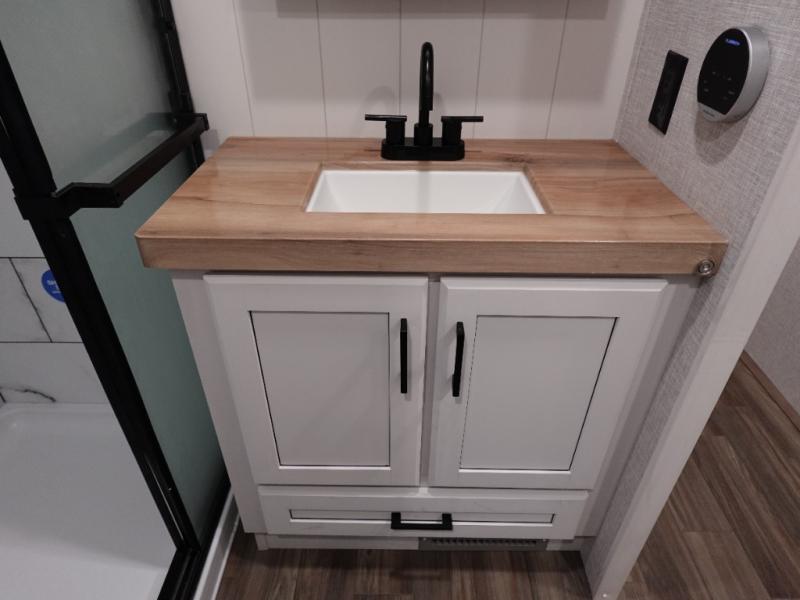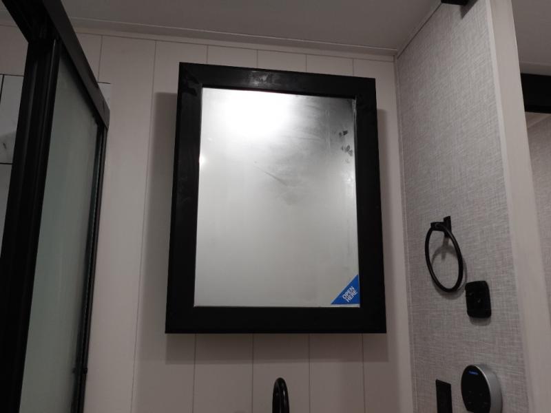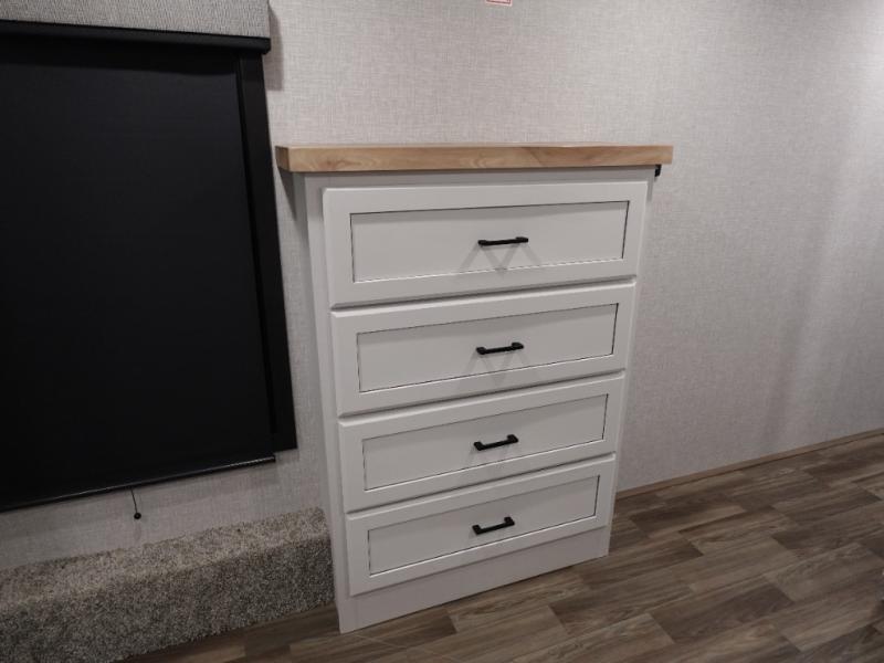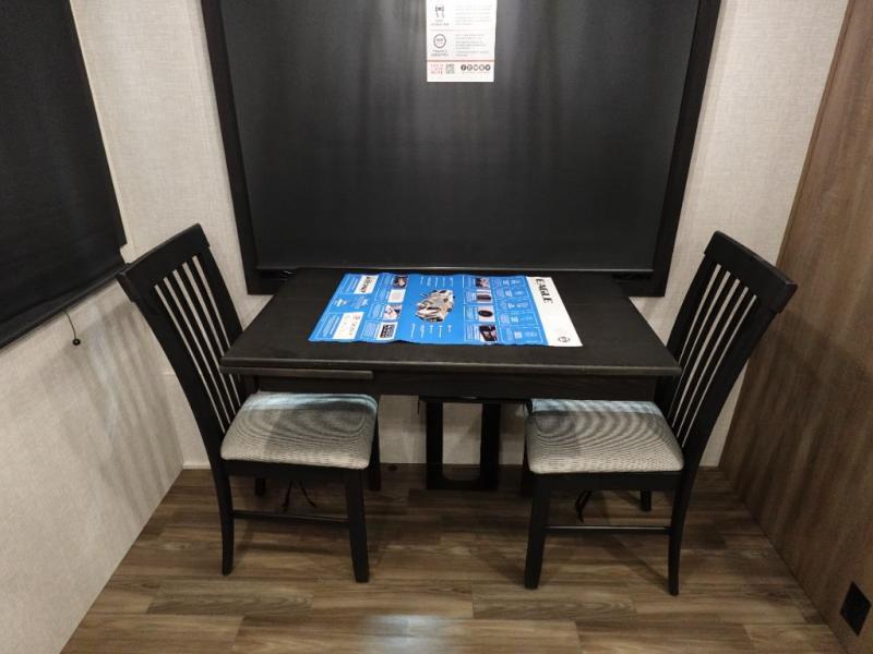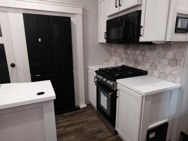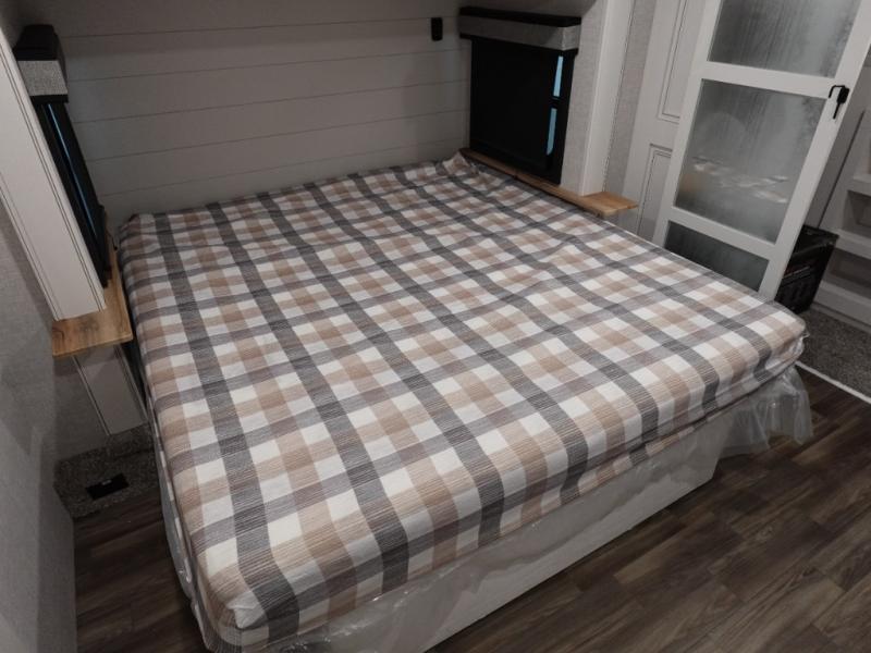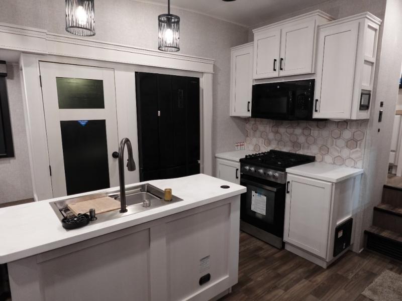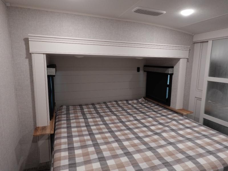 Trips to the lake are made luxurious in this spacious fifth wheel for four! The rear living area includes a tri-fold sofa, a ceiling fan to keep cool, plus theater seats across from the entertainment center and fireplace. You will love the walk-in pantry and 16 cu. ft. 12V refrigerator to store food for the whole week, plus there are overhead cabinets for even more storage. The full bath features a residential style glass shower door, a linen closet, plus a medicine cabinet to keep all your necessities organized. You will feel right at home in the front private bedroom with its king bed slide out, a chest with TV prep plus a walk-in closet with shelves and washer and dryer prep. You can't go wrong with this fifth wheel!