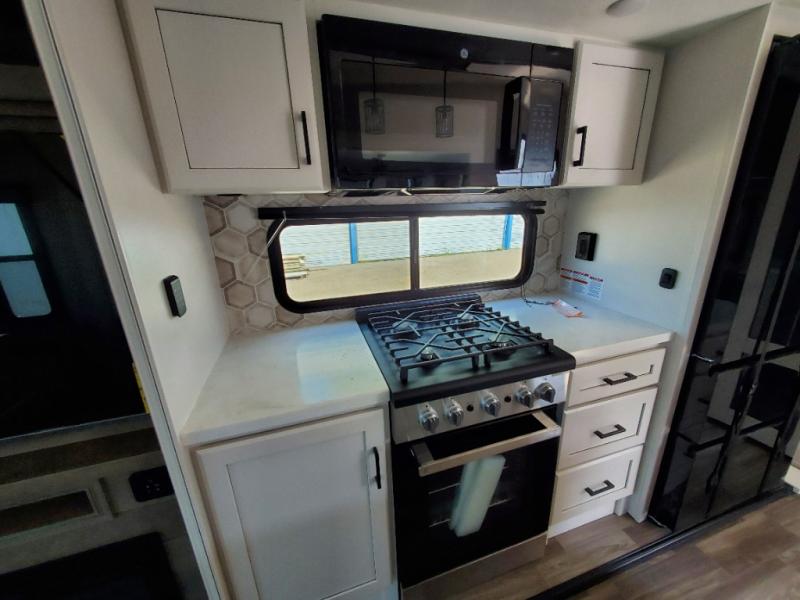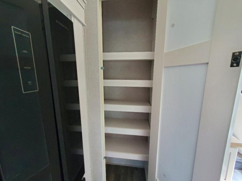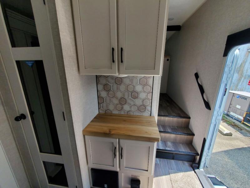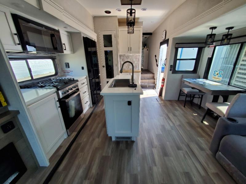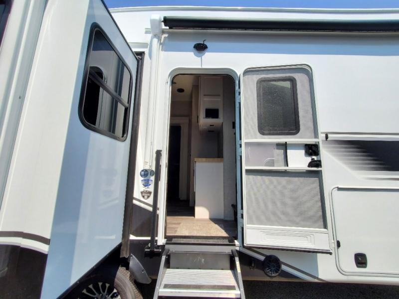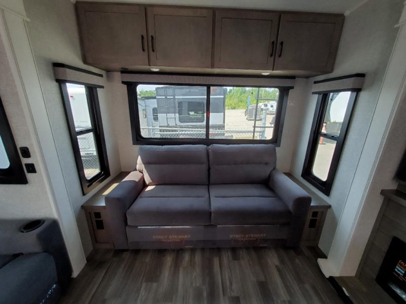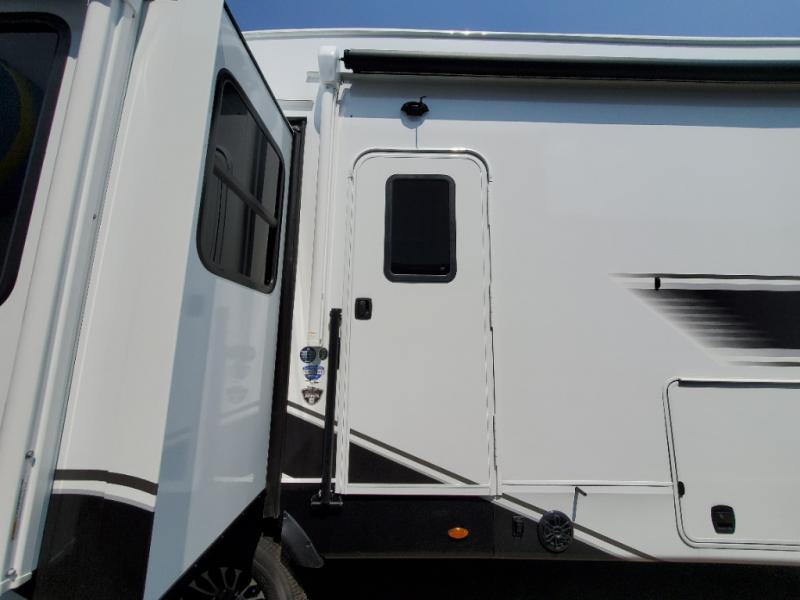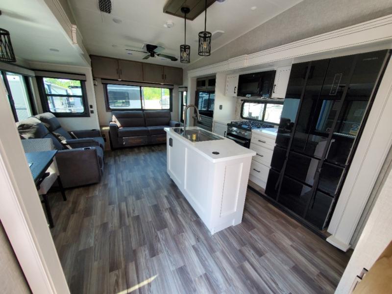 Triple slides for space, plenty of seating spaces, plus a spacious private bedroom make this fifth wheel one you won't want to pass up! You can freshen up each day in the full bath that includes a residential style glass shower door, a bathroom skylight, and a medicine cabinet to keep this space organized. Once you've cut up some fresh fruit at the kitchen island, whip up some eggs and bacon for breakfast, or just grab the cereal from the pantry. There is a spacious 16 cu. ft. 12V refrigerator, plus a hutch where you can store your own coffee machine. Relax on the tri-fold sofa, theater seat, or free-standing table before heading out for the day. The king bed slide out in the front private bedroom will be waiting for you when you return!
