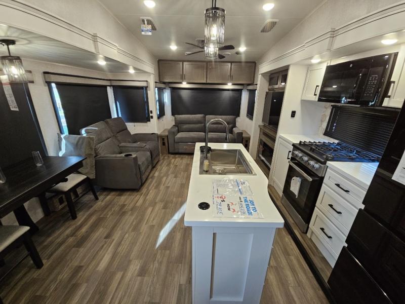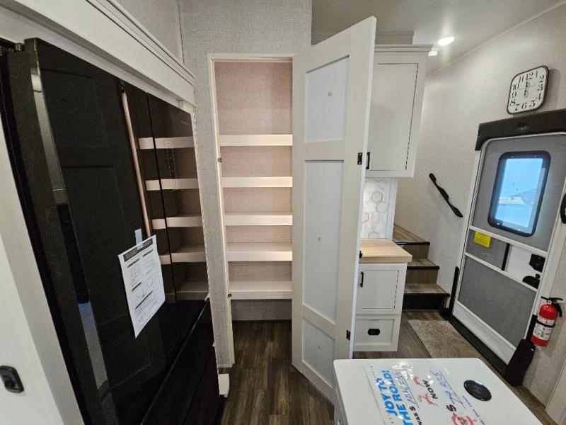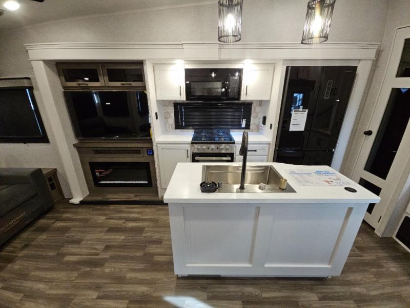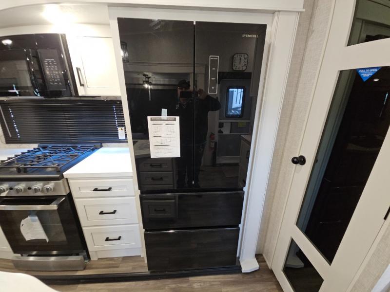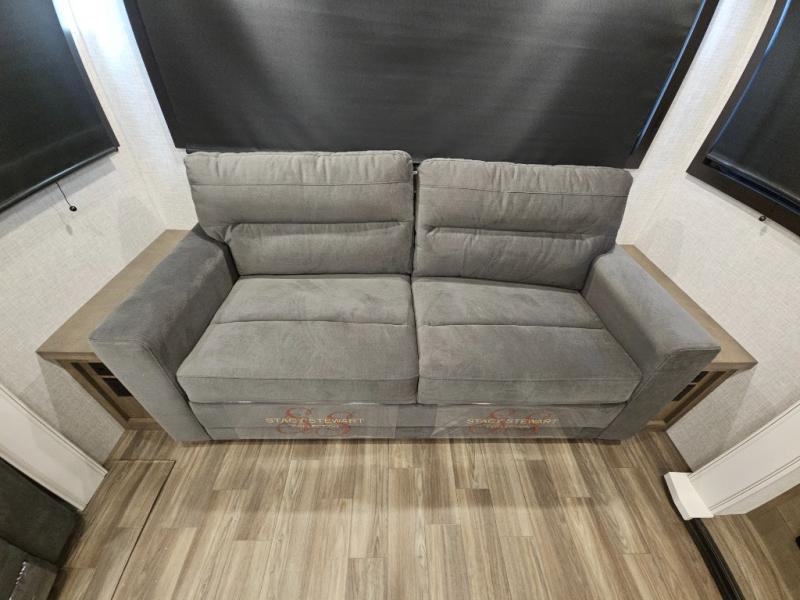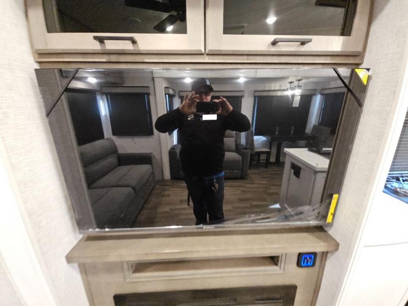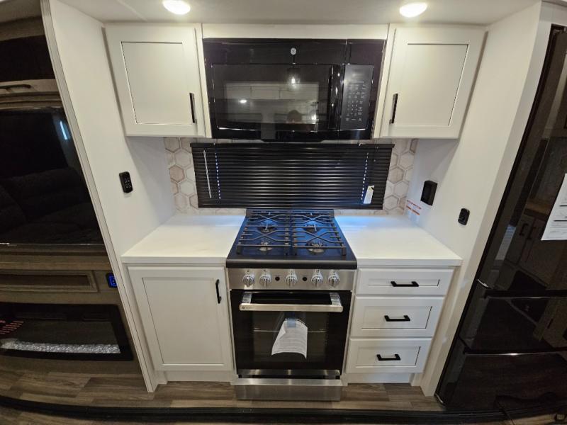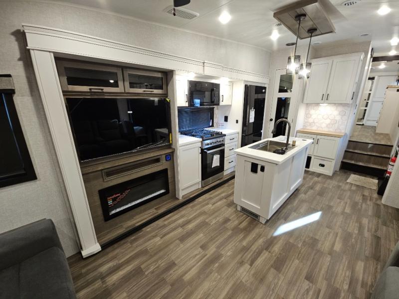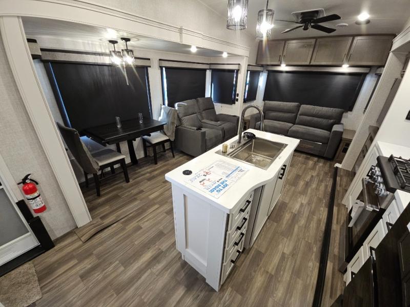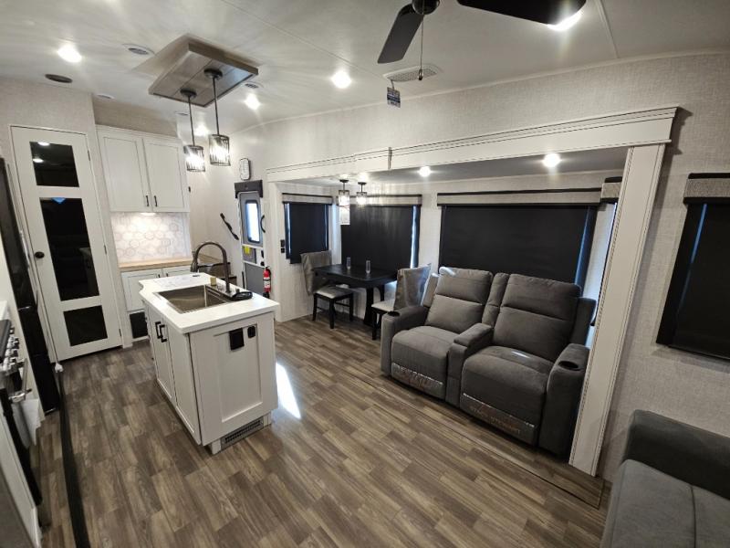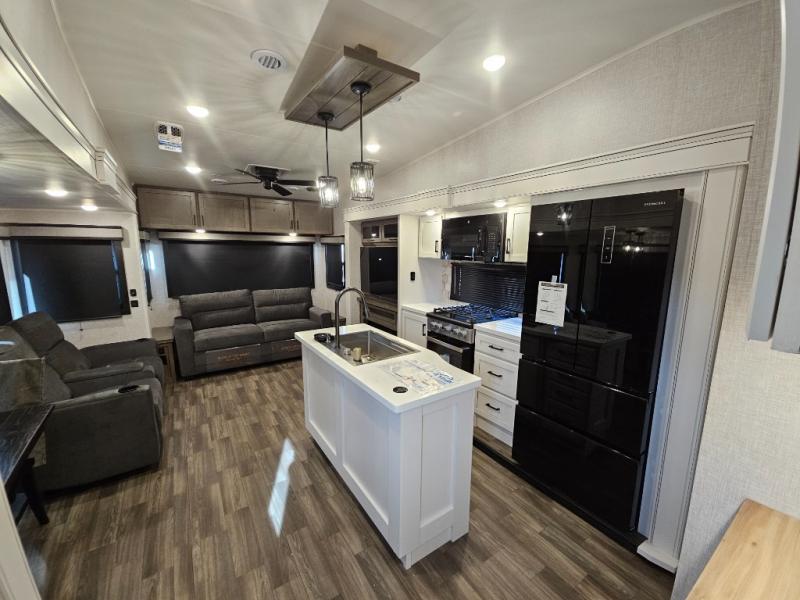 Triple slides for space, plenty of seating spaces, plus a spacious private bedroom make this fifth wheel one you won't want to pass up! You can freshen up each day in the full bath that includes a residential style glass shower door, a bathroom skylight, and a medicine cabinet to keep this space organized. Once you've cut up some fresh fruit at the kitchen island, whip up some eggs and bacon for breakfast, or just grab the cereal from the pantry. There is a spacious 16 cu. ft. 12V refrigerator, plus a hutch where you can store your own coffee machine. Relax on the tri-fold sofa, theater seat, or free-standing table before heading out for the day. The king bed slide out in the front private bedroom will be waiting for you when you return!