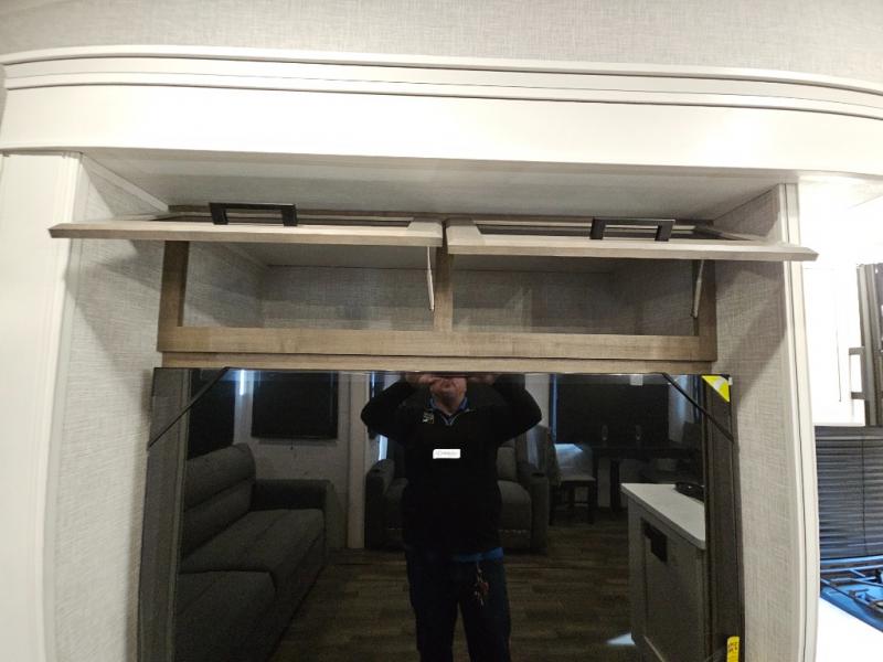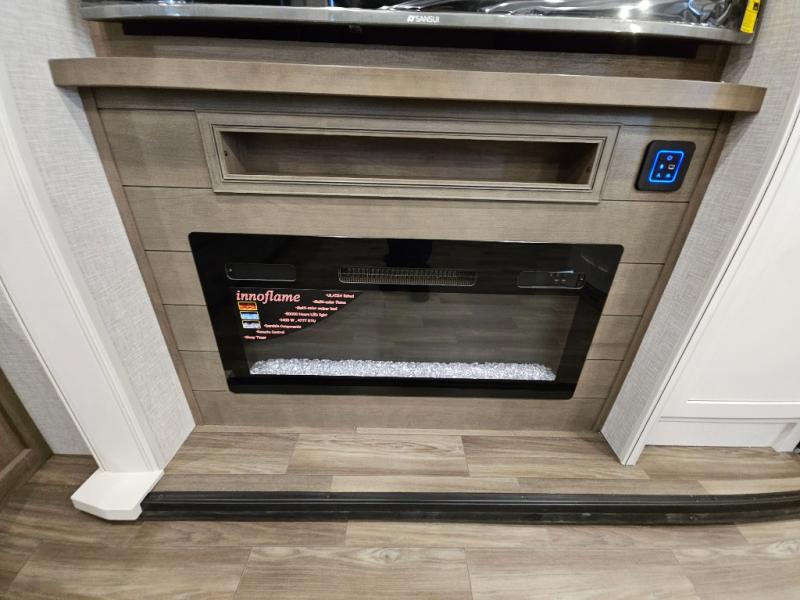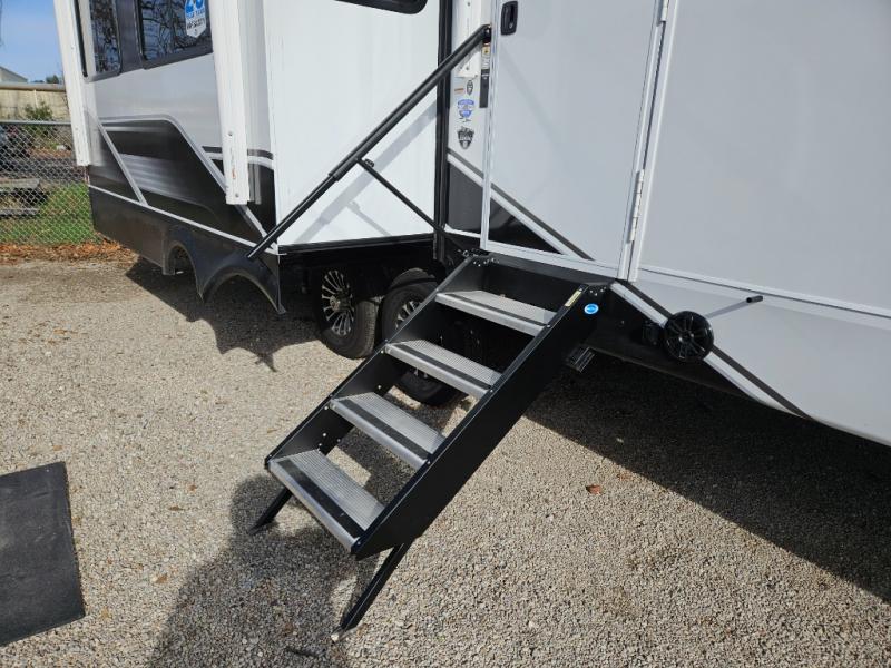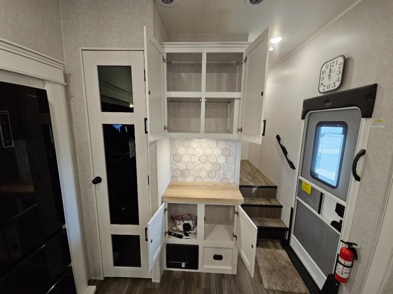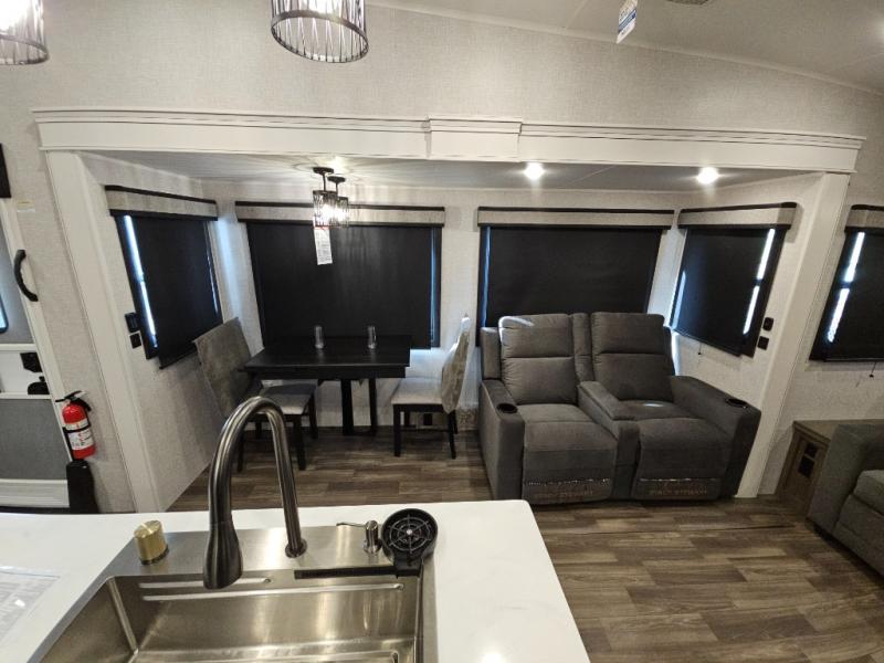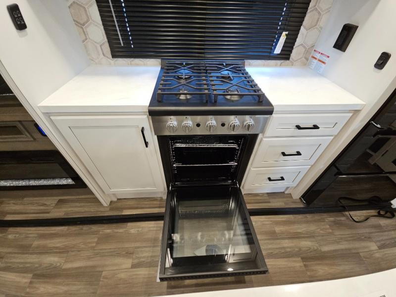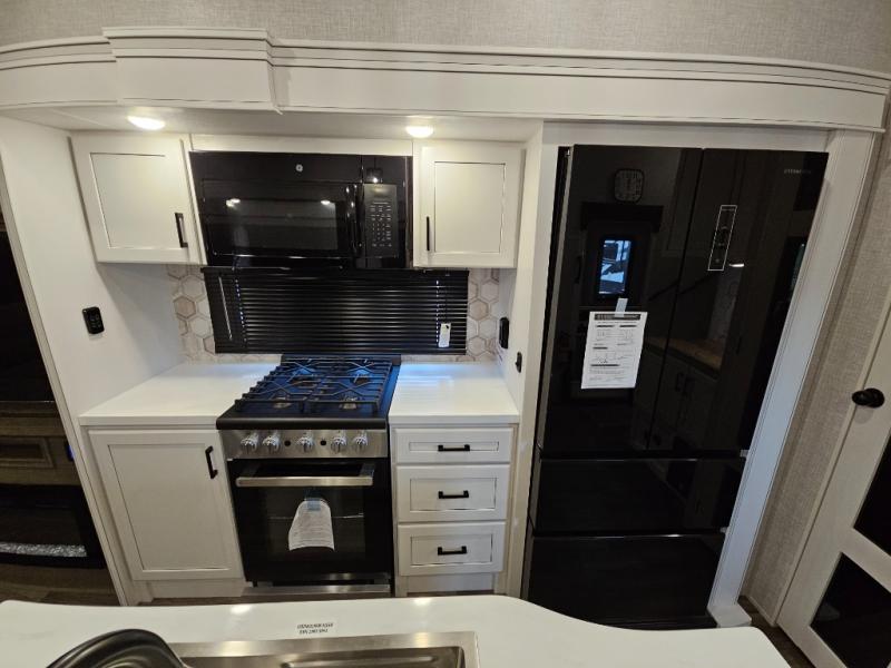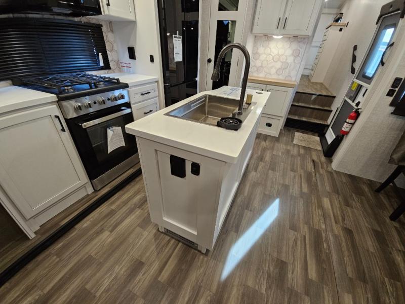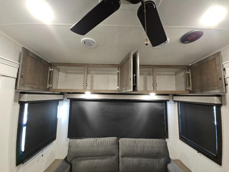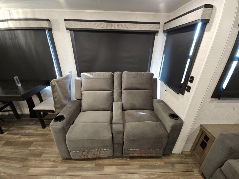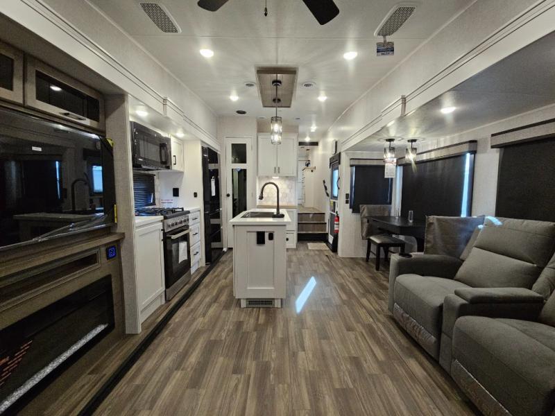 Triple slides for space, plenty of seating spaces, plus a spacious private bedroom make this fifth wheel one you won't want to pass up! You can freshen up each day in the full bath that includes a residential style glass shower door, a bathroom skylight, and a medicine cabinet to keep this space organized. Once you've cut up some fresh fruit at the kitchen island, whip up some eggs and bacon for breakfast, or just grab the cereal from the pantry. There is a spacious 16 cu. ft. 12V refrigerator, plus a hutch where you can store your own coffee machine. Relax on the tri-fold sofa, theater seat, or free-standing table before heading out for the day. The king bed slide out in the front private bedroom will be waiting for you when you return!