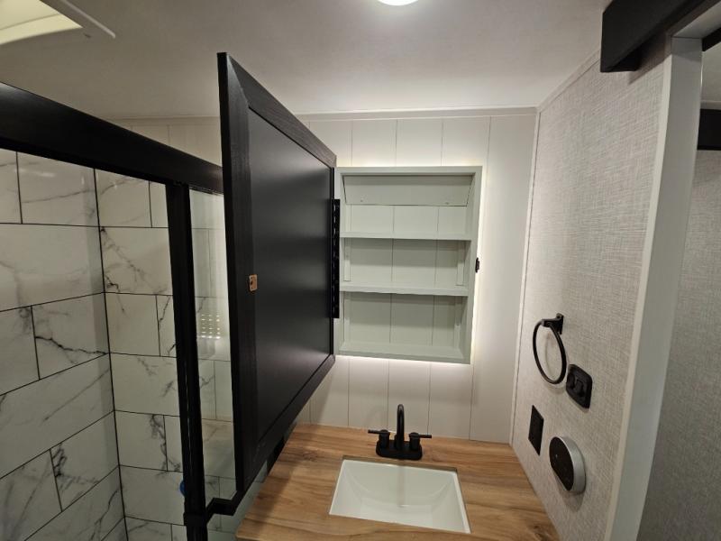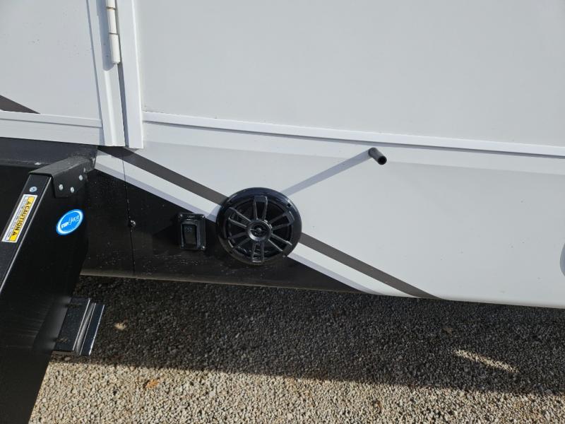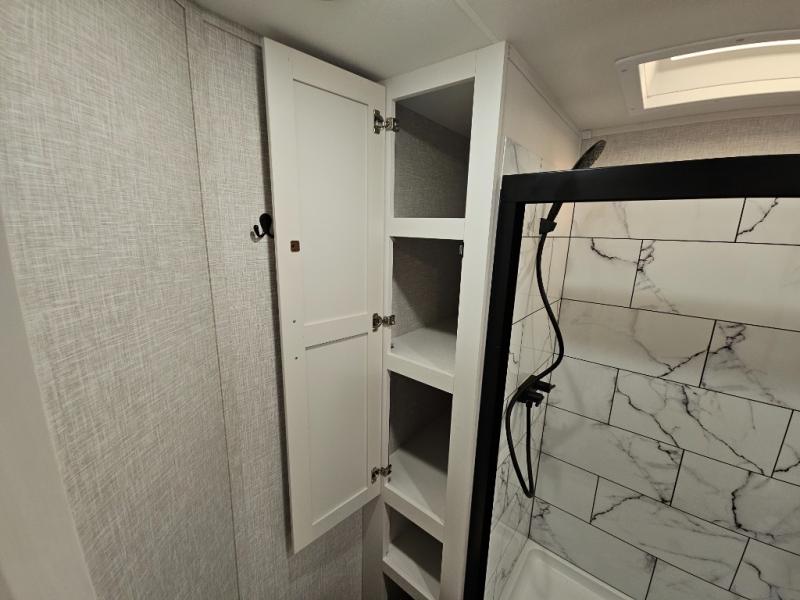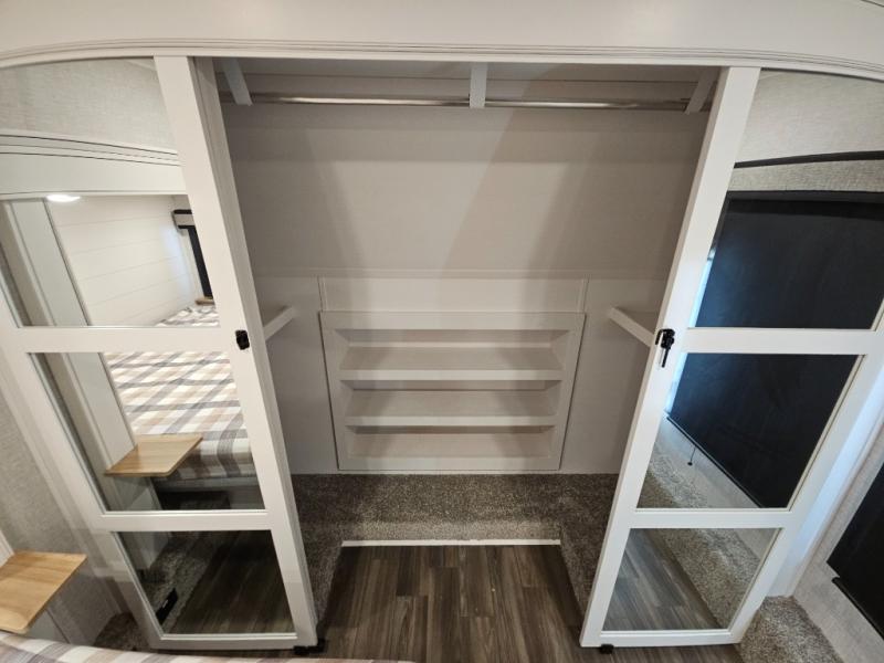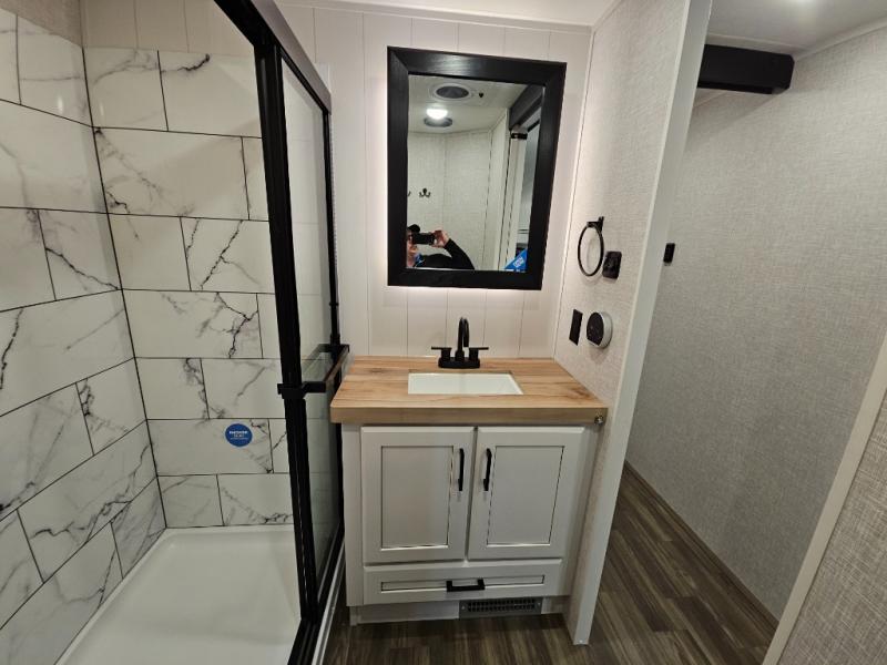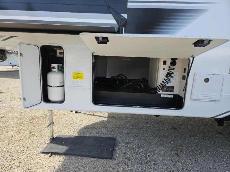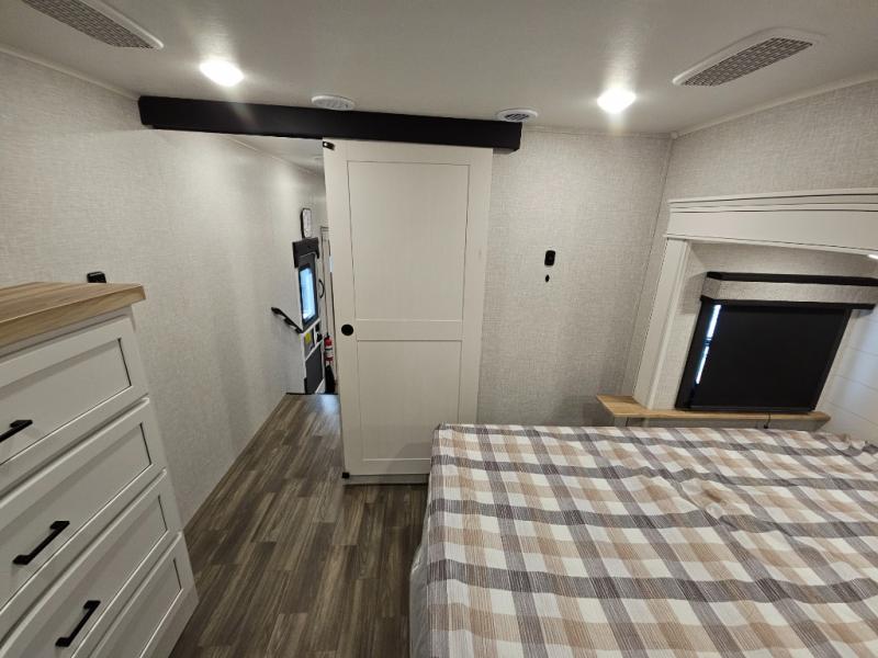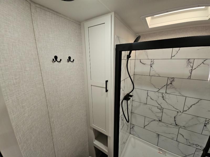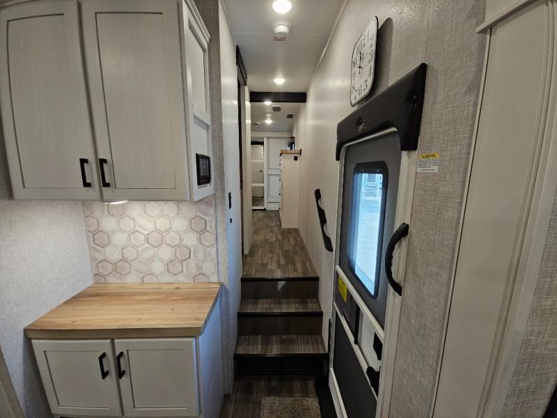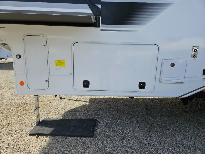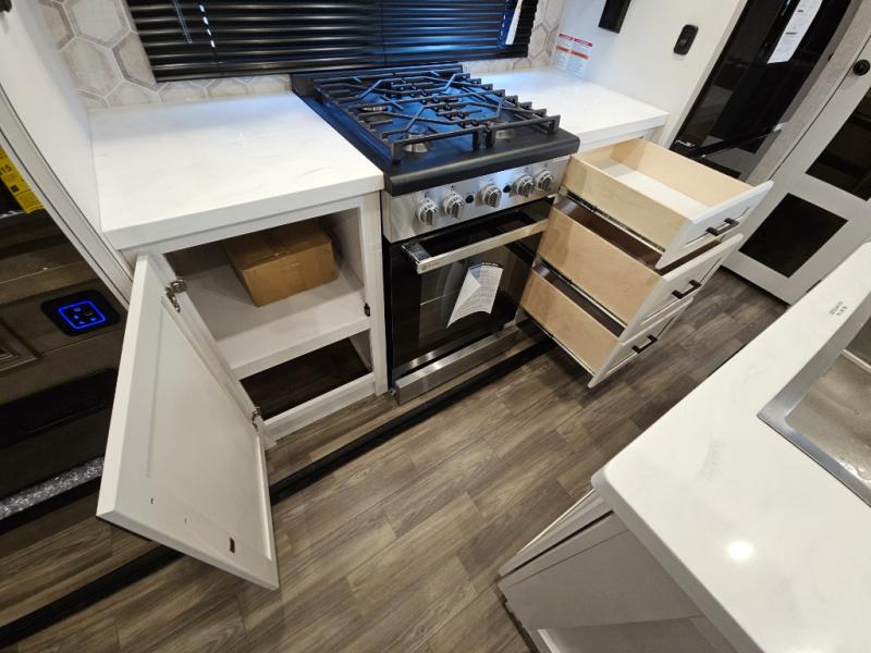 Triple slides for space, plenty of seating spaces, plus a spacious private bedroom make this fifth wheel one you won't want to pass up! You can freshen up each day in the full bath that includes a residential style glass shower door, a bathroom skylight, and a medicine cabinet to keep this space organized. Once you've cut up some fresh fruit at the kitchen island, whip up some eggs and bacon for breakfast, or just grab the cereal from the pantry. There is a spacious 16 cu. ft. 12V refrigerator, plus a hutch where you can store your own coffee machine. Relax on the tri-fold sofa, theater seat, or free-standing table before heading out for the day. The king bed slide out in the front private bedroom will be waiting for you when you return!