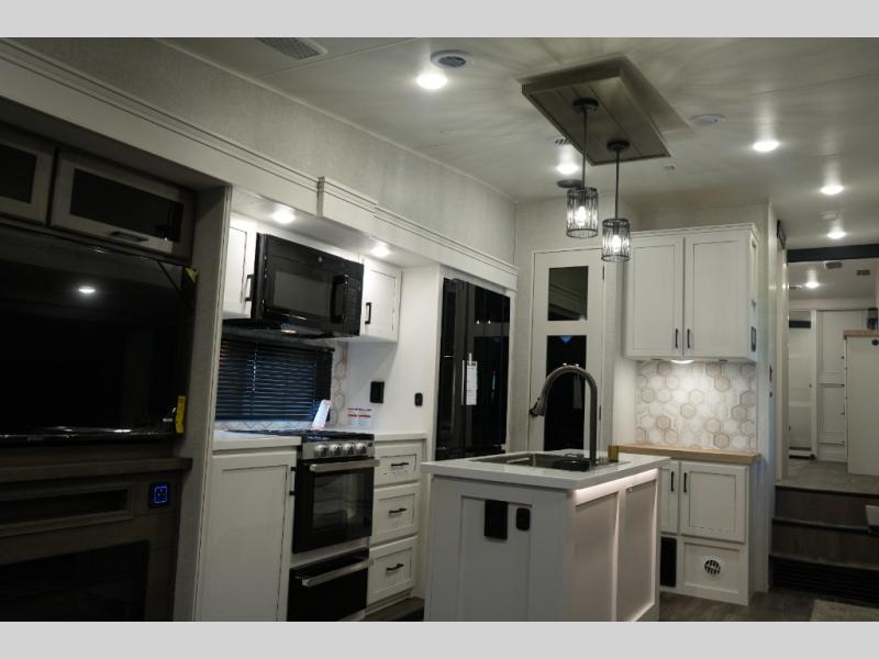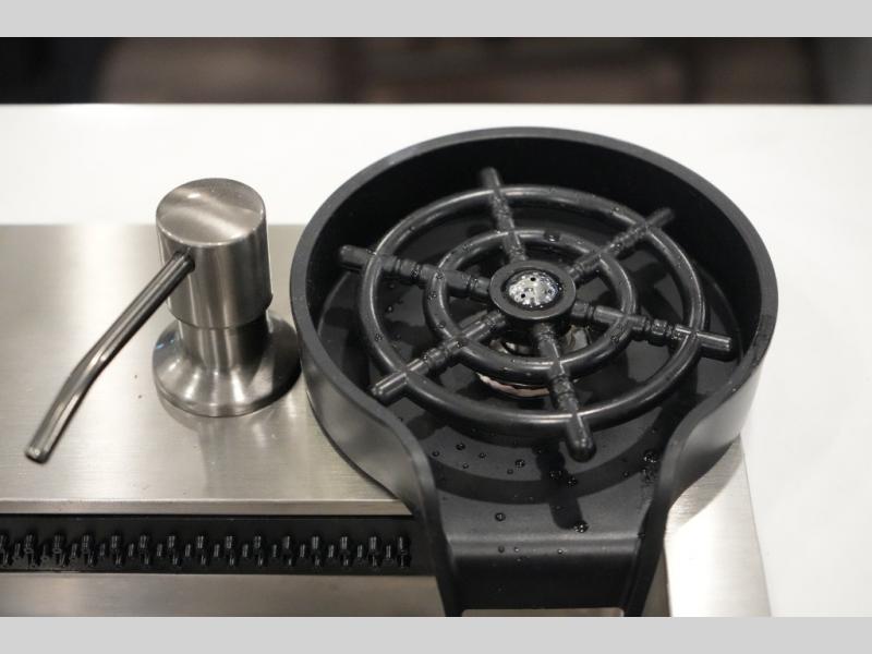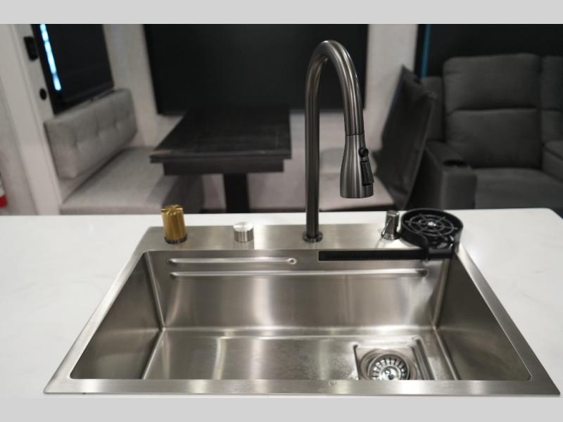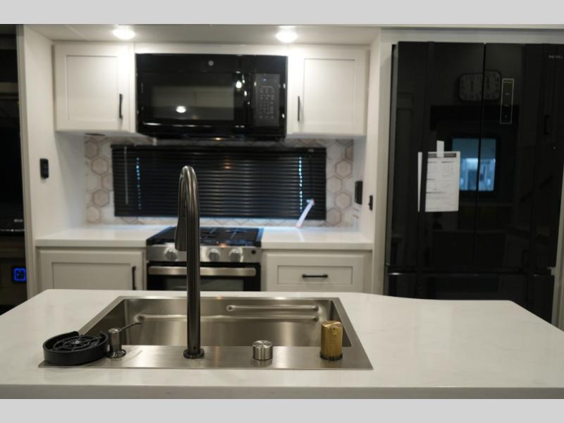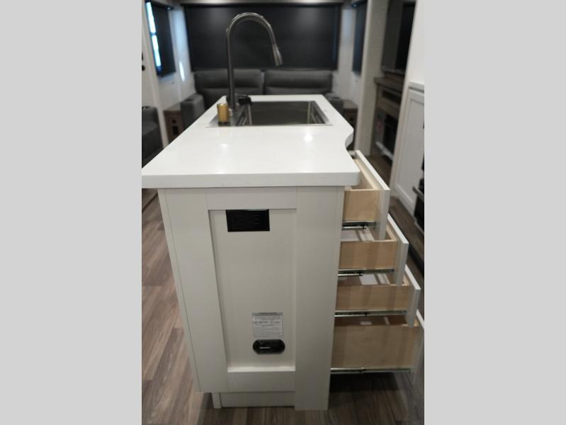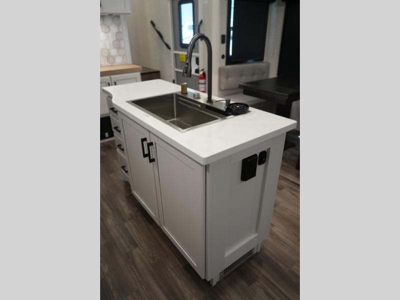 Gourmet Kitchen – Center island, pantry, 16 cu. ft. 12V fridge, hutch, and multi-functional sink
