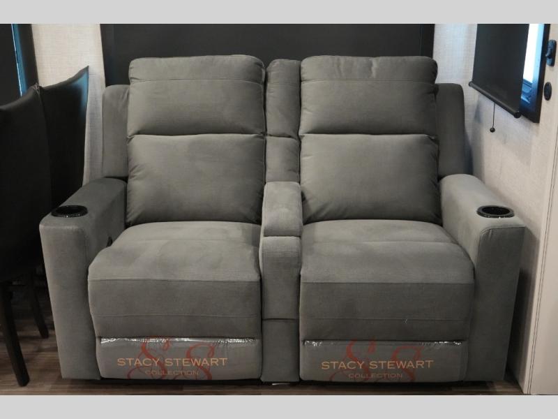 Comfortable Living – Theater seating, tri-fold sofa, ceiling fan, and free-standing table