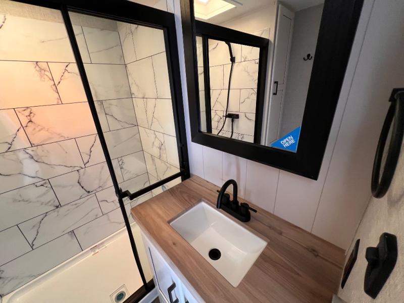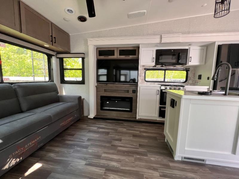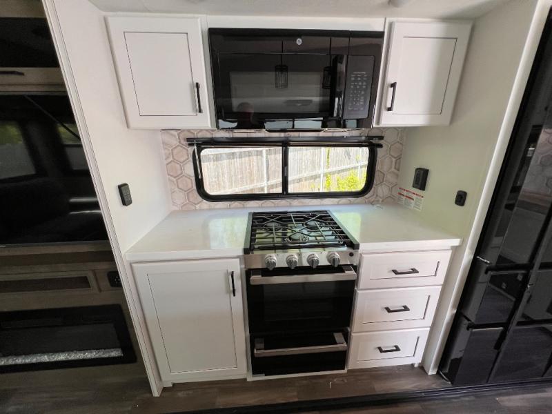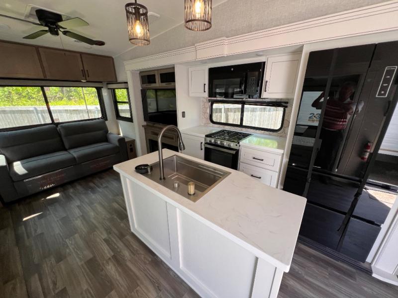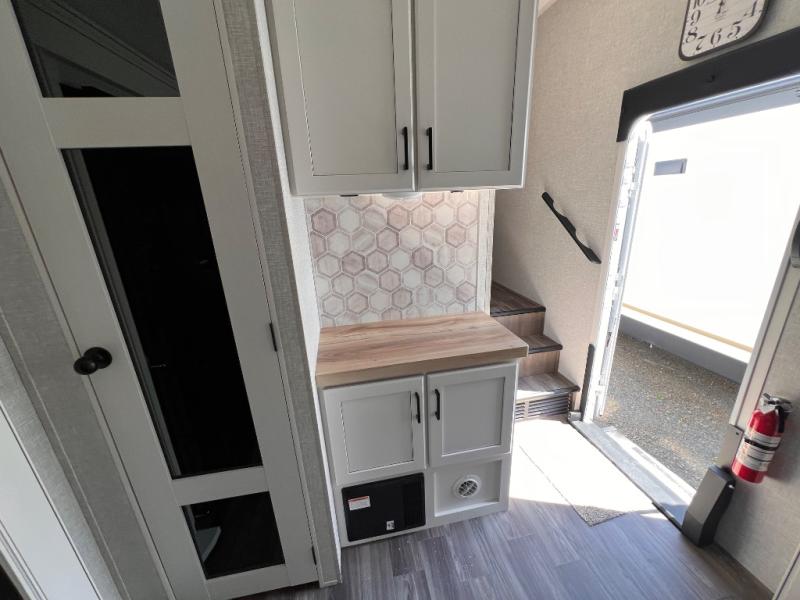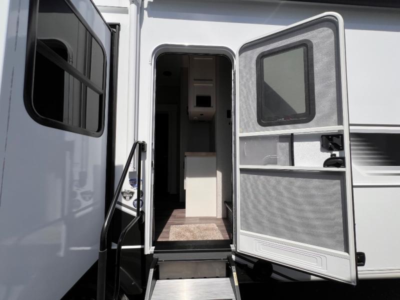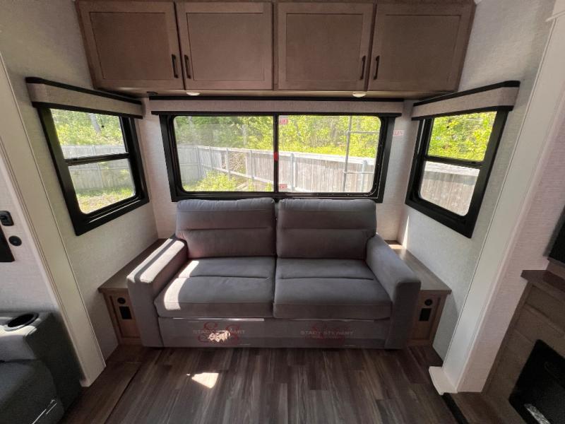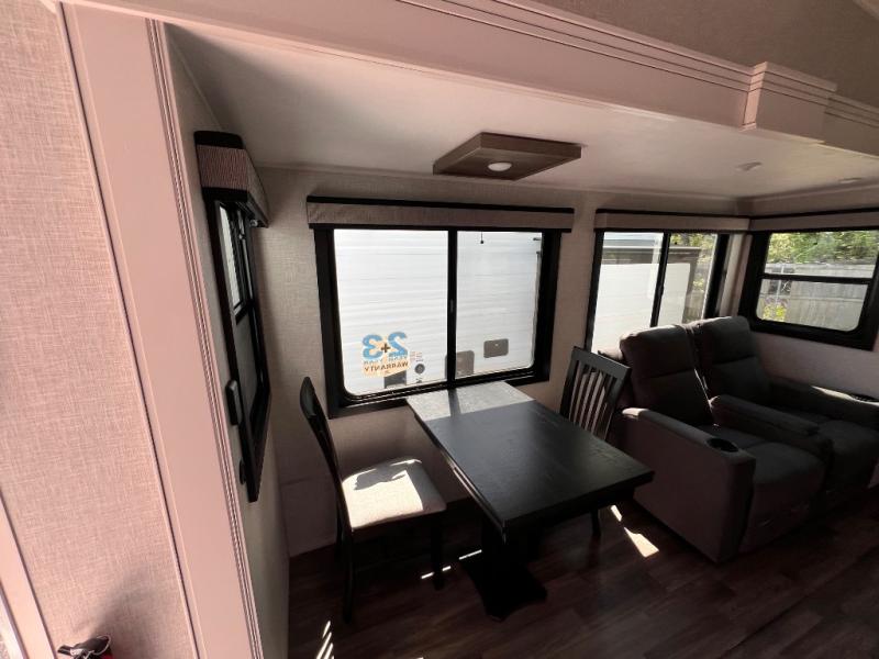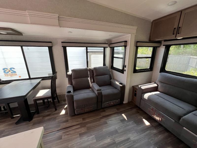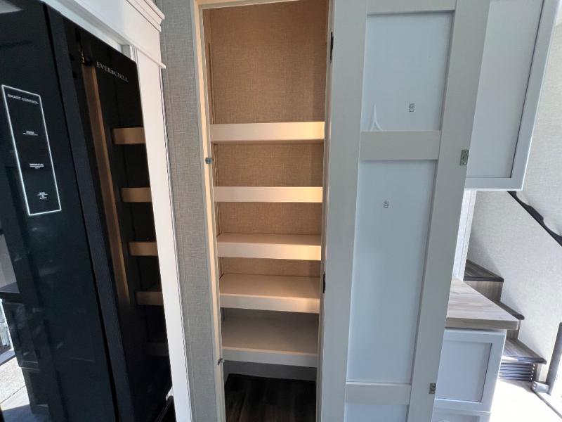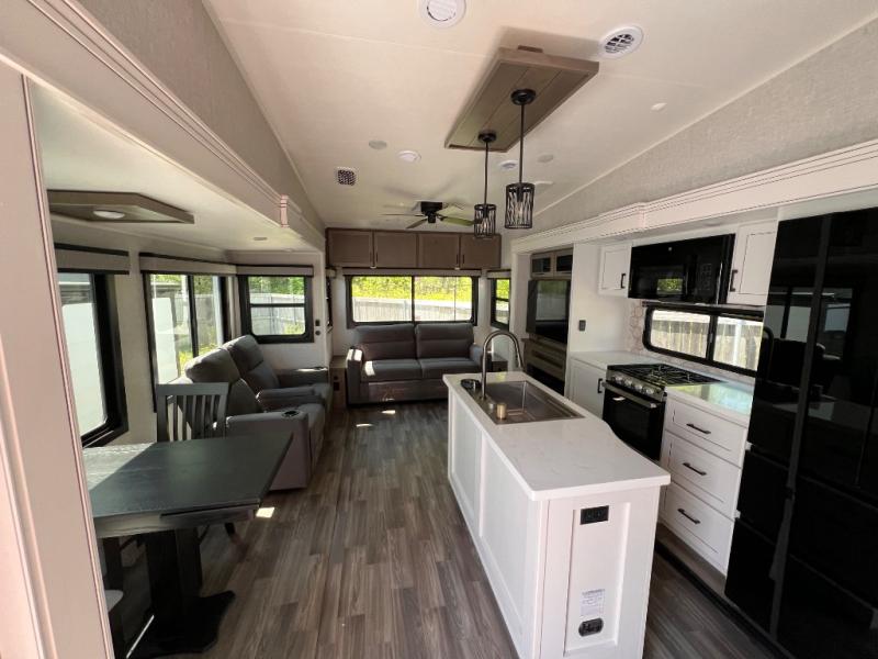 Triple slides for space, plenty of seating spaces, plus a spacious private bedroom make this fifth wheel one you won't want to pass up! You can freshen up each day in the full bath that includes a residential style glass shower door, a bathroom skylight, and a medicine cabinet to keep this space organized. Once you've cut up some fresh fruit at the kitchen island, whip up some eggs and bacon for breakfast, or just grab the cereal from the pantry. There is a spacious 16 cu. ft. 12V refrigerator, plus a hutch where you can store your own coffee machine. Relax on the tri-fold sofa, theater seat, or free-standing table with chairs/bench before heading out for the day. The king bed slide out in the front private bedroom will be waiting for you when you return!
