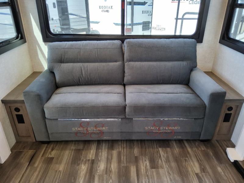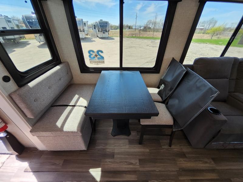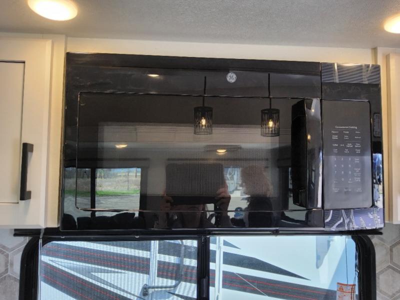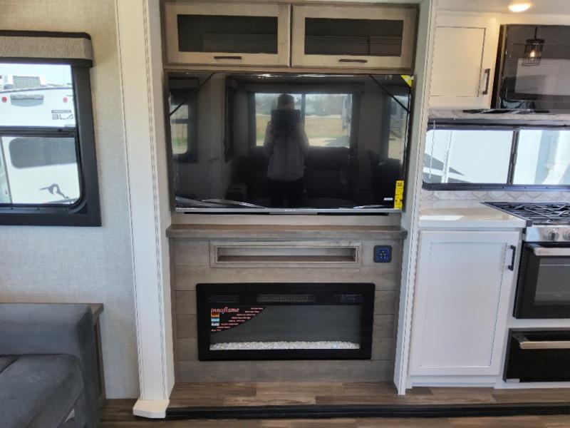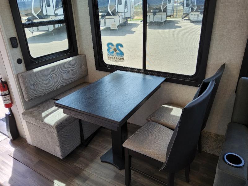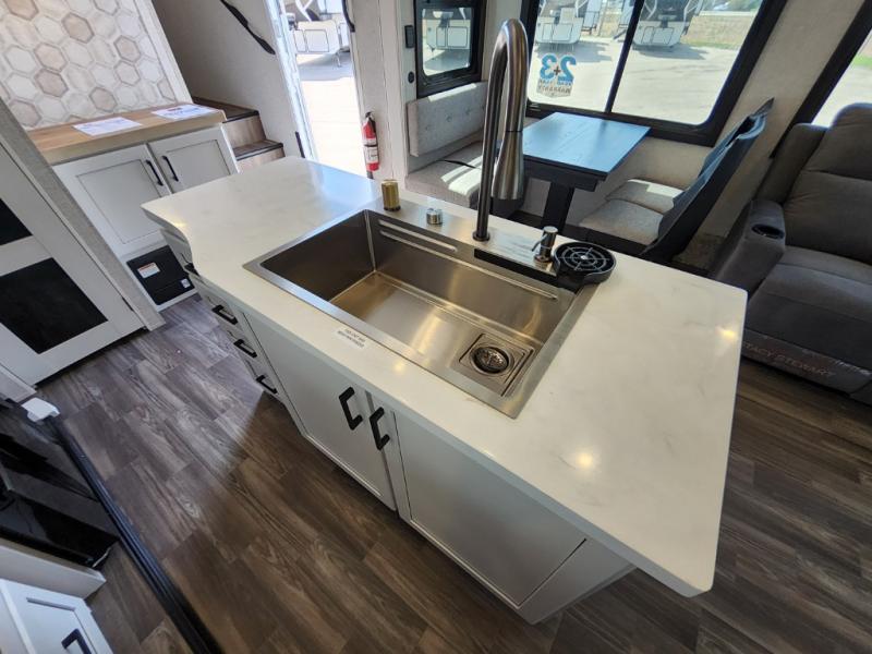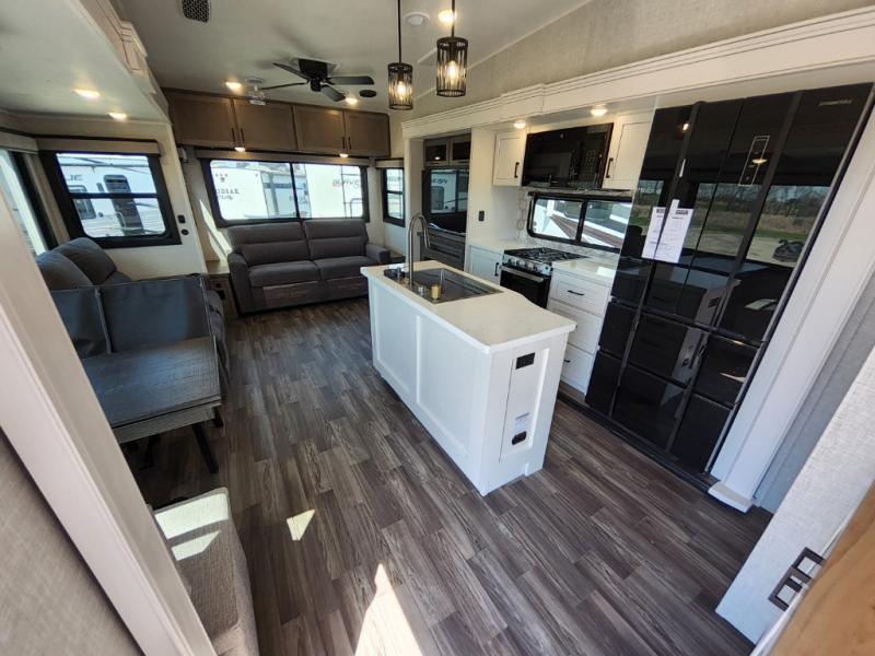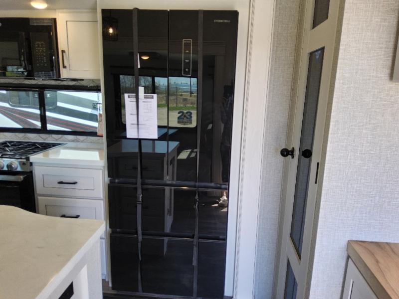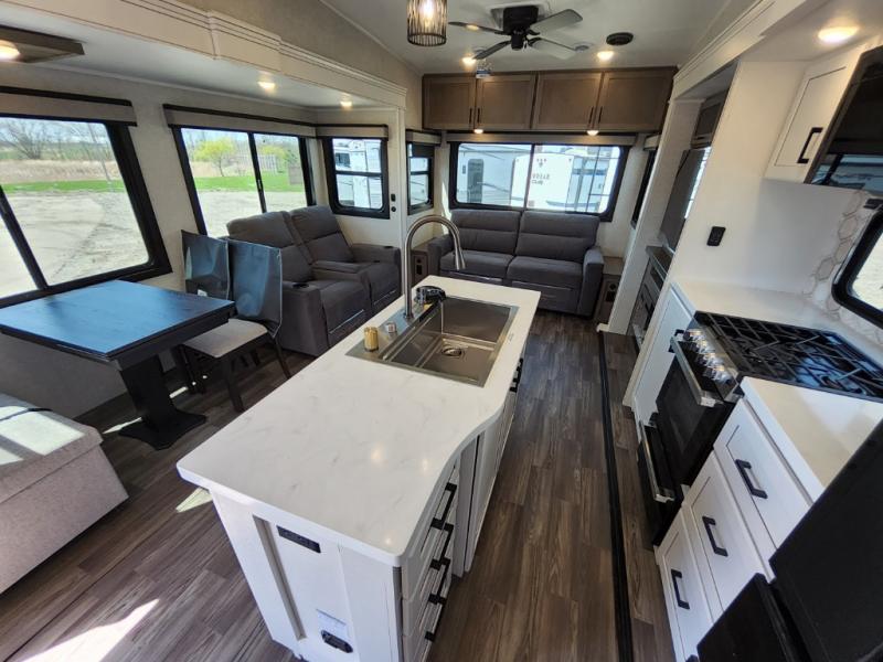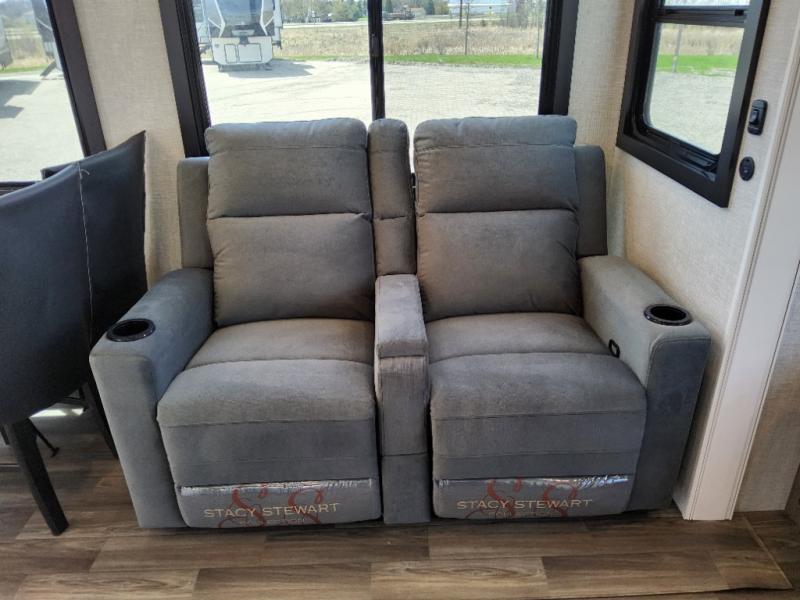 Triple slides for space, plenty of seating spaces, plus a spacious private bedroom make this fifth wheel one you won't want to pass up! You can freshen up each day in the full bath that includes a residential style glass shower door, a bathroom skylight, and a medicine cabinet to keep this space organized. Once you've cut up some fresh fruit at the kitchen island, whip up some eggs and bacon for breakfast, or just grab the cereal from the pantry. There is a spacious 16 cu. ft. 12V refrigerator, plus a hutch where you can store your own coffee machine. Relax on the tri-fold sofa, theater seat, or free-standing table before heading out for the day. The king bed slide out in the front private bedroom will be waiting for you when you return!