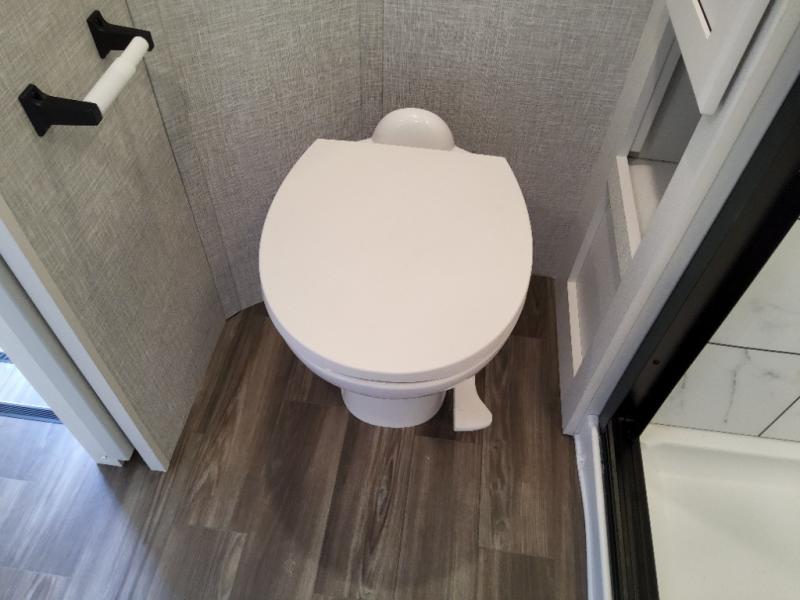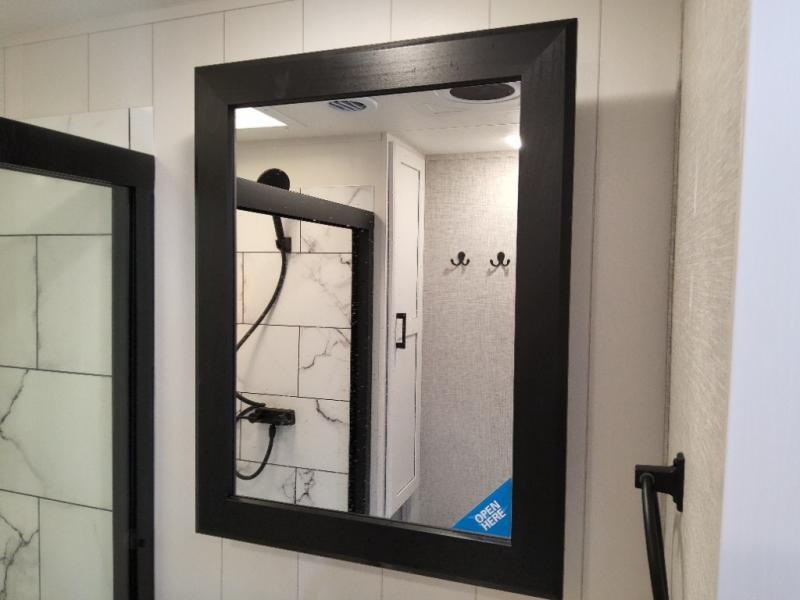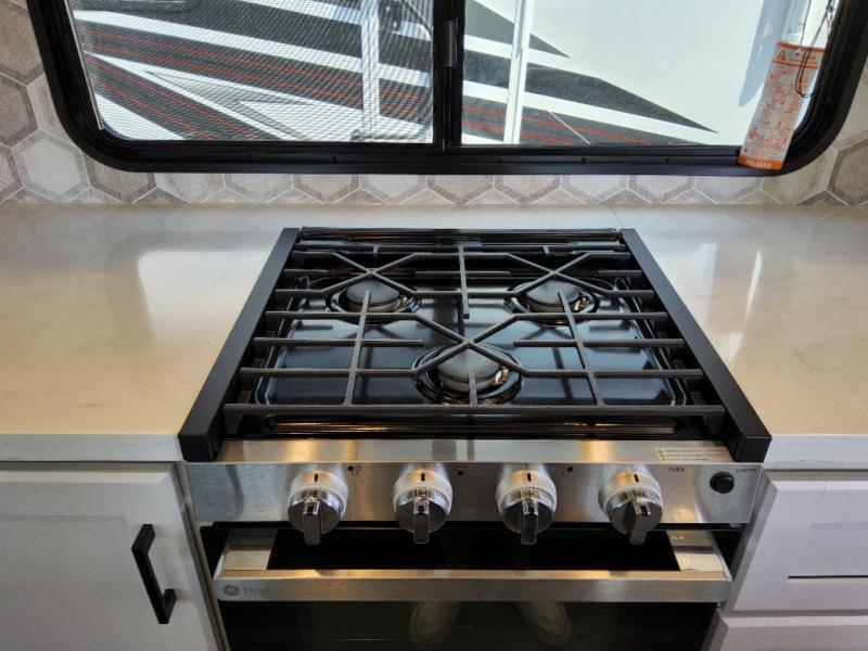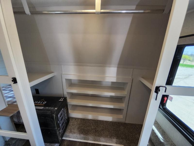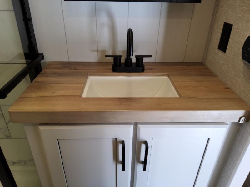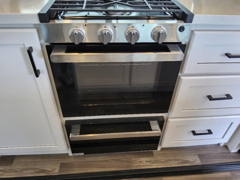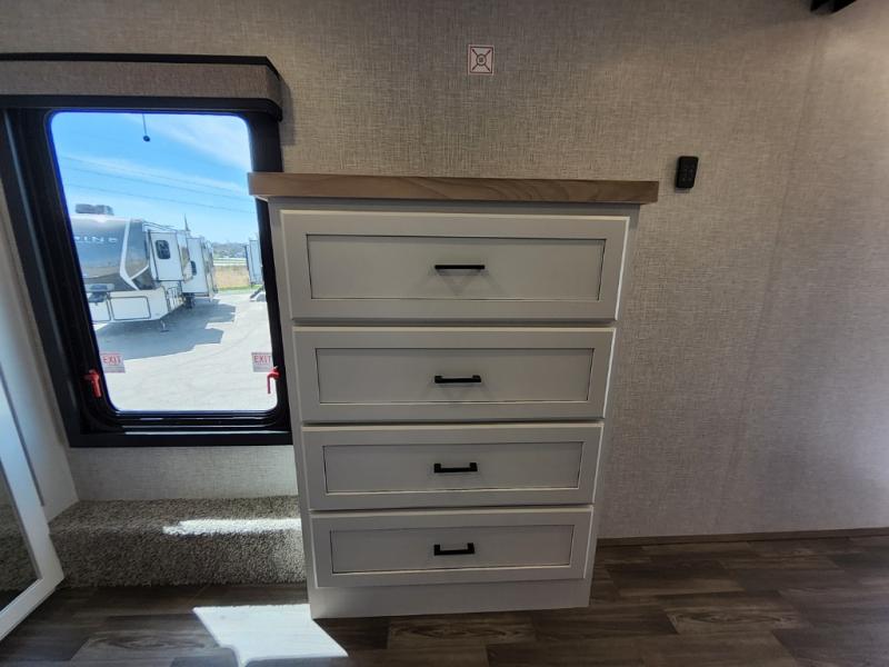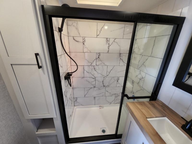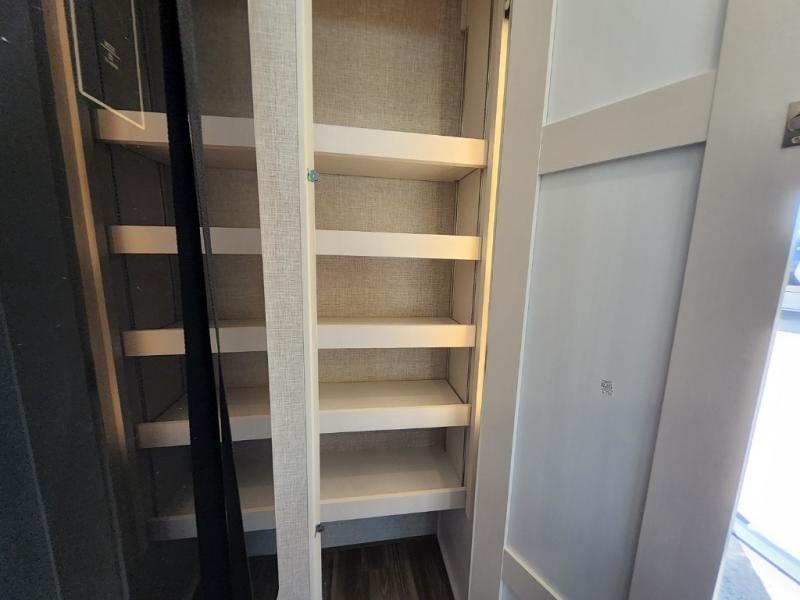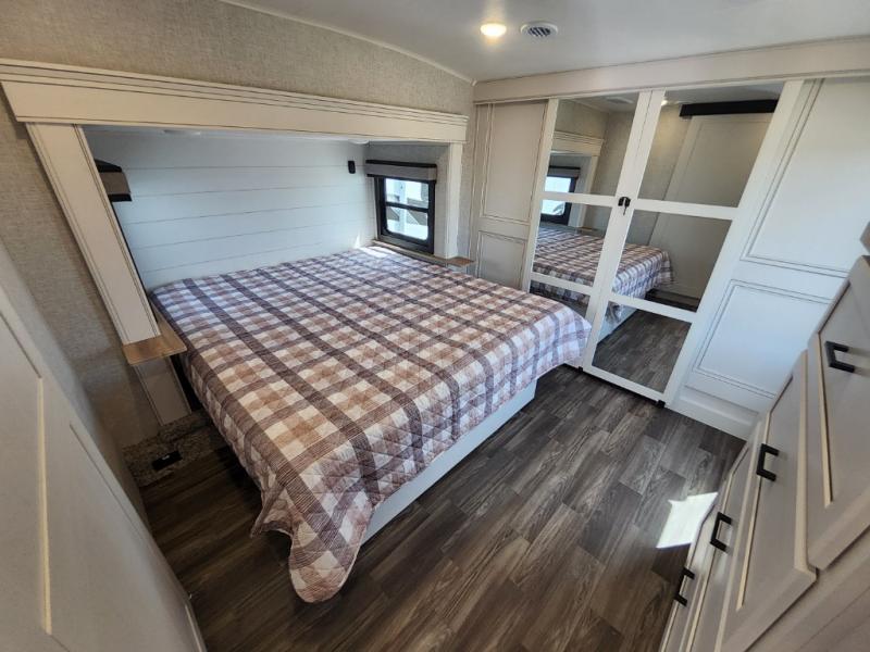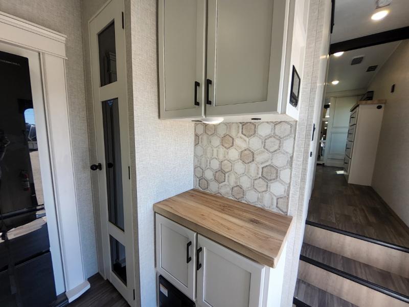 Triple slides for space, plenty of seating spaces, plus a spacious private bedroom make this fifth wheel one you won't want to pass up! You can freshen up each day in the full bath that includes a residential style glass shower door, a bathroom skylight, and a medicine cabinet to keep this space organized. Once you've cut up some fresh fruit at the kitchen island, whip up some eggs and bacon for breakfast, or just grab the cereal from the pantry. There is a spacious 16 cu. ft. 12V refrigerator, plus a hutch where you can store your own coffee machine. Relax on the tri-fold sofa, theater seat, or free-standing table before heading out for the day. The king bed slide out in the front private bedroom will be waiting for you when you return!