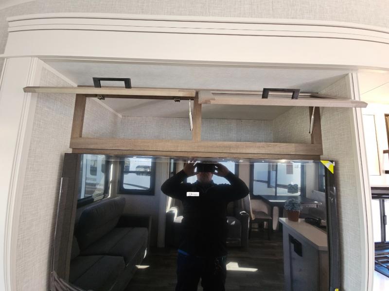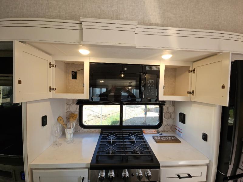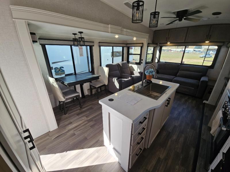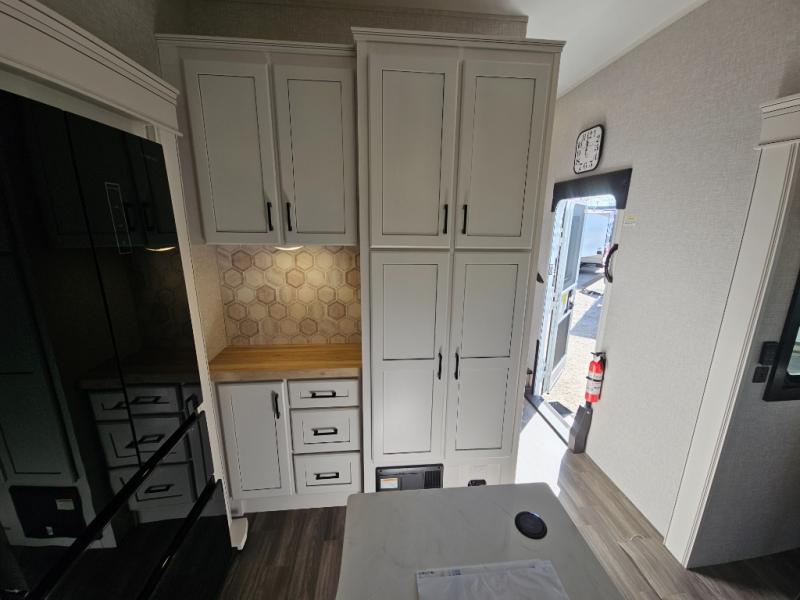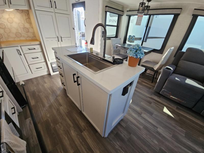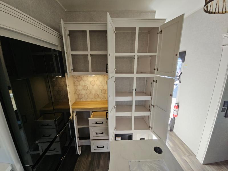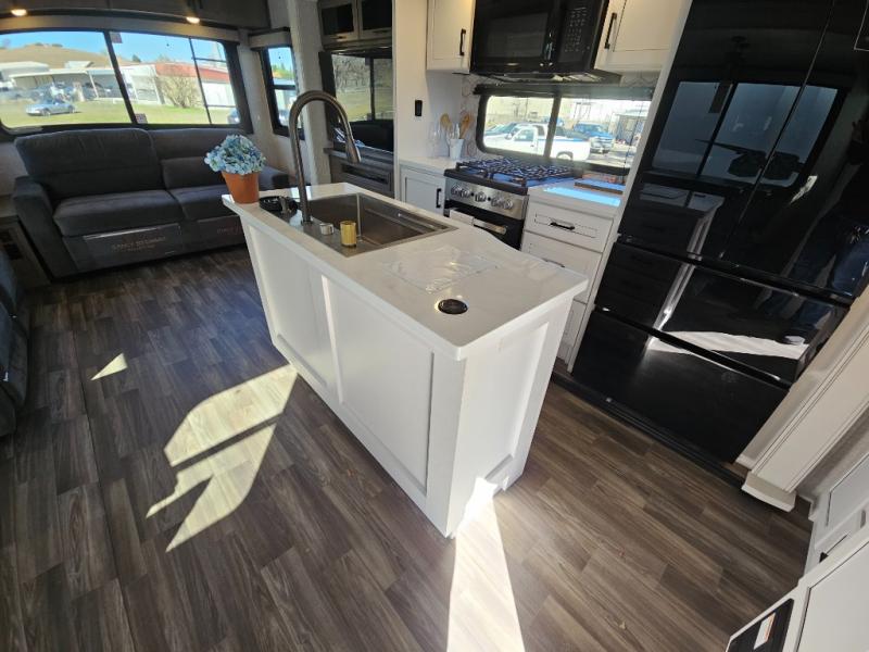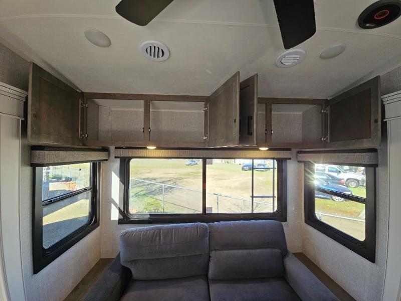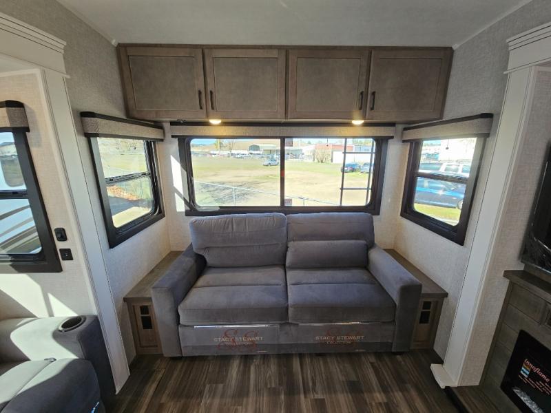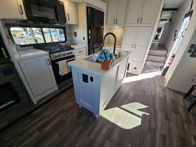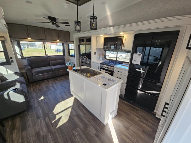 This fifth wheel with four slides is one your whole crew will love! There is a middle bedroom/den with a tri-fold sofa and a desk, allowing this room to become an office if you need it. The loft above this room will be a big hit with the little ones, and the full bath is centrally located so everyone can use it easily. You will have the front private bedroom all to yourselves with a king bed slide out, a chest with TV prep, plus washer and dryer prep in the walk-in closet. The main living area includes everything you need to relax in comfort, like the theater seats, tri-fold sofa, and entertainment center with a fireplace. The chef will enjoy the extra counter space provided by the kitchen island, and there is plenty of storage with the pantry, hutch, and 16 cu. ft. 12V refrigerator. This model even has an outside kitchen, two power awnings, and outside storage for all your gear!