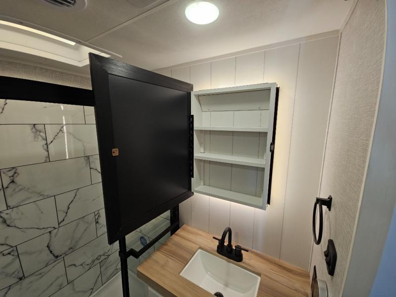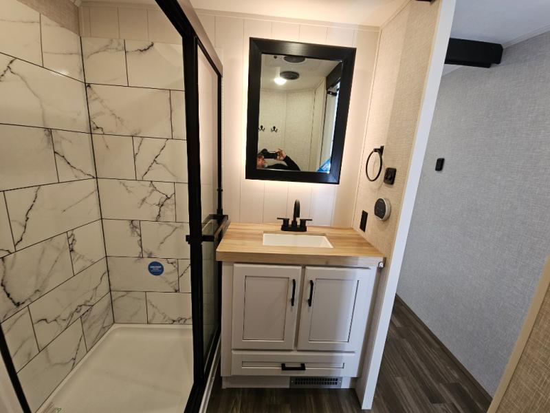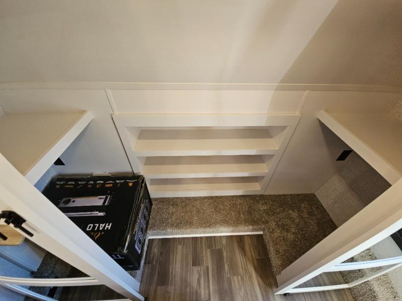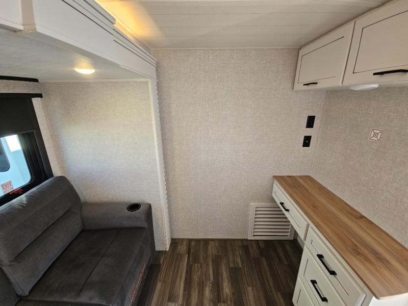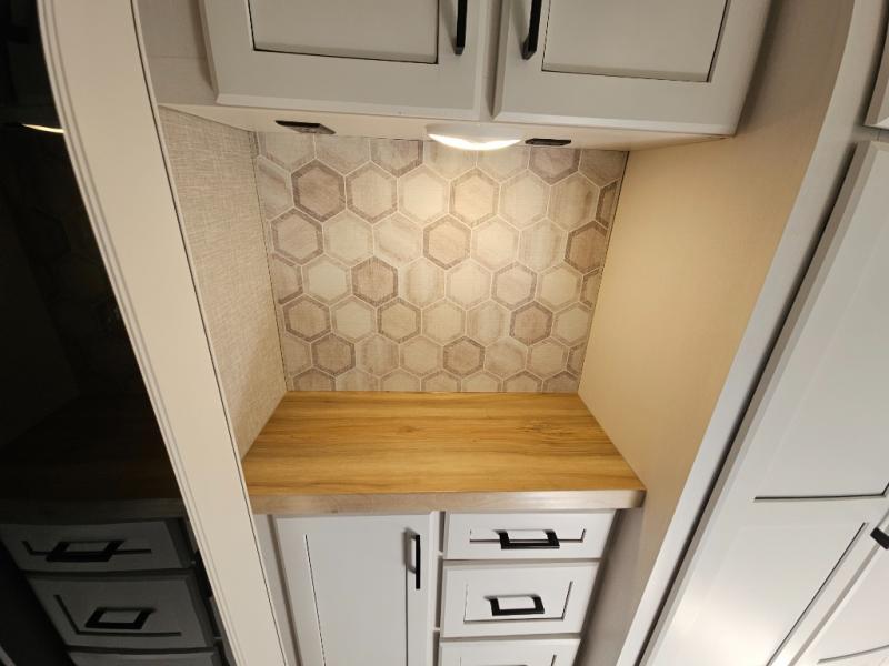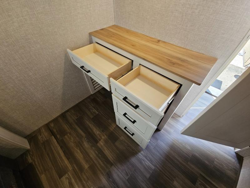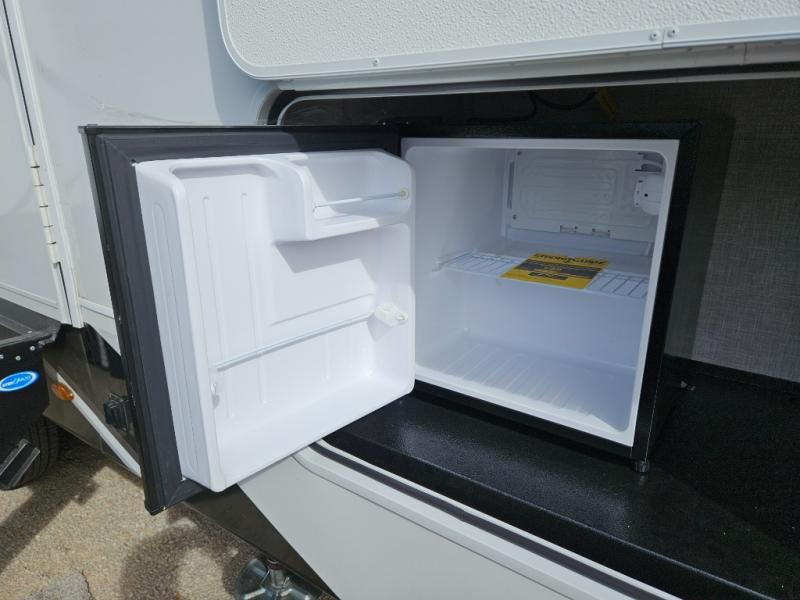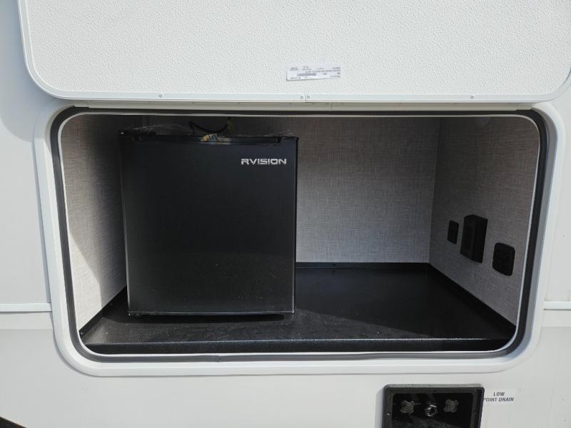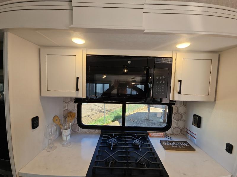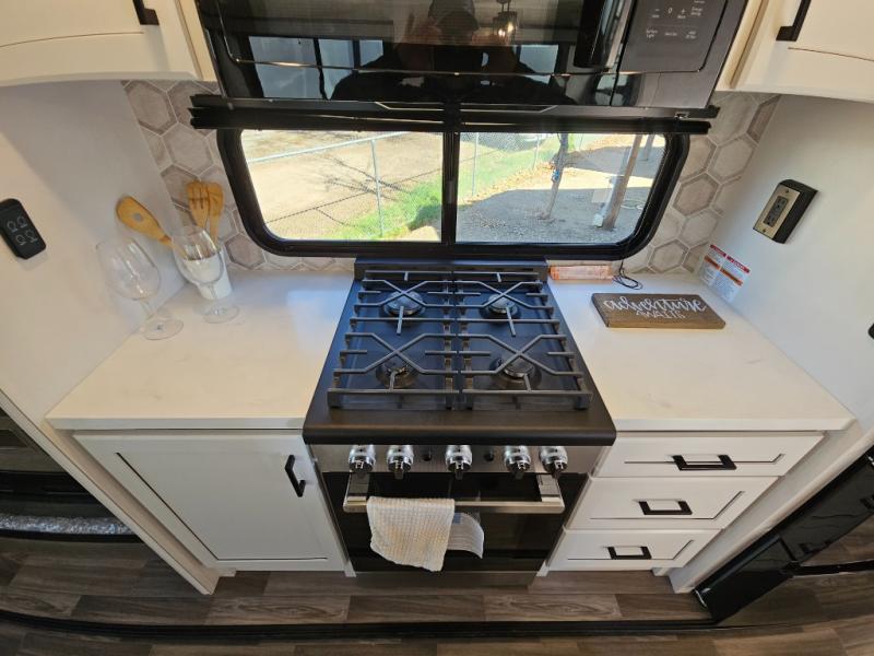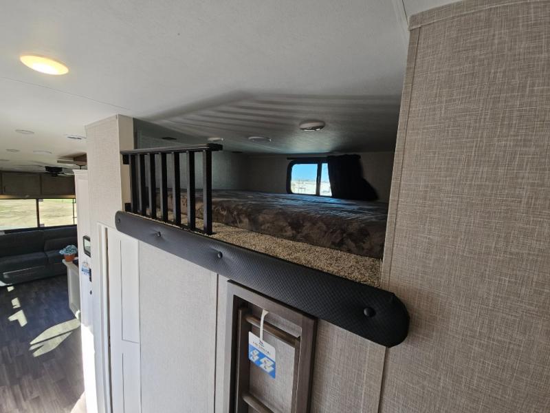 This fifth wheel with four slides is one your whole crew will love! There is a middle bedroom/den with a tri-fold sofa and a desk, allowing this room to become an office if you need it. The loft above this room will be a big hit with the little ones, and the full bath is centrally located so everyone can use it easily. You will have the front private bedroom all to yourselves with a king bed slide out, a chest with TV prep, plus washer and dryer prep in the walk-in closet. The main living area includes everything you need to relax in comfort, like the theater seats, tri-fold sofa, and entertainment center with a fireplace. The chef will enjoy the extra counter space provided by the kitchen island, and there is plenty of storage with the pantry, hutch, and 16 cu. ft. 12V refrigerator. This model even has an outside kitchen, two power awnings, and outside storage for all your gear!