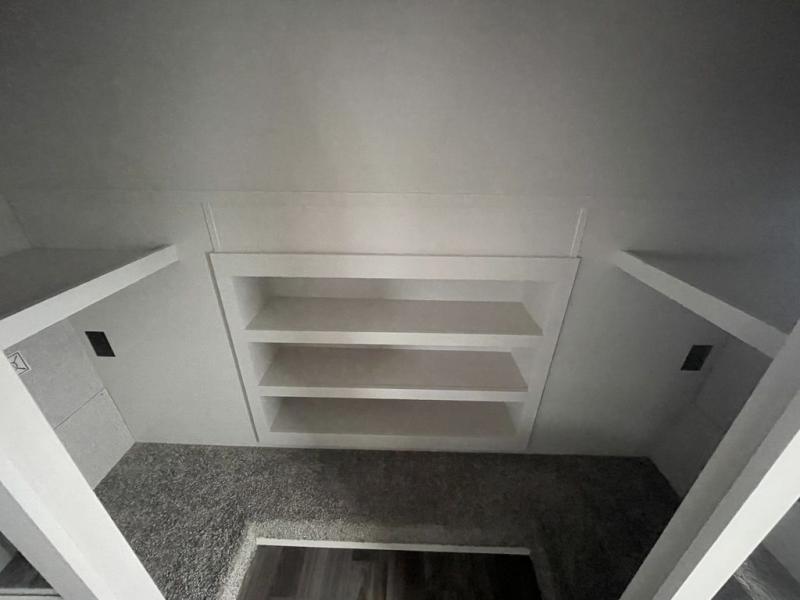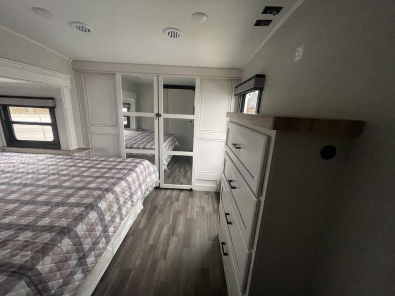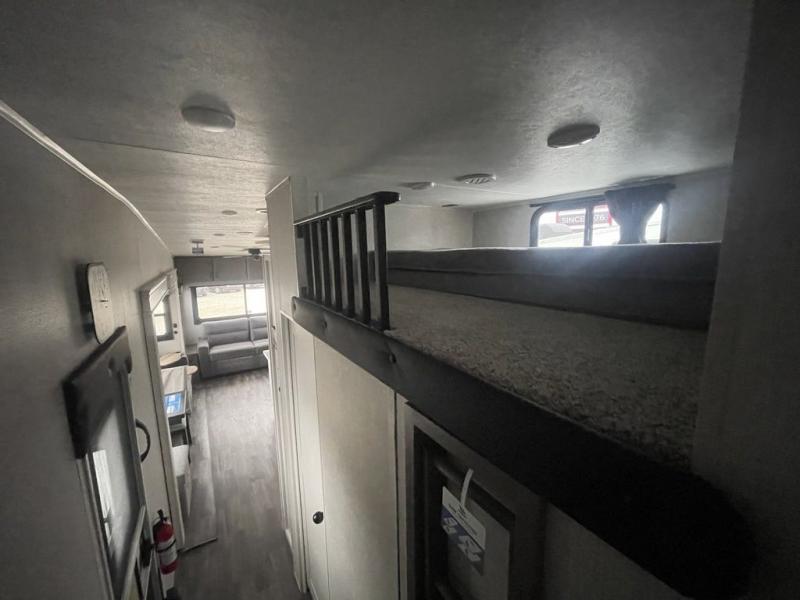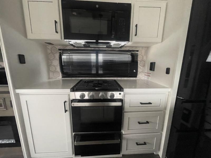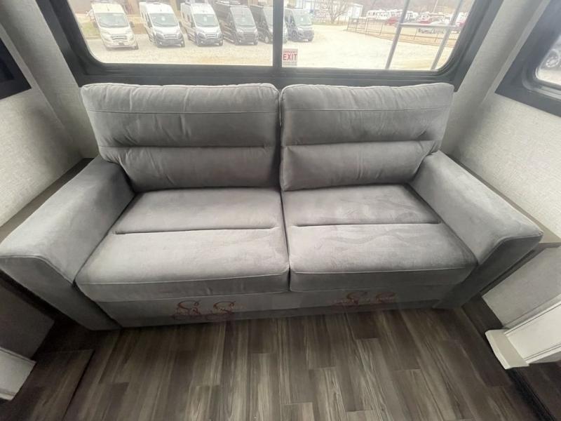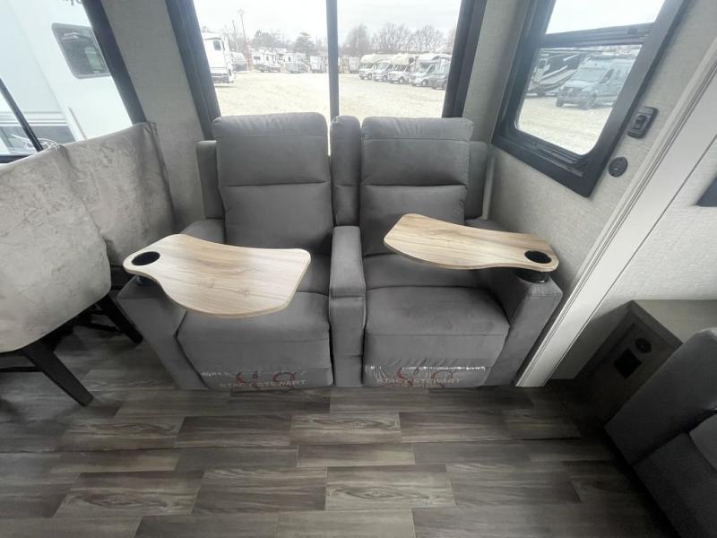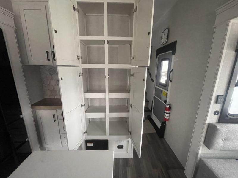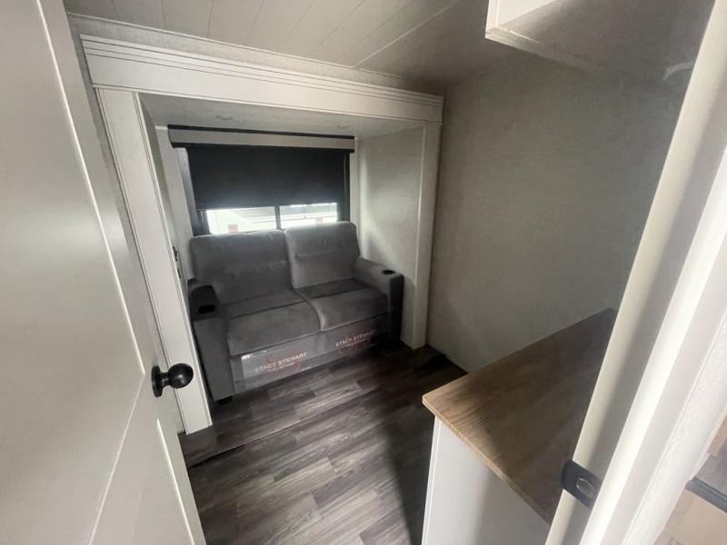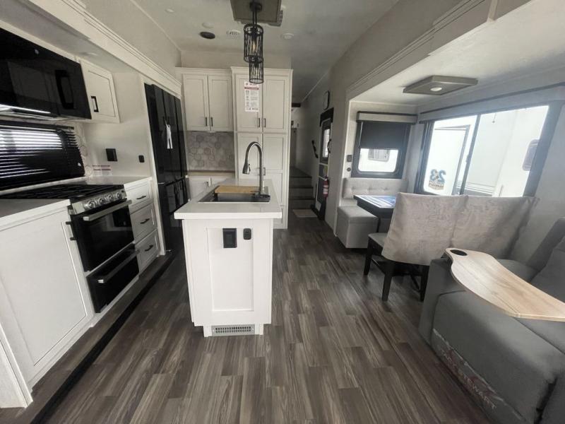 This fifth wheel with four slides is one your whole crew will love! There is a middle bedroom/den with a tri-fold sofa and a desk, allowing this room to become an office if you need it. The loft above this room will be a big hit with the little ones, and the full bath is centrally located so everyone can use it easily. You will have the front private bedroom all to yourselves with a king bed slide out, a chest with TV prep, plus washer and dryer prep in the walk-in closet. The main living area includes everything you need to relax in comfort, like the theater seats, tri-fold sofa, and entertainment center with a fireplace. The chef will enjoy the extra counter space provided by the kitchen island, and there is plenty of storage with the pantry, hutch, and 16 cu. ft. 12V refrigerator. This model even has an outside kitchen, two power awnings, and outside storage for all your gear!