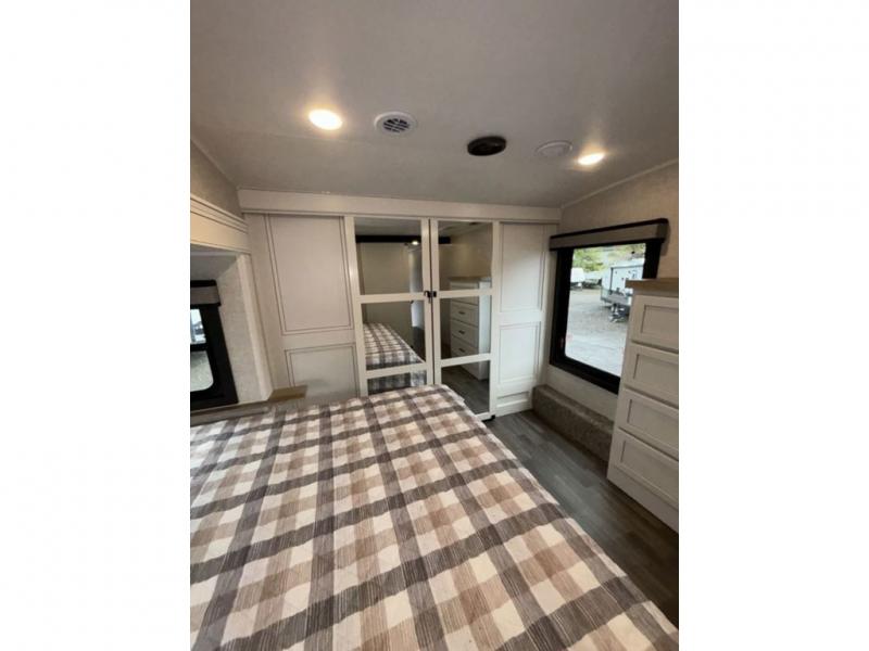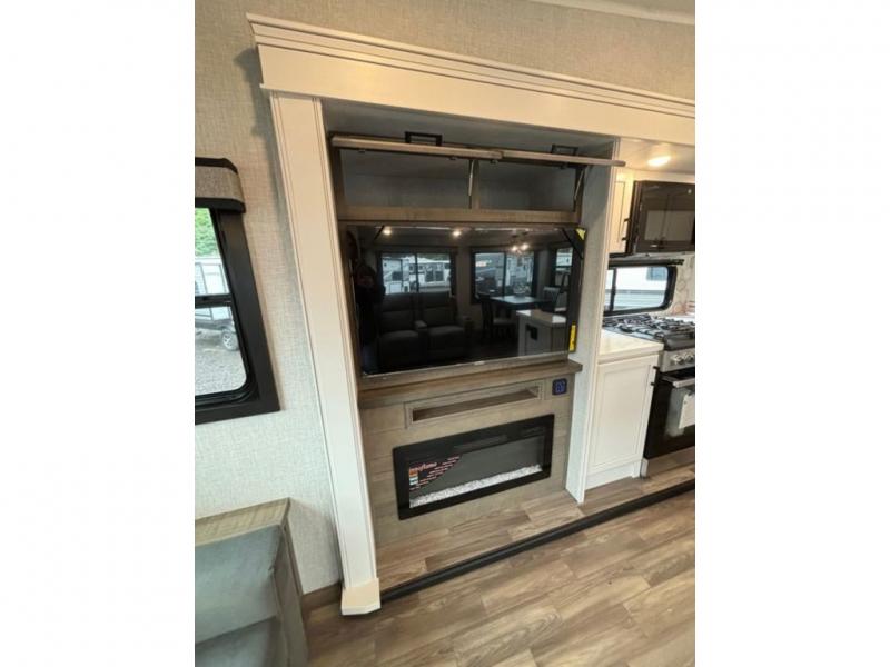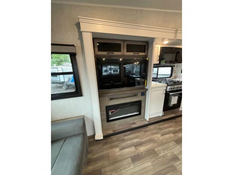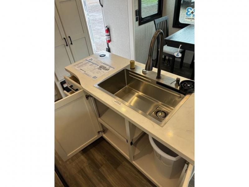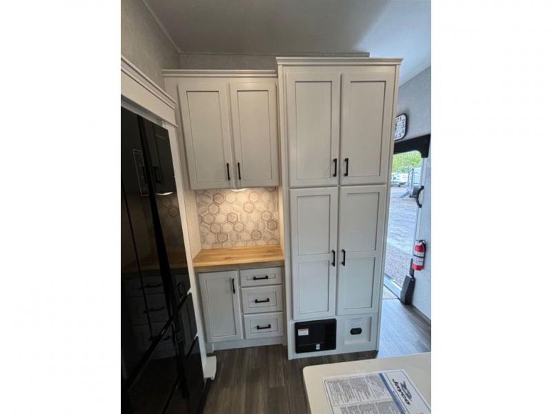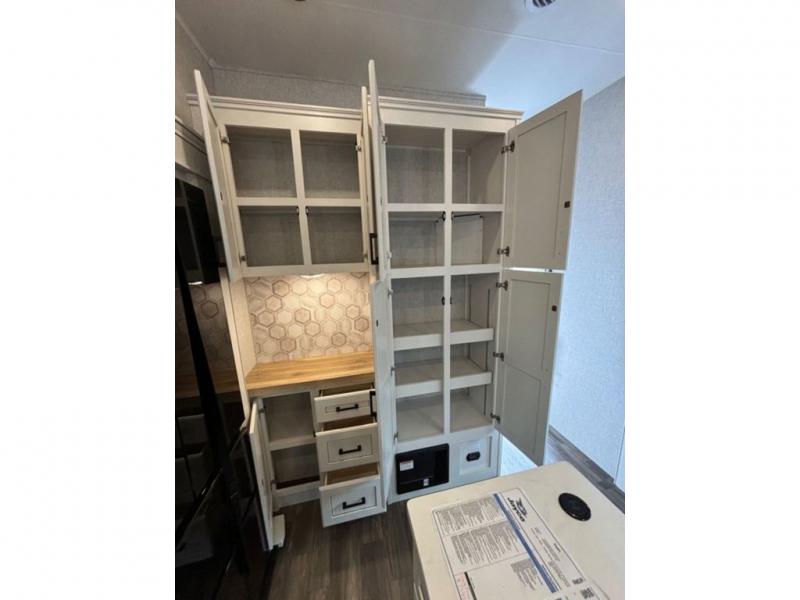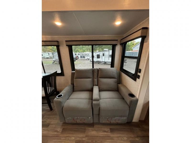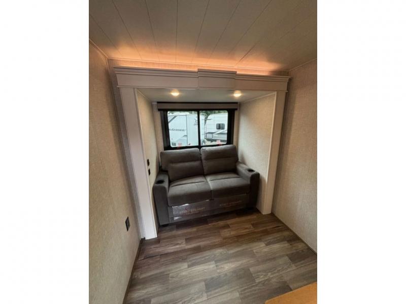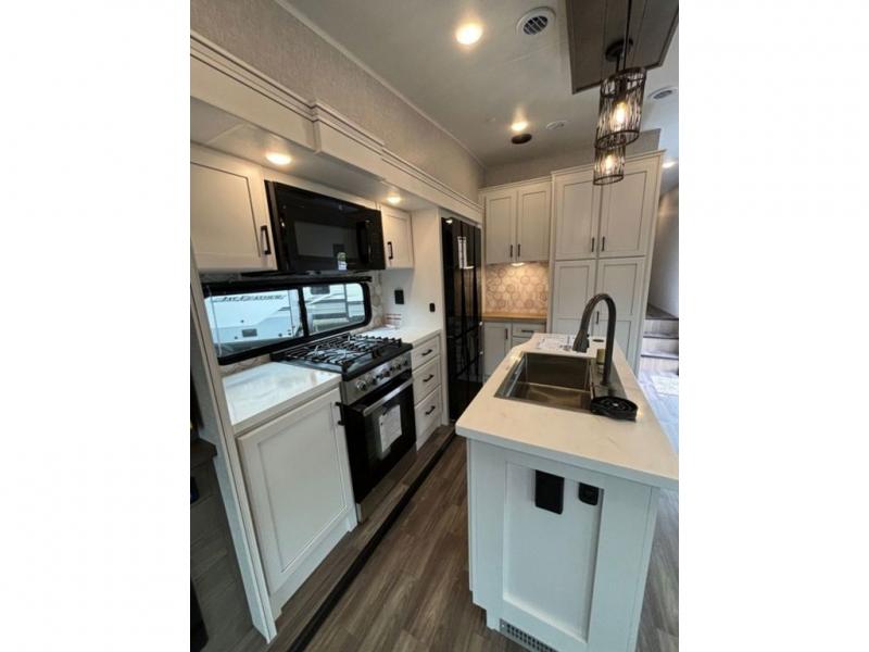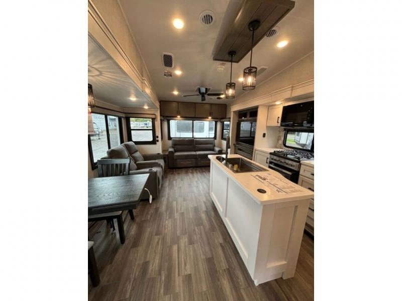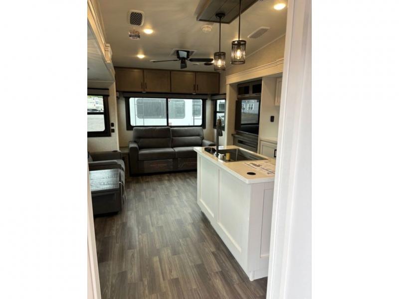 This fifth wheel with four slides is one your whole crew will love! There is a middle bedroom/den with a tri-fold sofa and a desk, allowing this room to become an office if you need it. The loft above this room will be a big hit with the little ones, and the full bath is centrally located so everyone can use it easily. You will have the front private bedroom all to yourselves with a king bed slide out, a chest with TV prep, plus washer and dryer prep in the walk-in closet. The main living area includes everything you need to relax in comfort, like the theater seats, tri-fold sofa, and entertainment center with a fireplace. The chef will enjoy the extra counter space provided by the kitchen island, and there is plenty of storage with the pantry, hutch, and 16 cu. ft. 12V refrigerator. This model even has an outside kitchen, two power awnings, and outside storage for all your gear!