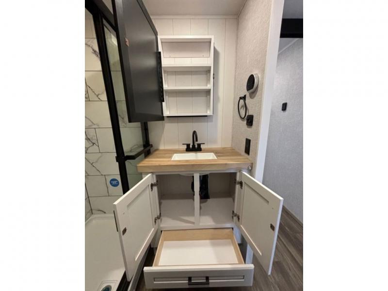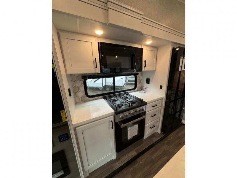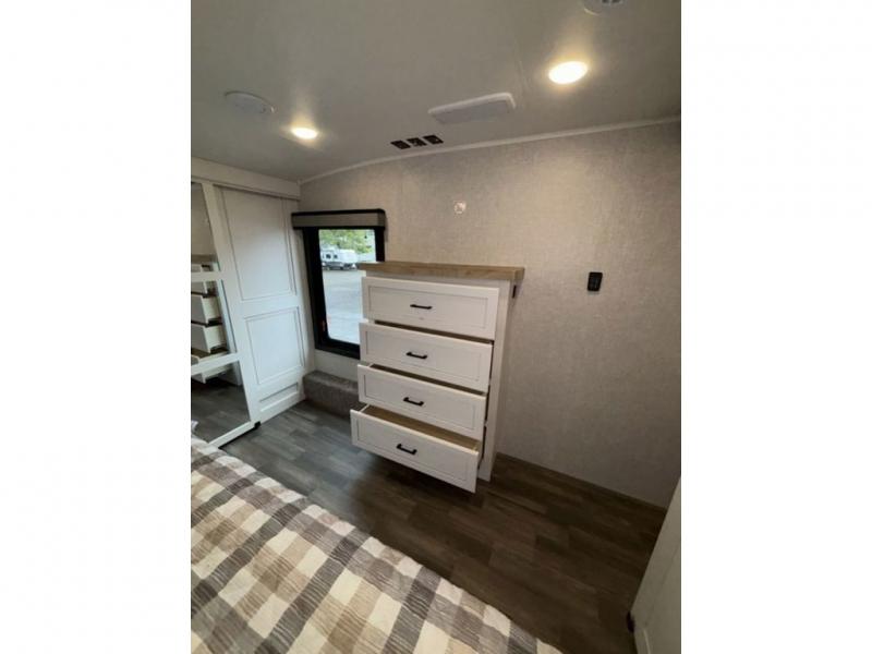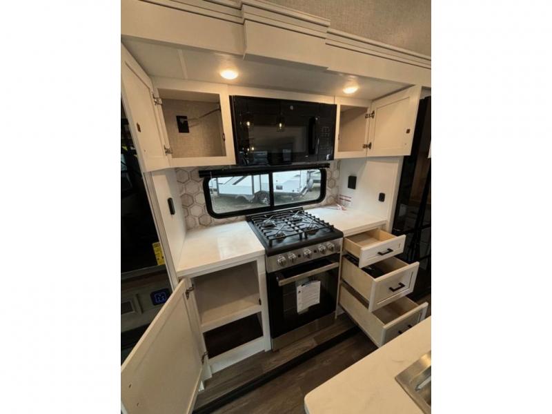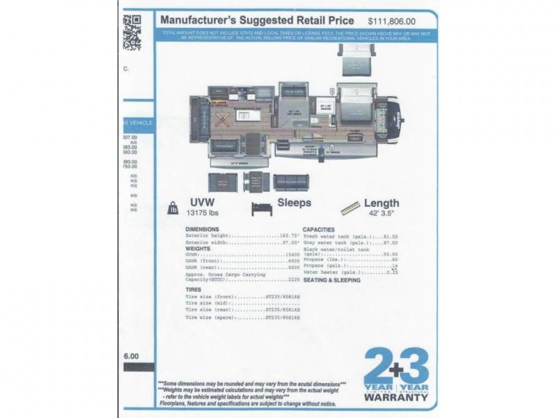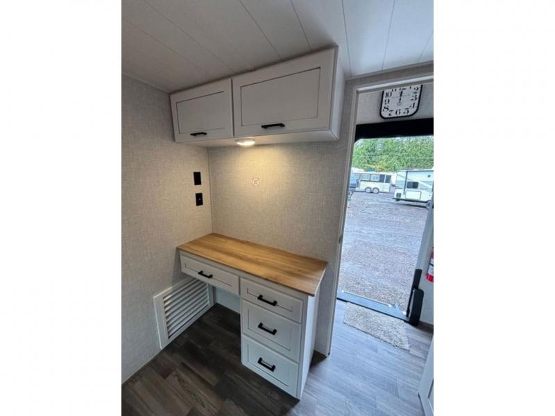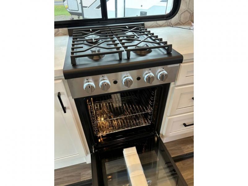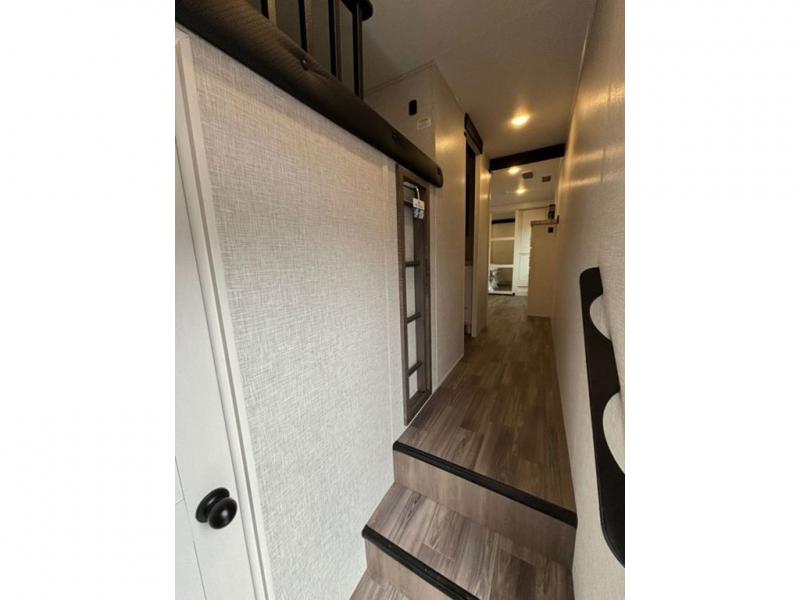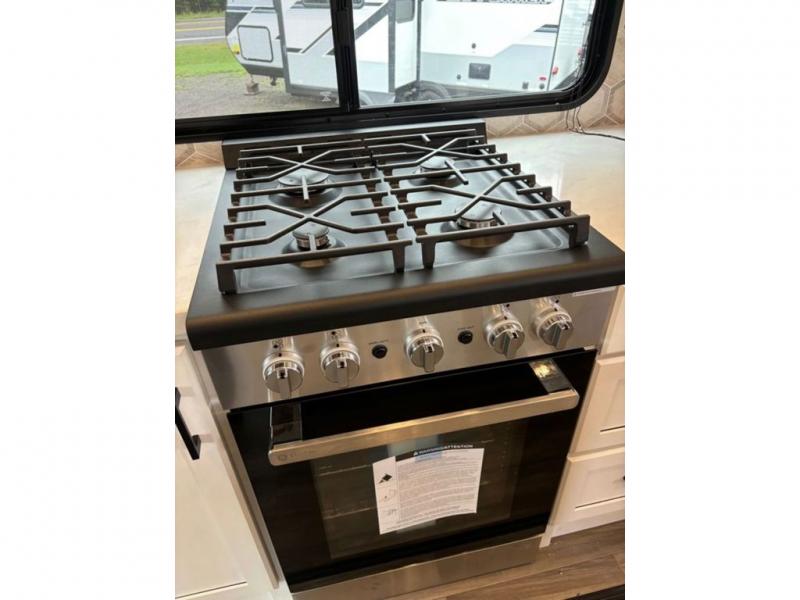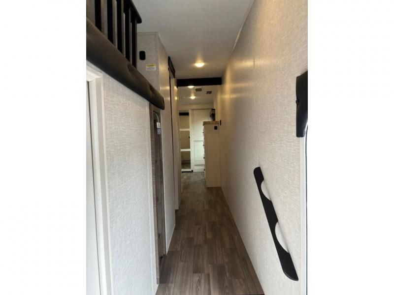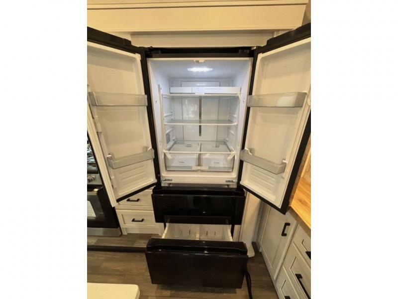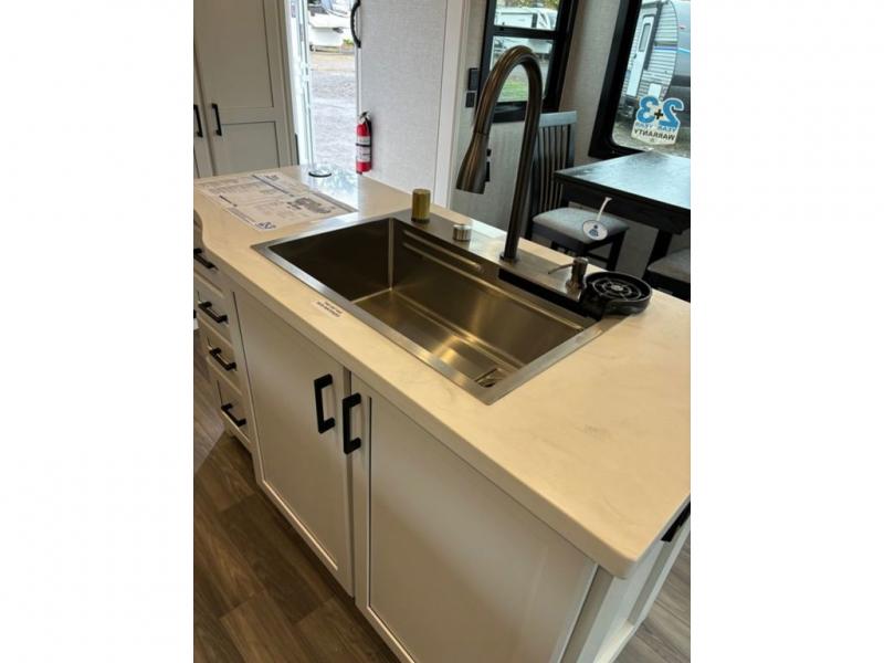 This fifth wheel with four slides is one your whole crew will love! There is a middle bedroom/den with a tri-fold sofa and a desk, allowing this room to become an office if you need it. The loft above this room will be a big hit with the little ones, and the full bath is centrally located so everyone can use it easily. You will have the front private bedroom all to yourselves with a king bed slide out, a chest with TV prep, plus washer and dryer prep in the walk-in closet. The main living area includes everything you need to relax in comfort, like the theater seats, tri-fold sofa, and entertainment center with a fireplace. The chef will enjoy the extra counter space provided by the kitchen island, and there is plenty of storage with the pantry, hutch, and 16 cu. ft. 12V refrigerator. This model even has an outside kitchen, two power awnings, and outside storage for all your gear!