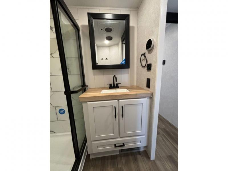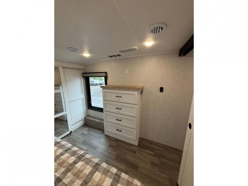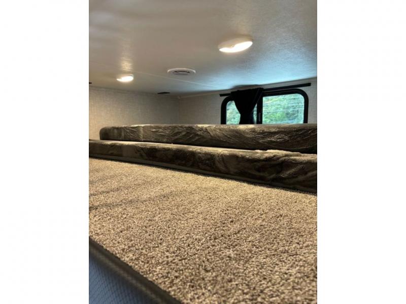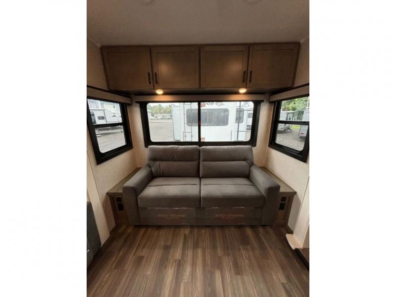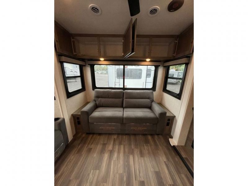With any Eagle fifth wheel by Jayco you will appreciate durable construction materials, like the Magnum Truss Roof and the Stronghold VBL laminated walls. The JAYCOMMAND Smart RV system puts you in control of your RV's functions, and the 5 Star Handling Package will provide smooth towing from home to camp. Each model features Climate Shield zero-degree tested weather protection and the industry-exclusive HELIX cooling system that features two 15,000 BTU Whisper Quiet A/C's to keep you comfortable year around. Some of the exterior conveniences you are sure to love are the pass-through storage with Slam-Latch baggage doors and an automotive style front cap with max turn radius. The Eagle fifth wheels are designed to make you feel at home with solid hardwood slide fascia, residential vinyl flooring throughout, 100% no floor vents, and blackout roller shades with reflective side throughout for added privacy and insulation.