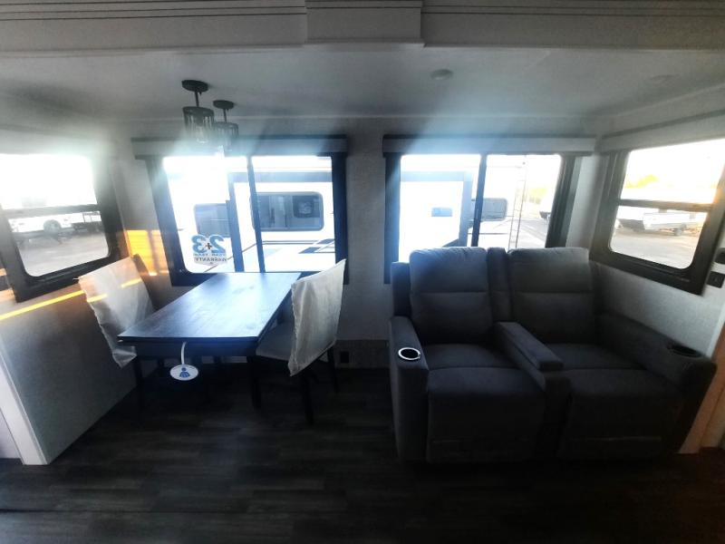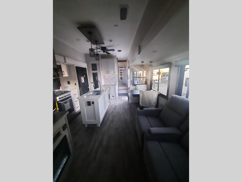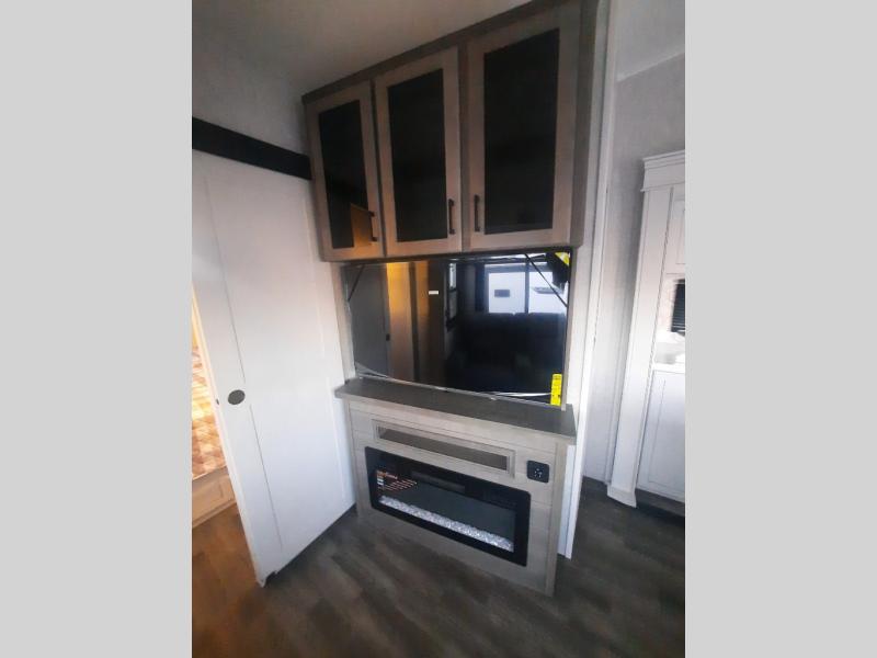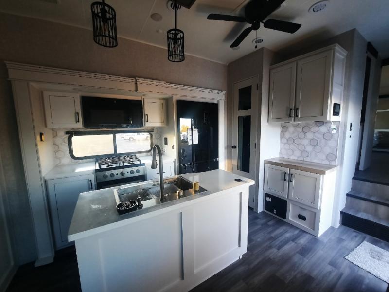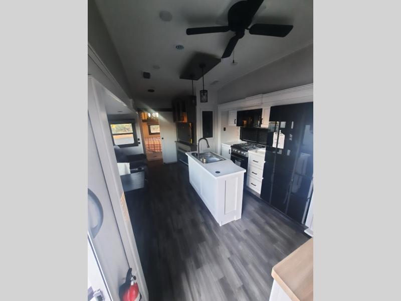 This fifth wheel is decked out in features you will love! The dual slides in the main living area create an open floorplan, and then there is a kitchen island that will make meal prepping easier. The theater seats and free standing table with chairs have a great view of the entertainment center and fireplace, and there is a ceiling fan here to keep the air moving. And did we mention there is an outside kitchen, complete with an outdoor refrigerator? This model also features a front private bedroom with a king bed slide out, a chest, and a front closet with convenient washer and dryer prep. There is also a rear private bunkhouse that has a 54" x 74" upper loft bed above a 66" x 80" Olympic bed with wardrobe storage drawers, as well as its very own half bathroom!