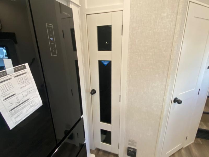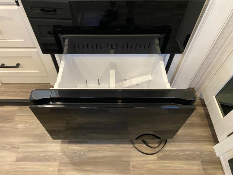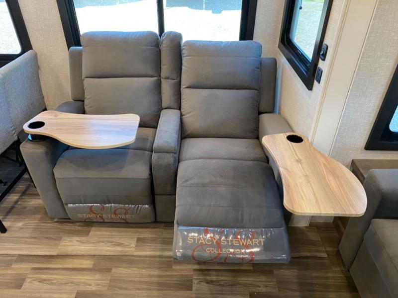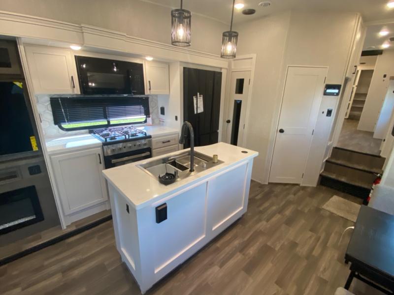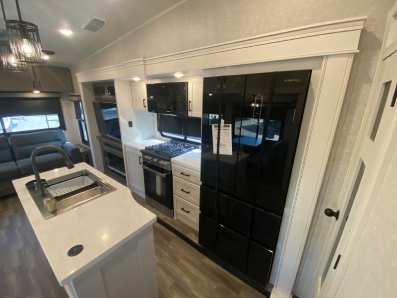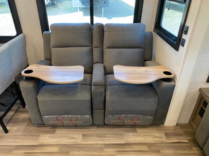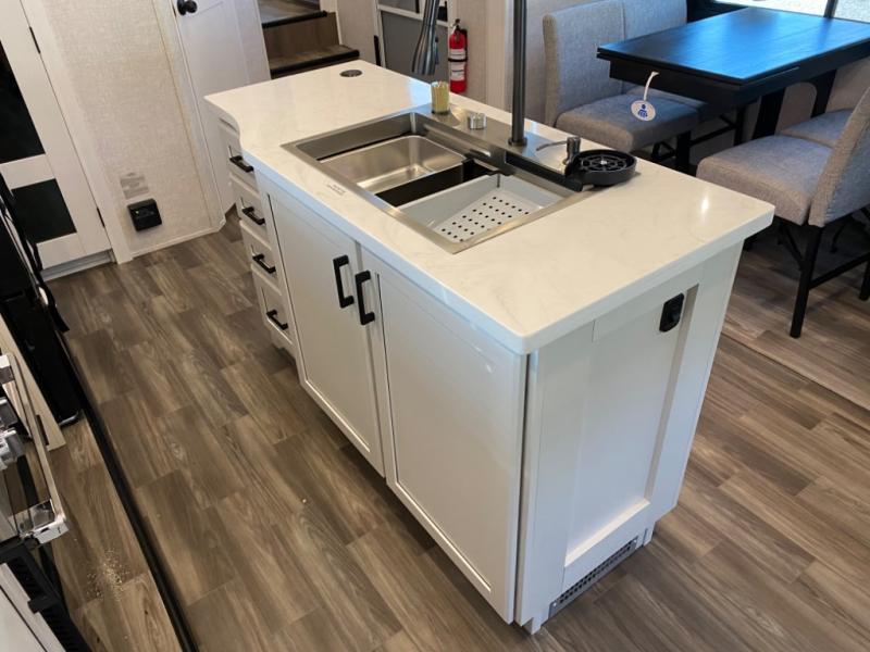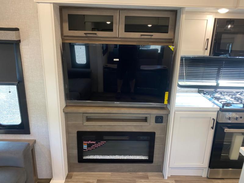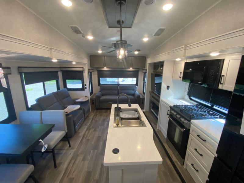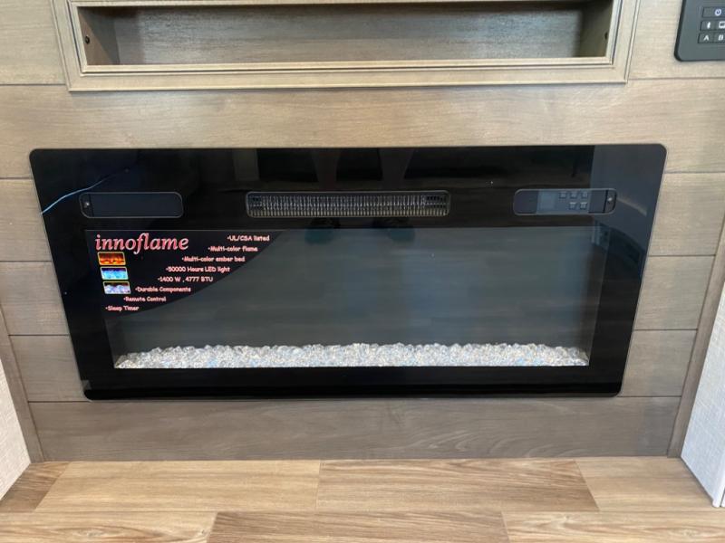 Enjoy a private bedroom suite in this fifth wheel! The king bed is positioned in a slide out for maximum room, and a sliding door leads to the front bath which is full of luxurious features. Enjoy a 30" x 60" shower with a seat. There's a walk-in front closet which has hanging space as well as prep for an optional washer and dryer. An additional wardrobe/linen closet provides some extra space. There's also a half-bath located off the kitchen, and that one has overhead storage also. You'll love the living area with its theater seats, tri-fold sofa, ceiling fan, and entertainment center with fireplace. The kitchen has a four-burner cooktop, center island with sink, 30" microwave oven over the range, and a 16 cu. ft. 12 volt refrigerator - perfect for cooking up great meals!