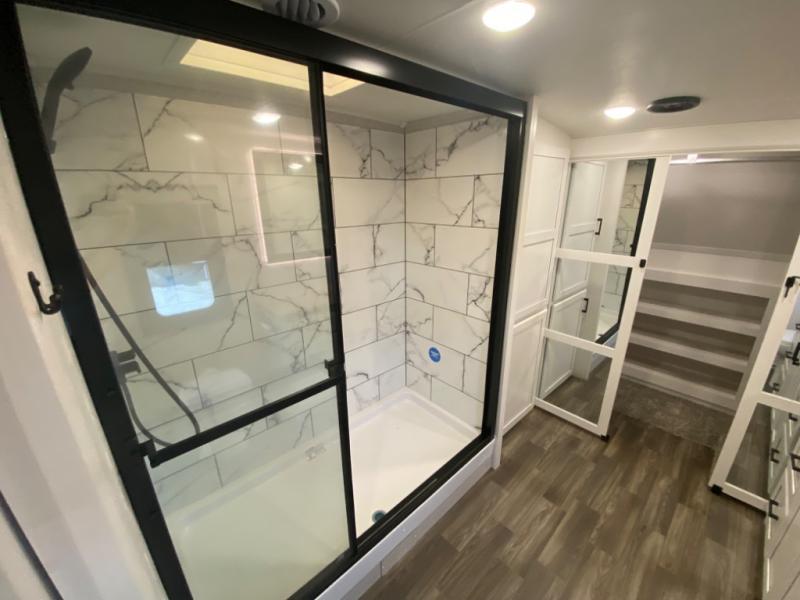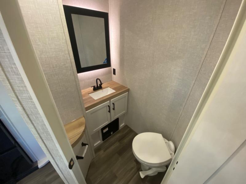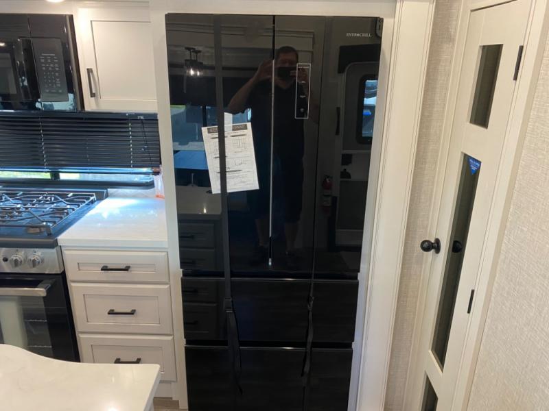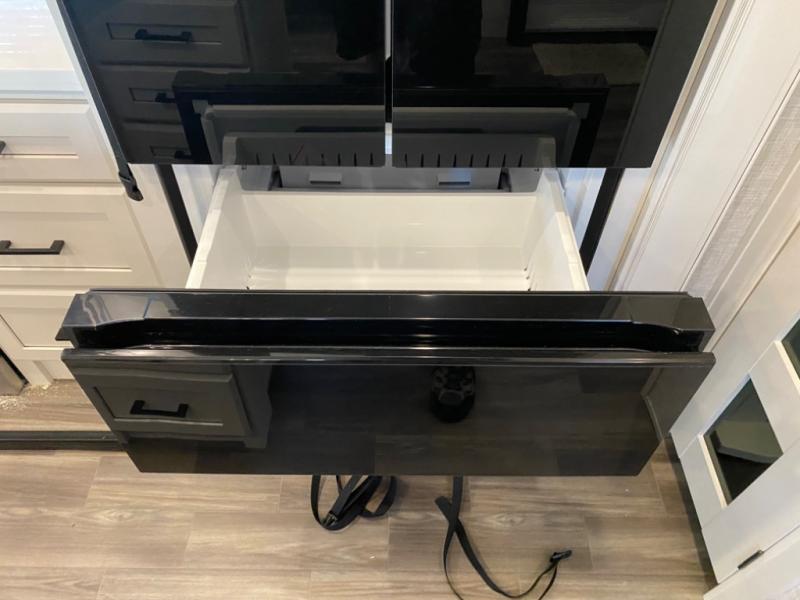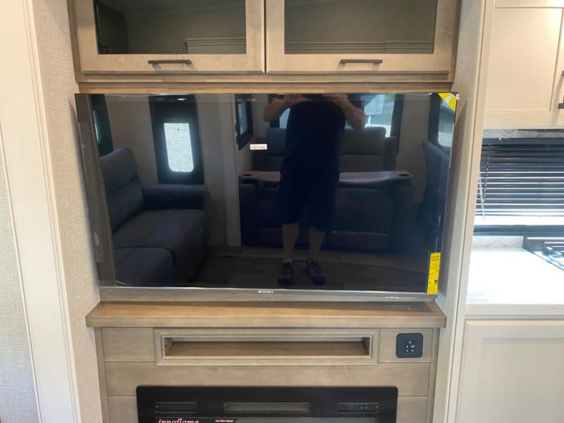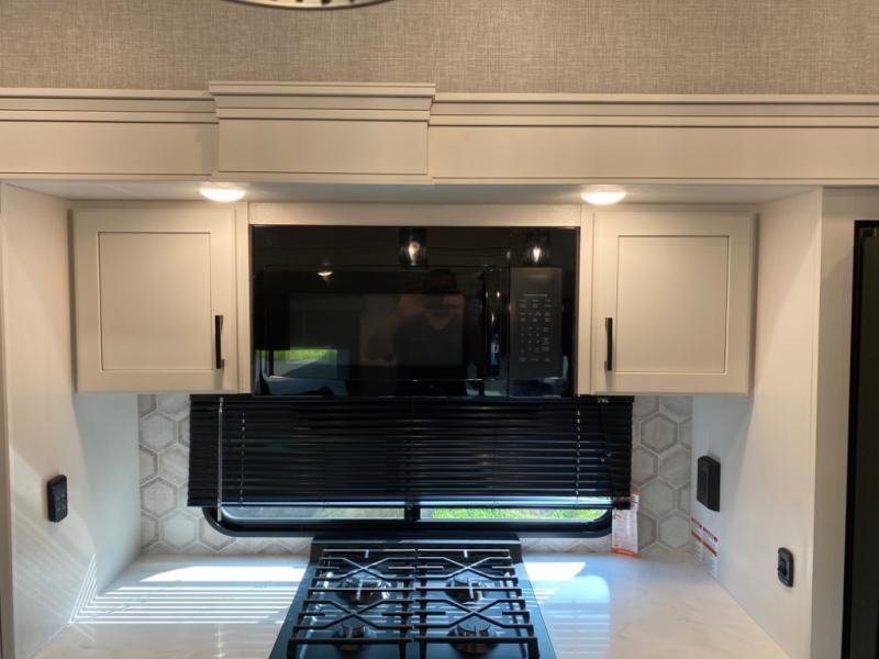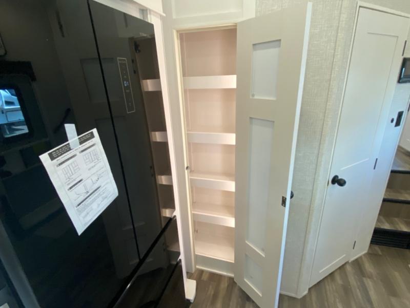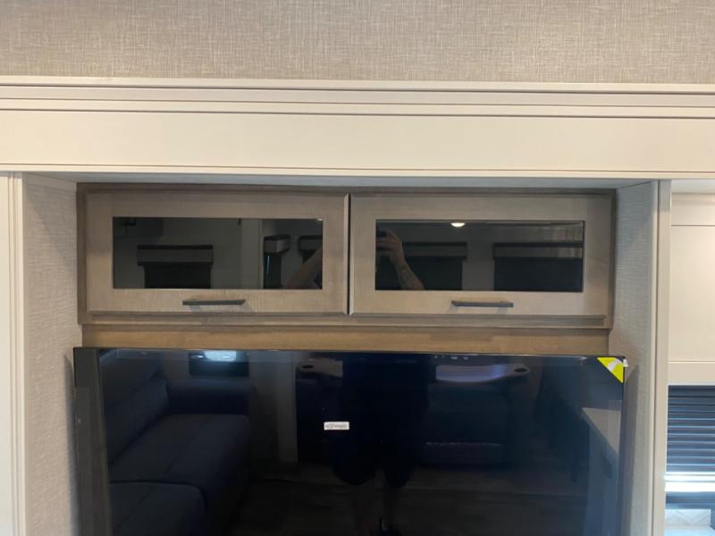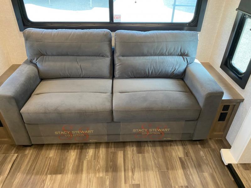 Enjoy a private bedroom suite in this fifth wheel! The king bed is positioned in a slide out for maximum room, and a sliding door leads to the front bath which is full of luxurious features. Enjoy a 30" x 60" shower with a seat. There's a walk-in front closet which has hanging space as well as prep for an optional washer and dryer. An additional wardrobe/linen closet provides some extra space. There's also a half-bath located off the kitchen, and that one has overhead storage also. You'll love the living area with its theater seats, tri-fold sofa, ceiling fan, and entertainment center with fireplace. The kitchen has a four-burner cooktop, center island with sink, 30" microwave oven over the range, and a 16 cu. ft. 12 volt refrigerator - perfect for cooking up great meals!