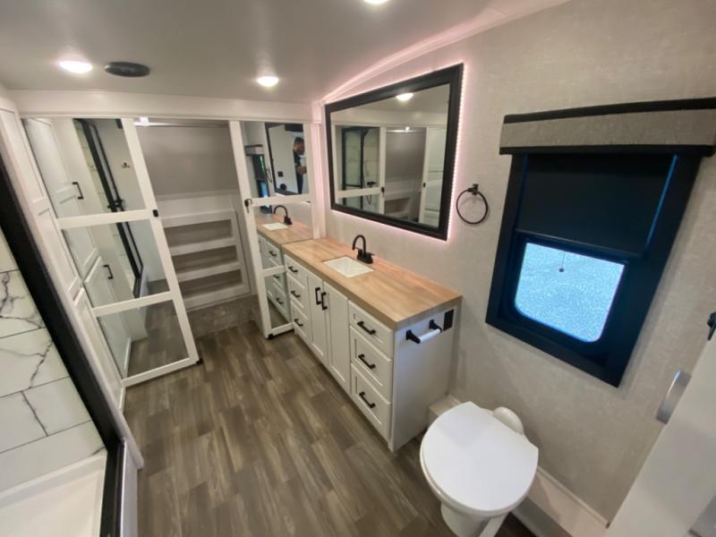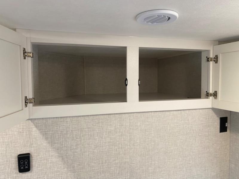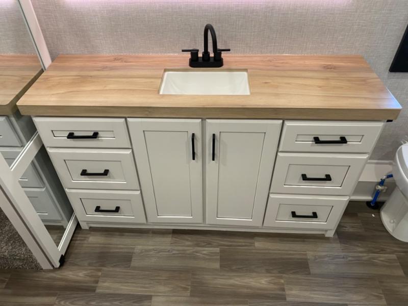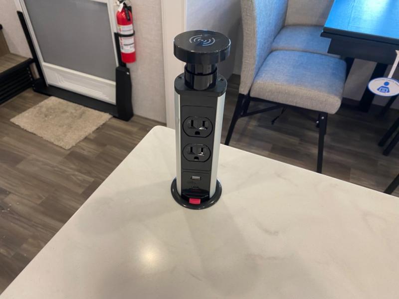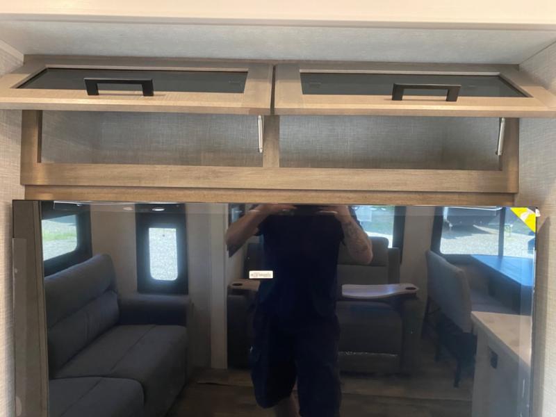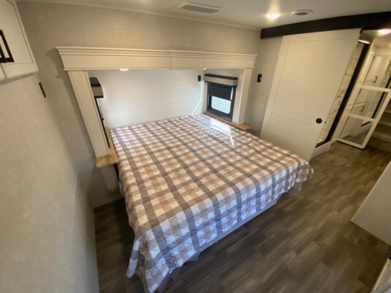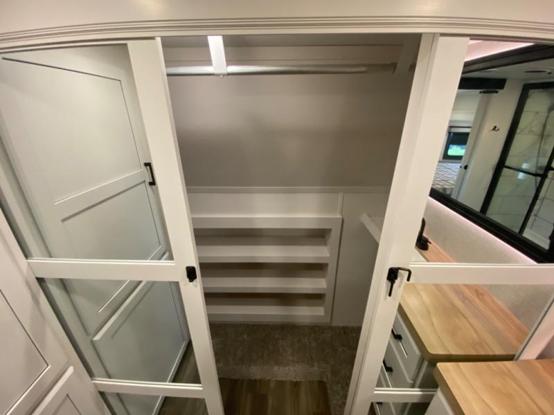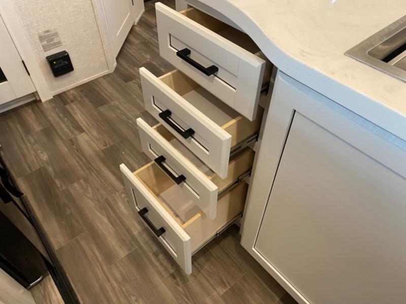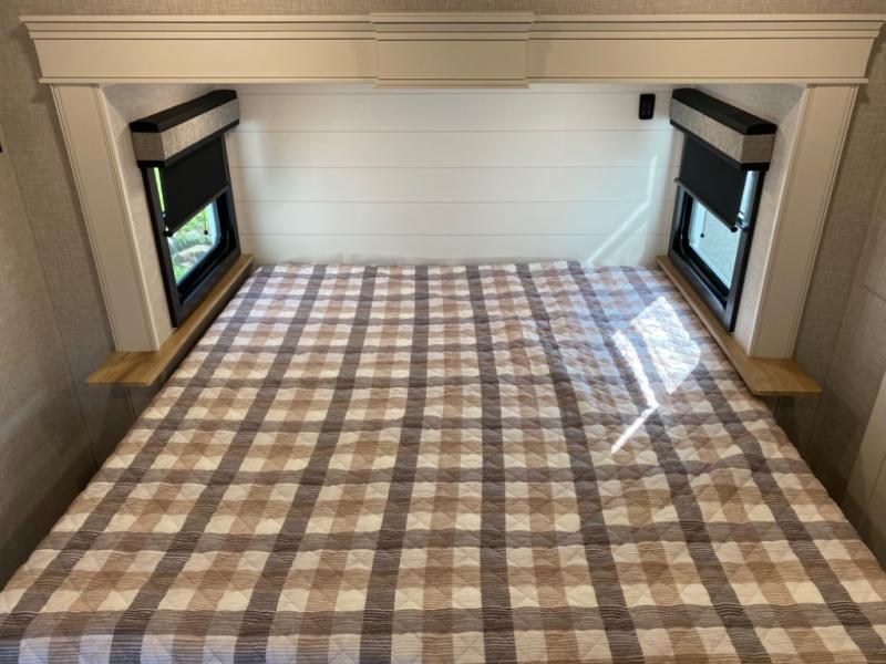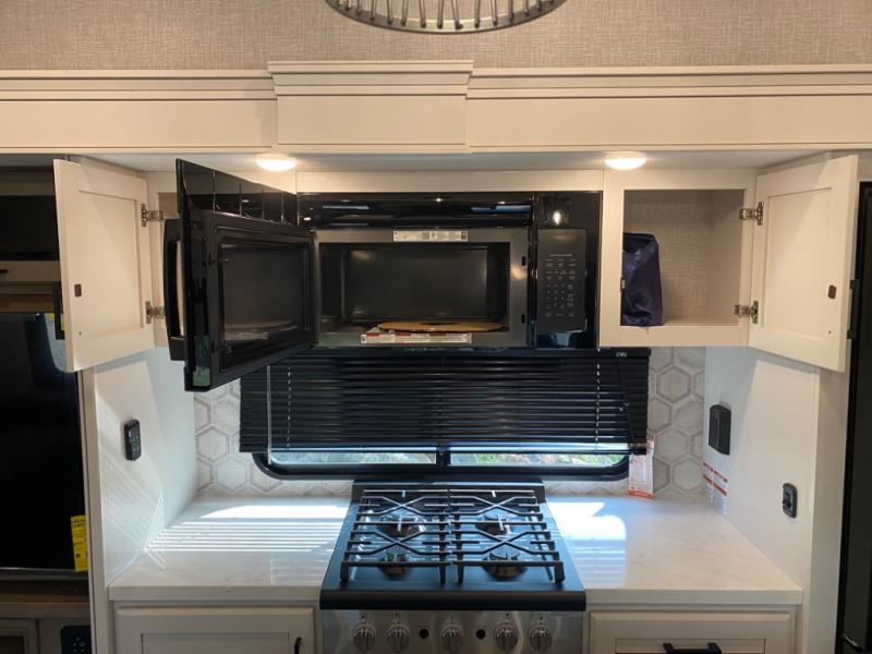 Enjoy a private bedroom suite in this fifth wheel! The king bed is positioned in a slide out for maximum room, and a sliding door leads to the front bath which is full of luxurious features. Enjoy a 30" x 60" shower with a seat. There's a walk-in front closet which has hanging space as well as prep for an optional washer and dryer. An additional wardrobe/linen closet provides some extra space. There's also a half-bath located off the kitchen, and that one has overhead storage also. You'll love the living area with its theater seats, tri-fold sofa, ceiling fan, and entertainment center with fireplace. The kitchen has a four-burner cooktop, center island with sink, 30" microwave oven over the range, and a 16 cu. ft. 12 volt refrigerator - perfect for cooking up great meals!