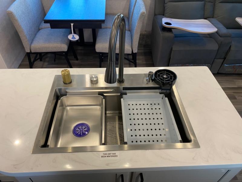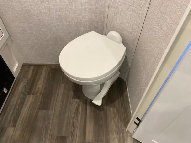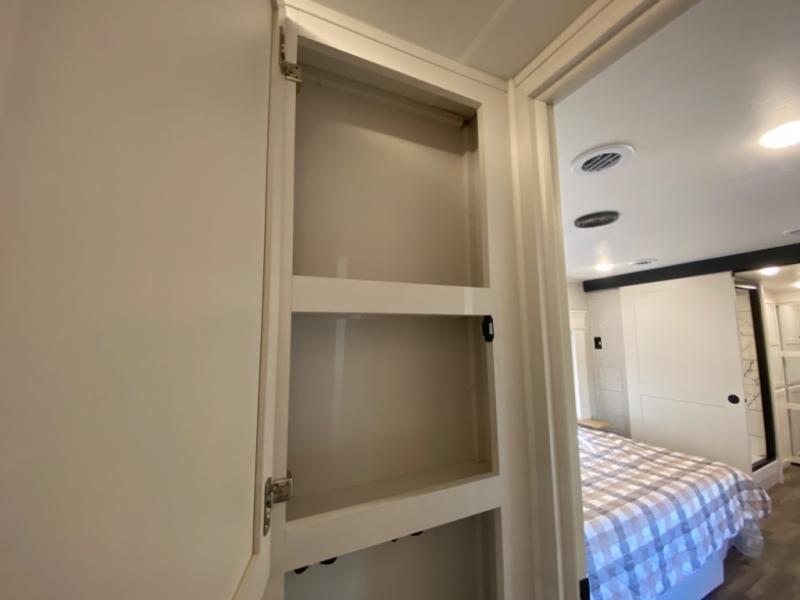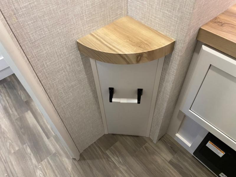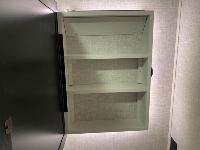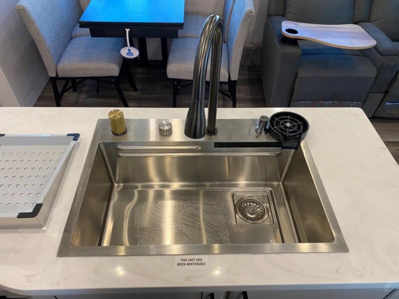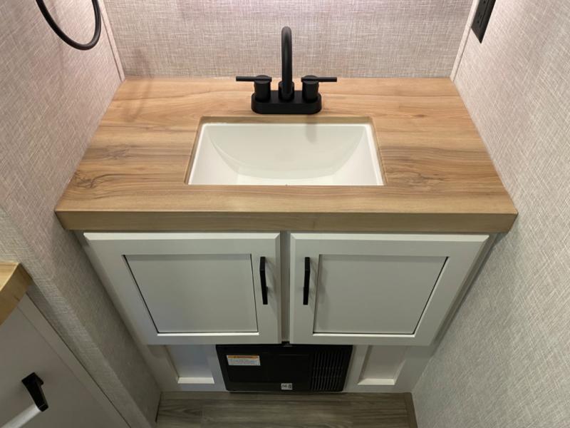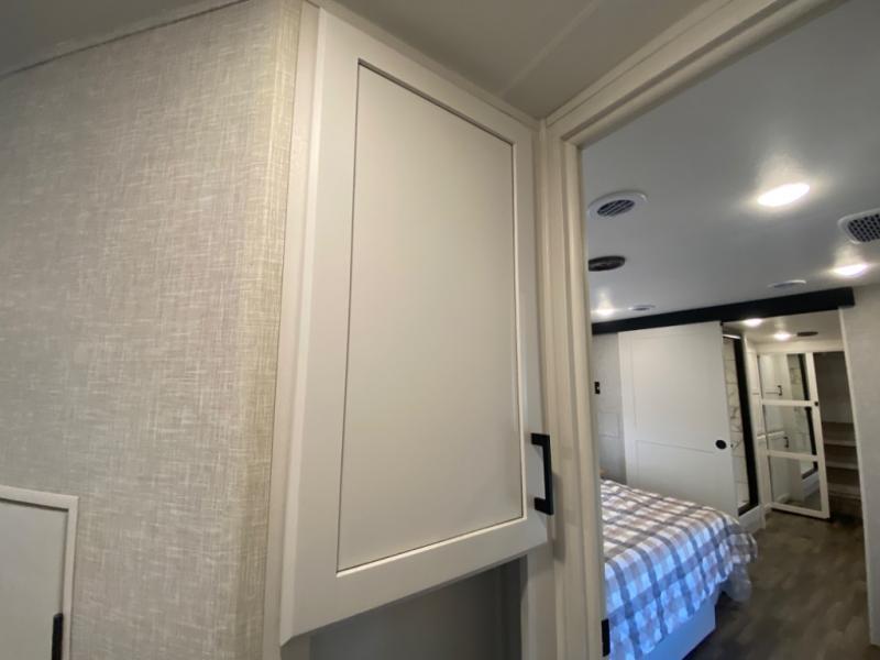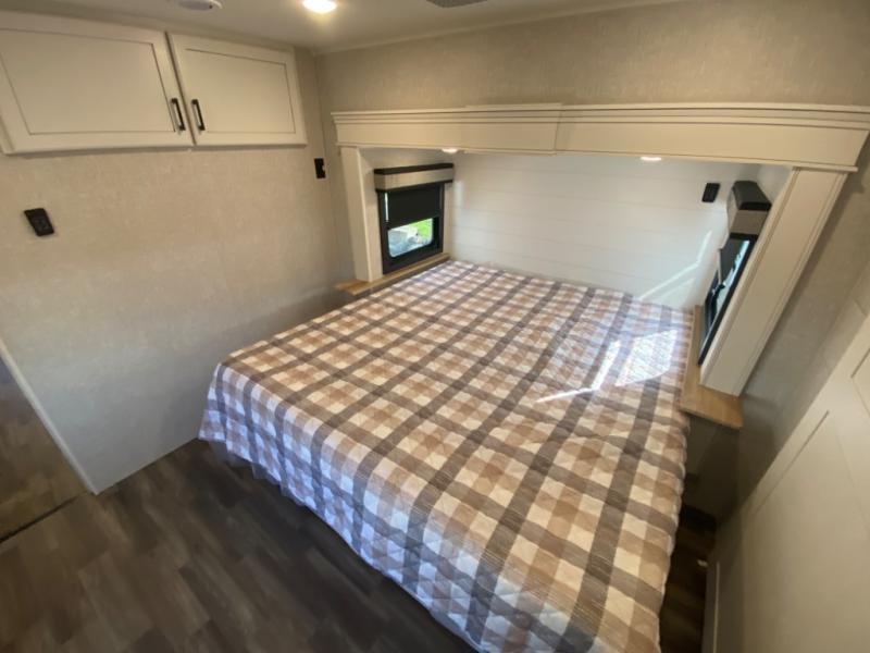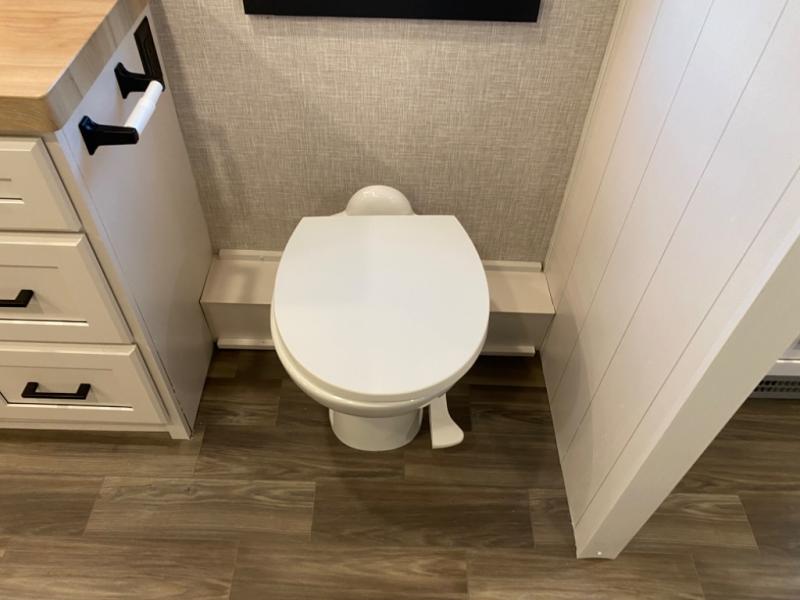 Enjoy a private bedroom suite in this fifth wheel! The king bed is positioned in a slide out for maximum room, and a sliding door leads to the front bath which is full of luxurious features. Enjoy a 30" x 60" shower with a seat. There's a walk-in front closet which has hanging space as well as prep for an optional washer and dryer. An additional wardrobe/linen closet provides some extra space. There's also a half-bath located off the kitchen, and that one has overhead storage also. You'll love the living area with its theater seats, tri-fold sofa, ceiling fan, and entertainment center with fireplace. The kitchen has a four-burner cooktop, center island with sink, 30" microwave oven over the range, and a 16 cu. ft. 12 volt refrigerator - perfect for cooking up great meals!