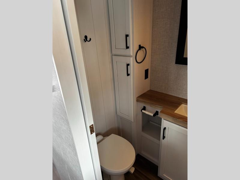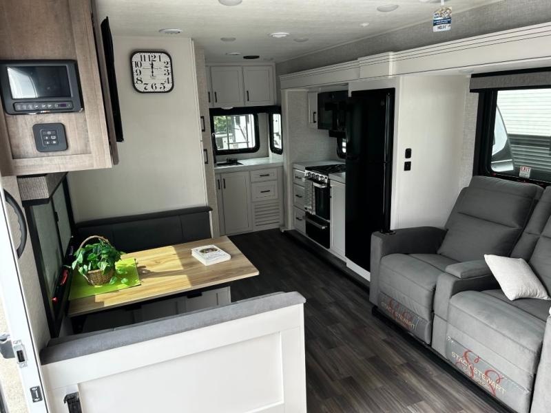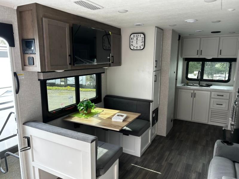 It will be so easy to enjoy camping trips when you're in this travel trailer! A full kitchen, complete with a three burner cooktop, over-the-range microwave, and 10 cu. ft. 12V refrigerator will let you cook and store meals, and the booth dinette provides a place to dine. Within the large slide, you'll find the 60" theater sofa with cup holders which is across from the 40" 4K Ultra LED HD Smart TV! You'll love having a 66" x 80" Olympic queen bed to sleep on, and there are dual wardrobes to keep your clothes organized. And larger camp gear can go outside in the pass-thru storage!
