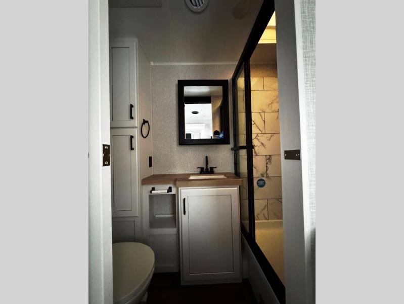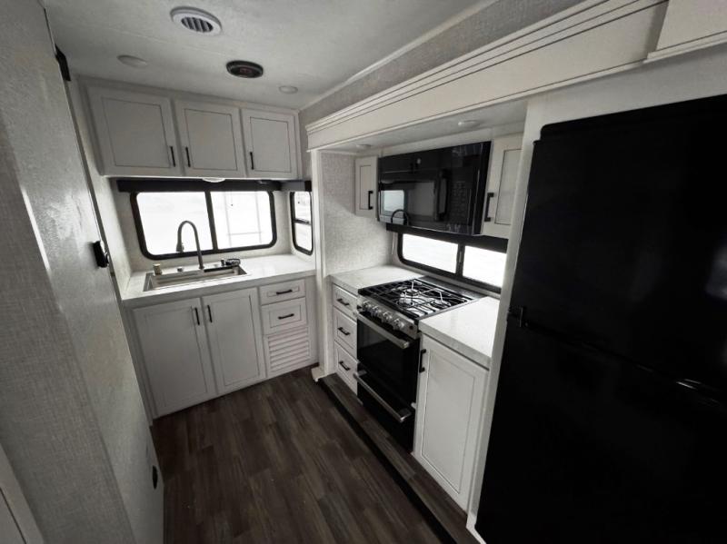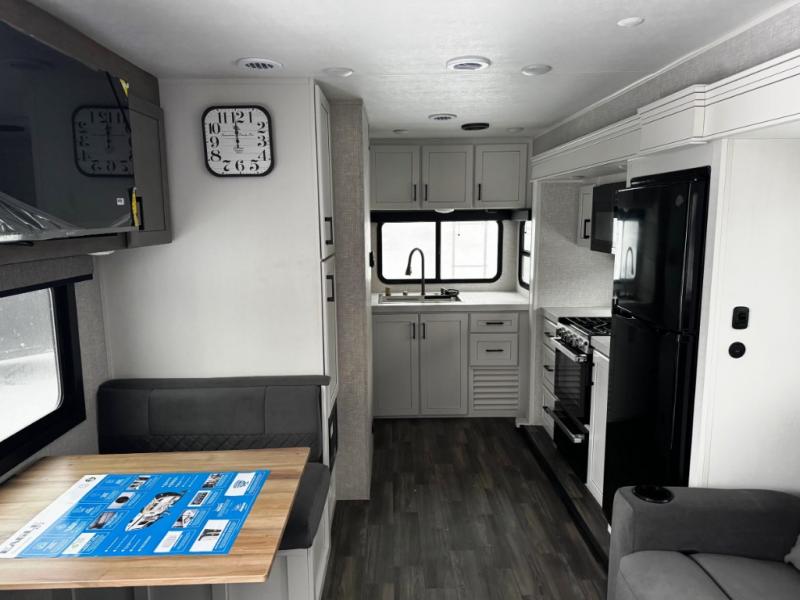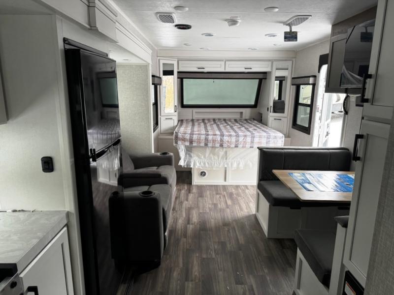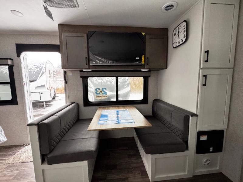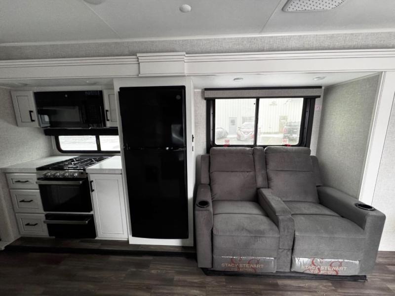 It will be so easy to enjoy camping trips when you're in this travel trailer! A full kitchen, complete with a three burner cooktop, over-the-range microwave, and 10 cu. ft. 12V refrigerator will let you cook and store meals, and the booth dinette provides a place to dine. Within the large slide, you'll find the 60" theater sofa with cup holders which is across from the 40" 4K Ultra LED HD Smart TV! You'll love having a 66" x 80" Olympic queen bed to sleep on, and there are dual wardrobes to keep your clothes organized. And larger camp gear can go outside in the pass-thru storage!