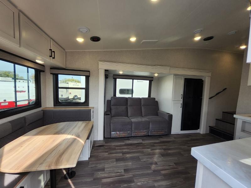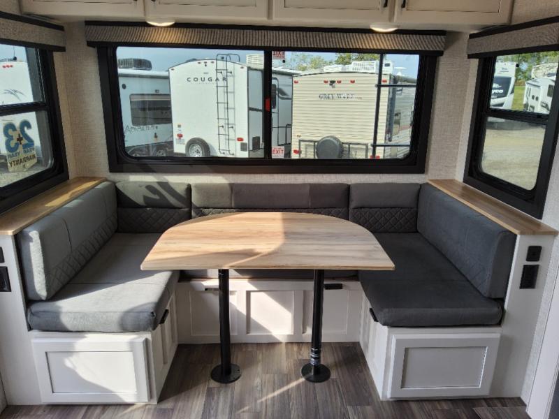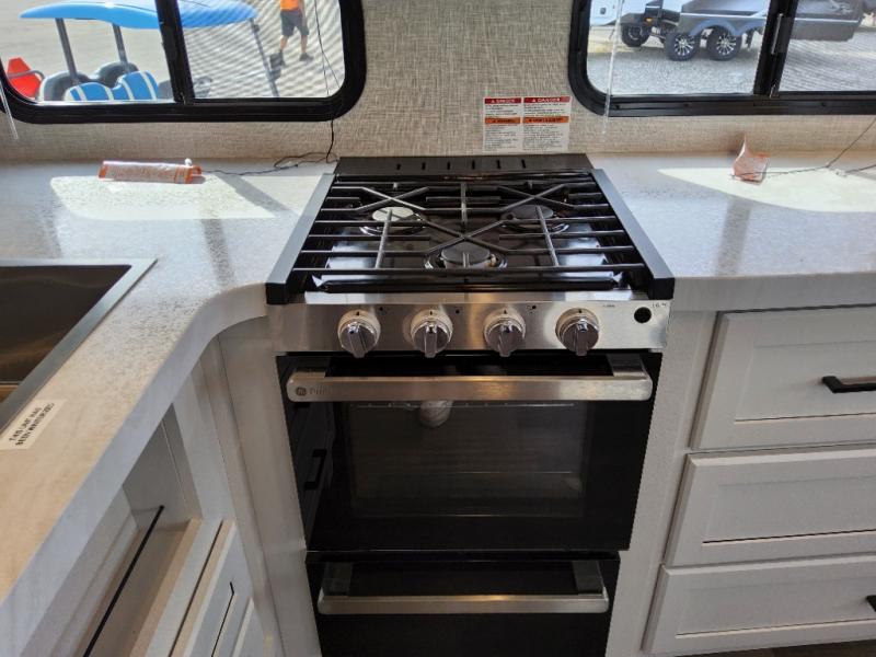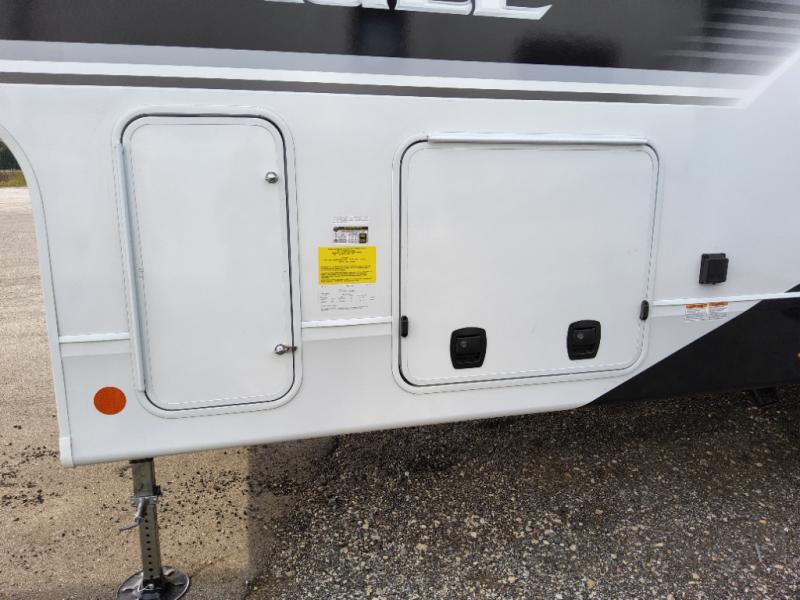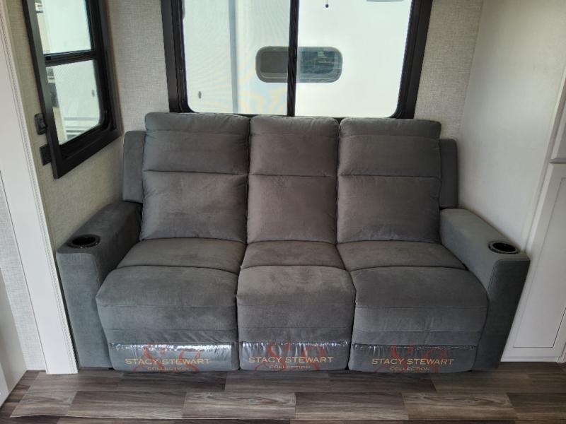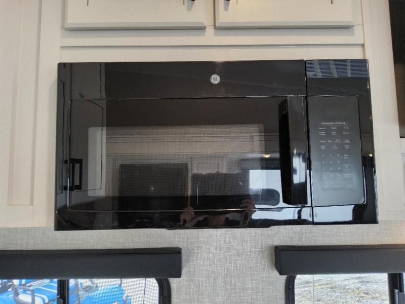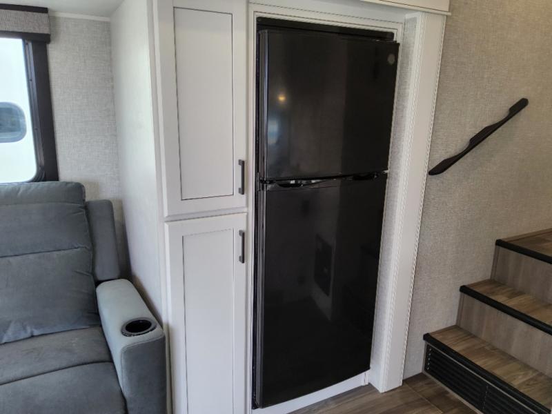 You'll have everything you need in this fifth wheel for enjoyable trips to the lake. Once you arrive at your destination, set up the 16' power awning, grab the fishing poles from the pass-through storage, and relax with a cold drink. And there is a Jayport with LP Quick Connect if you want to bring along your griddle. You and your group can head inside to play a game around the U-shaped dinette or relax on the theater seat across from the TV. The full kitchen includes a black and stainless 21" range, a GE microwave, plus a 12V refrigerator for perishables, and the full bath will let you clean up each day. When you're ready to call it a night, head to the front private bedroom for a great night's rest on the queen bed with dual wardrobes, while your guests sleep on the dinette!