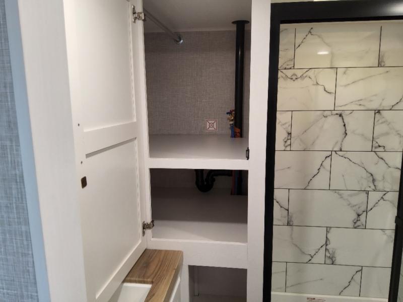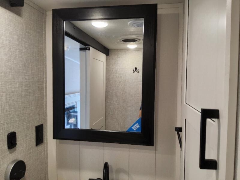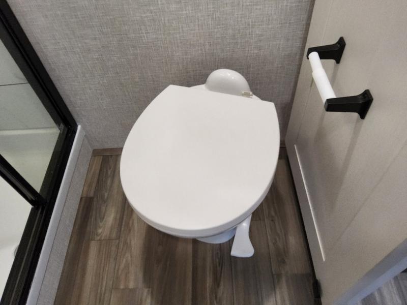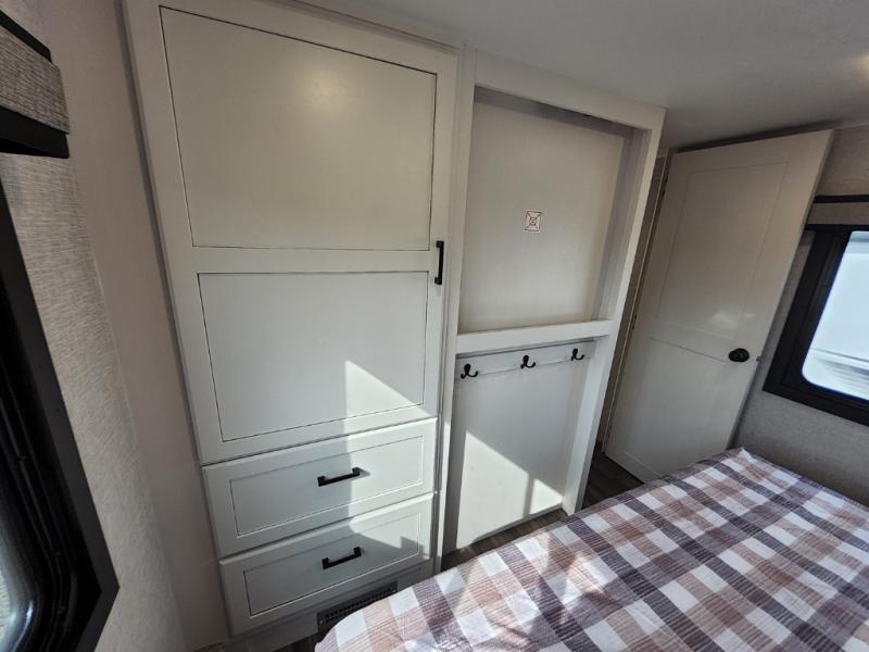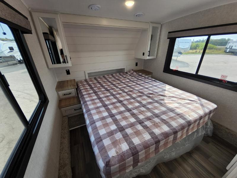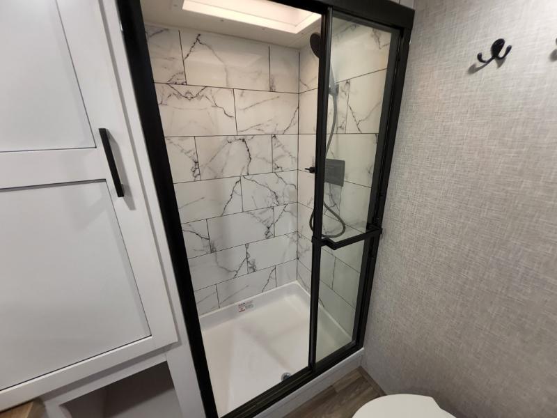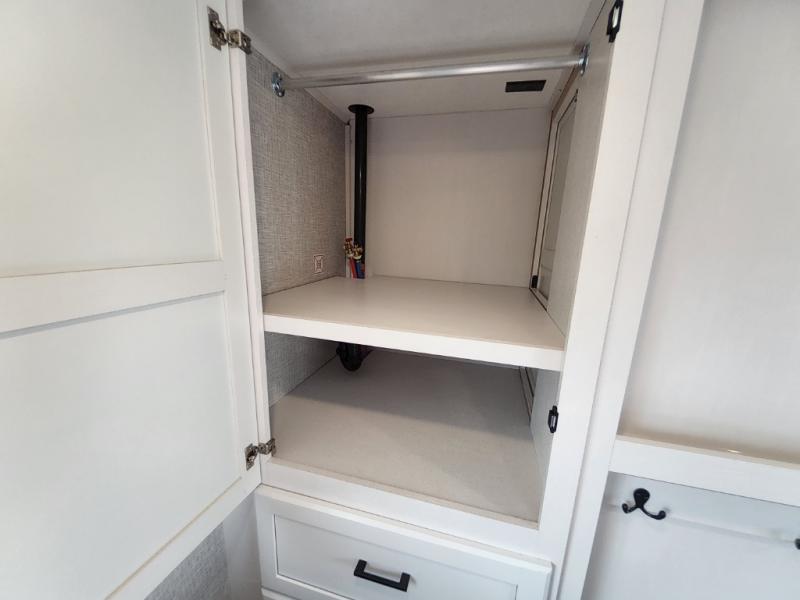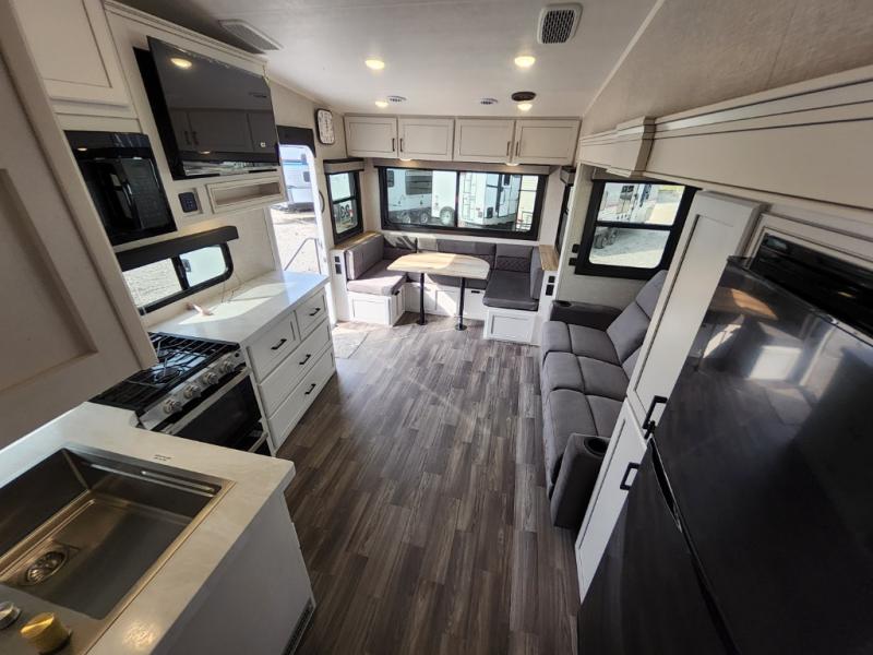 You'll have everything you need in this fifth wheel for enjoyable trips to the lake. Once you arrive at your destination, set up the 16' power awning, grab the fishing poles from the pass-through storage, and relax with a cold drink. And there is a Jayport with LP Quick Connect if you want to bring along your griddle. You and your group can head inside to play a game around the U-shaped dinette or relax on the theater seat across from the TV. The full kitchen includes a black and stainless 21" range, a GE microwave, plus a 12V refrigerator for perishables, and the full bath will let you clean up each day. When you're ready to call it a night, head to the front private bedroom for a great night's rest on the queen bed with dual wardrobes, while your guests sleep on the dinette!