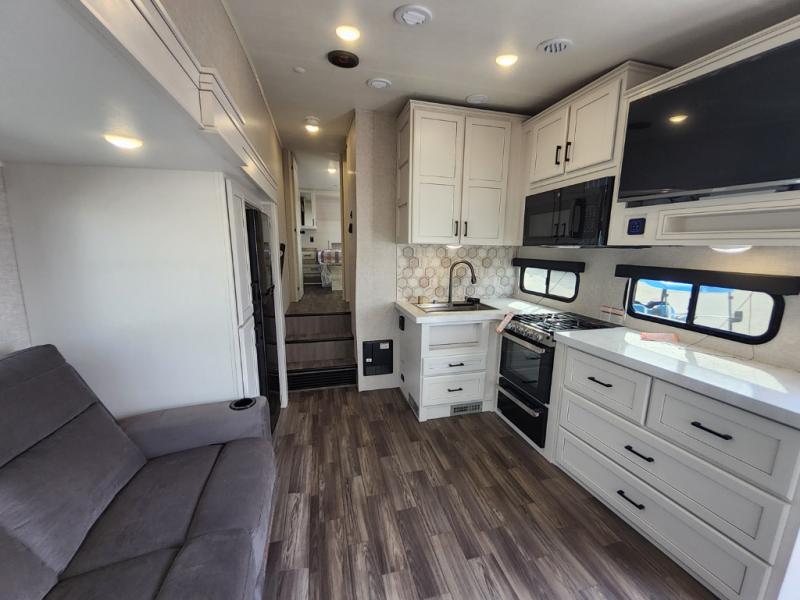 With any Eagle HT fifth wheel or travel trailer by Jayco you will enjoy a smooth drive thanks to the 4 Star Handling Package, Goodyear Endurance tires, and MORryde CRE-3000 rubberized suspension. The Customer Value Package includes amenities that are sure to make camping easier than ever, like the 60K on-demand water heater, Keyed-Alike lock system, 15,000 BTU "Whisper Quiet" A/C, and more. Handcrafted and glazed door/drawer fronts will make your space feel more like home, along with residential vinyl flooring throughout, GE appliances, and blackout roller shades with reflective side throughout to keep the sun out when you want to sleep in. Each model also includes a NuVo H2O water treatment system with filters included, interior and exterior "Blue Sync" audio connect with MB Quart Sound for your TV and phone, and 100% no floor vents for added comfort and convenience!