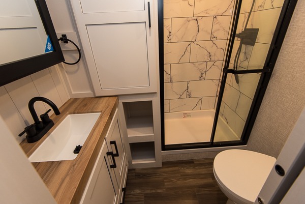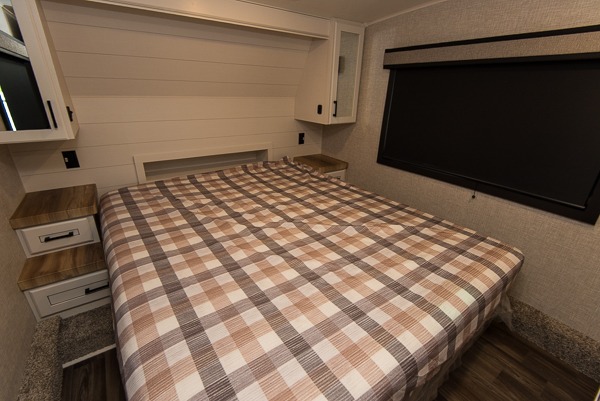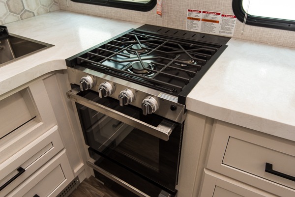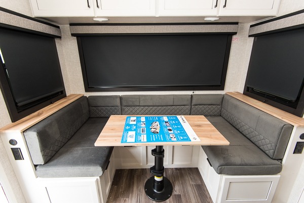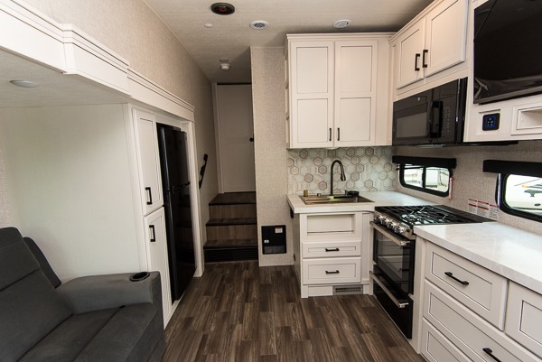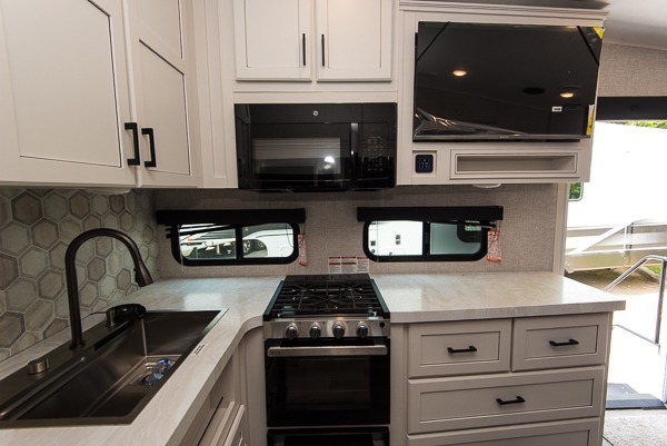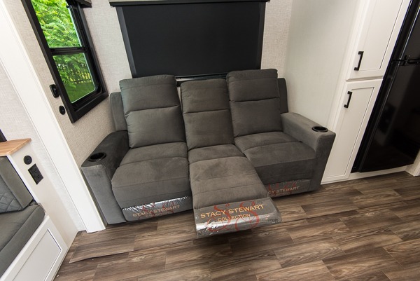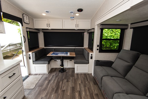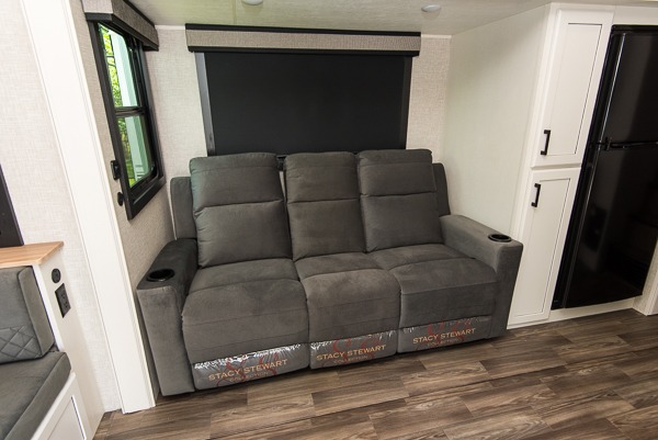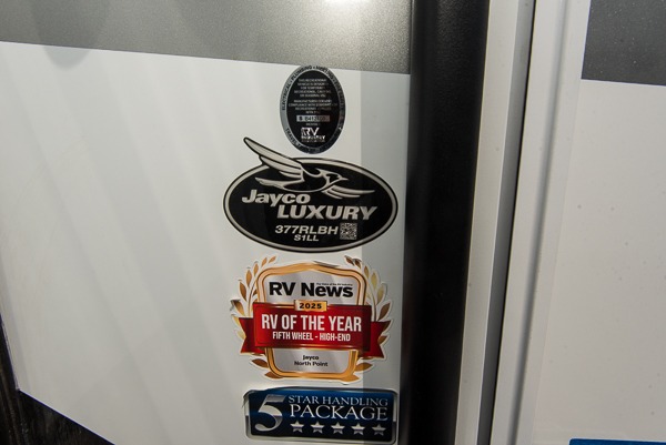You'll have everything you need in this fifth wheel for enjoyable trips to the lake. Once you arrive at your destination, set up the 16' power awning, grab the fishing poles from the pass-through storage, and relax with a cold drink. And there is a Jayport with LP Quick Connect if you want to bring along your griddle. You and your group can head inside to play a game around the U-shaped dinette or relax on the theater seat across from the TV. The full kitchen includes a black and stainless 21" range, a GE microwave, plus a 12V refrigerator for perishables, and the full bath will let you clean up each day. When you're ready to call it a night, head to the front private bedroom for a great night's rest on the queen bed with dual wardrobes, while your guests sleep on the dinette!