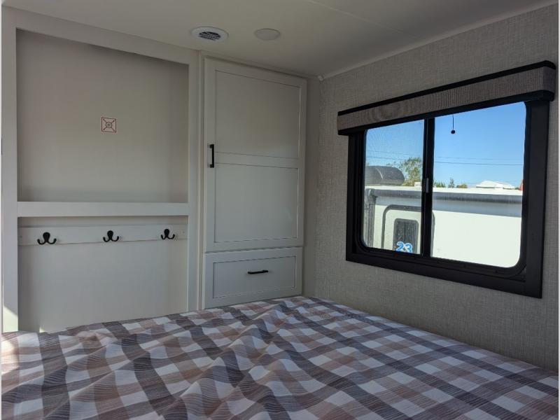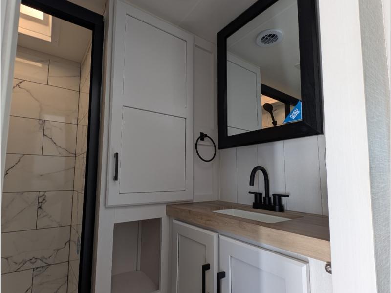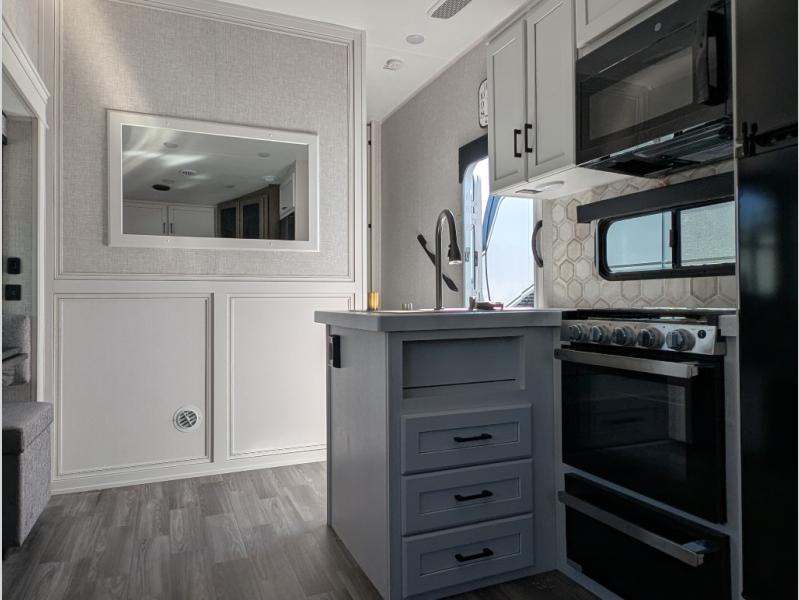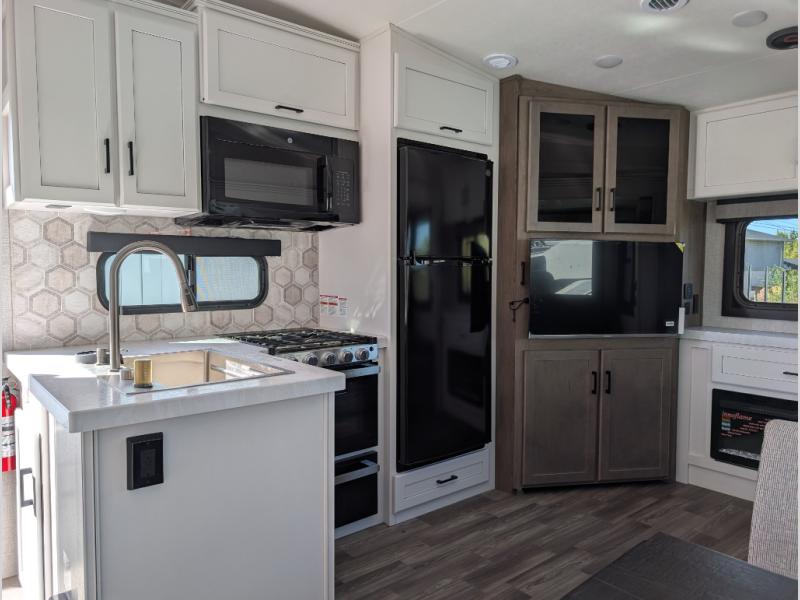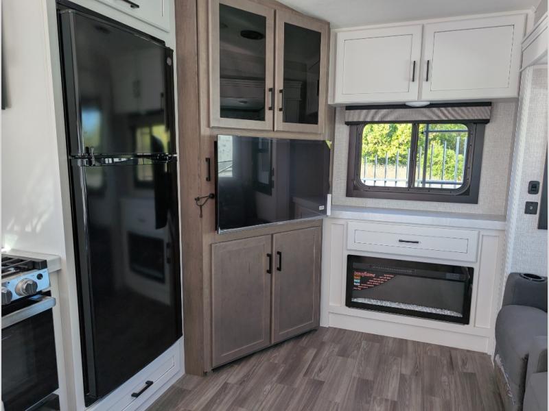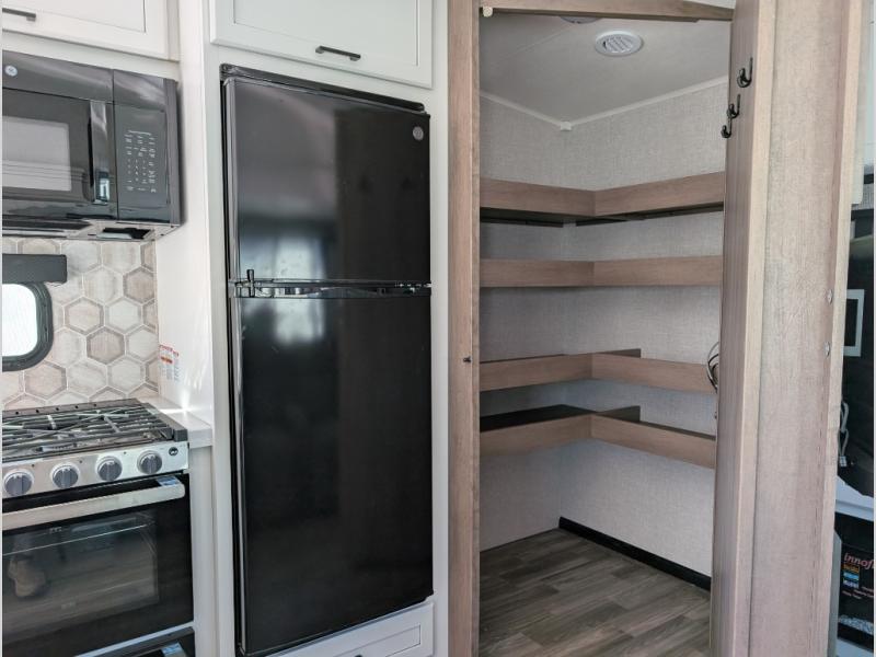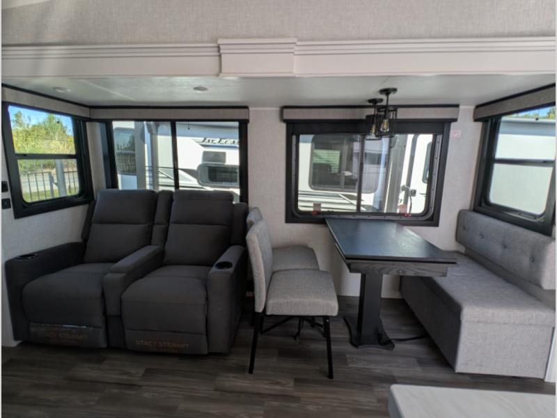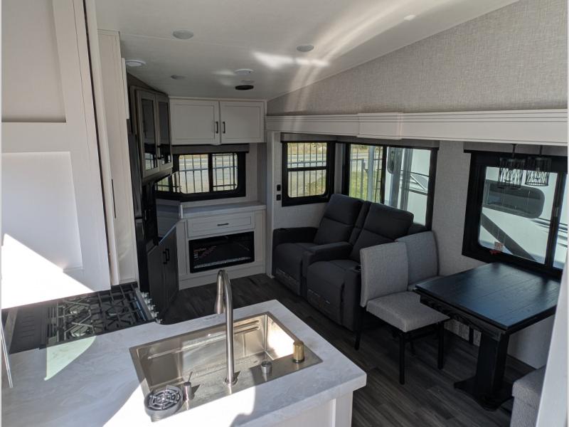 This is the perfect couple's fifth wheel since it features sleeping space for two up front! You can use the dual bedroom wardrobes to store your clothes in, and the full bath is close by so you can get ready each morning. After you've whipped up breakfast in the kitchen, you can dine at the table and chairs with bench seating, then relax with your coffee on the theater seat. There is an entertainment center across from the sofa for convenience, plus a hidden walk-in pantry behind the TV. You might even like to add the fireplace option to make it feel more like home!