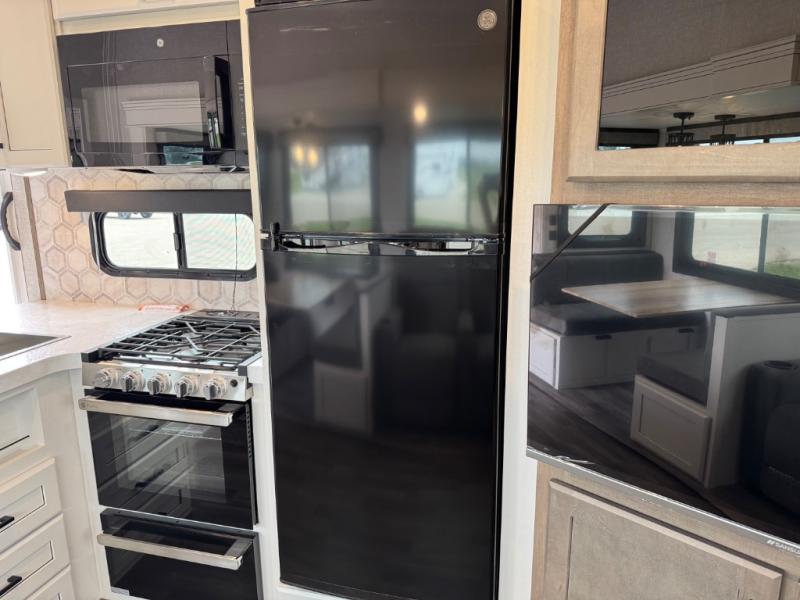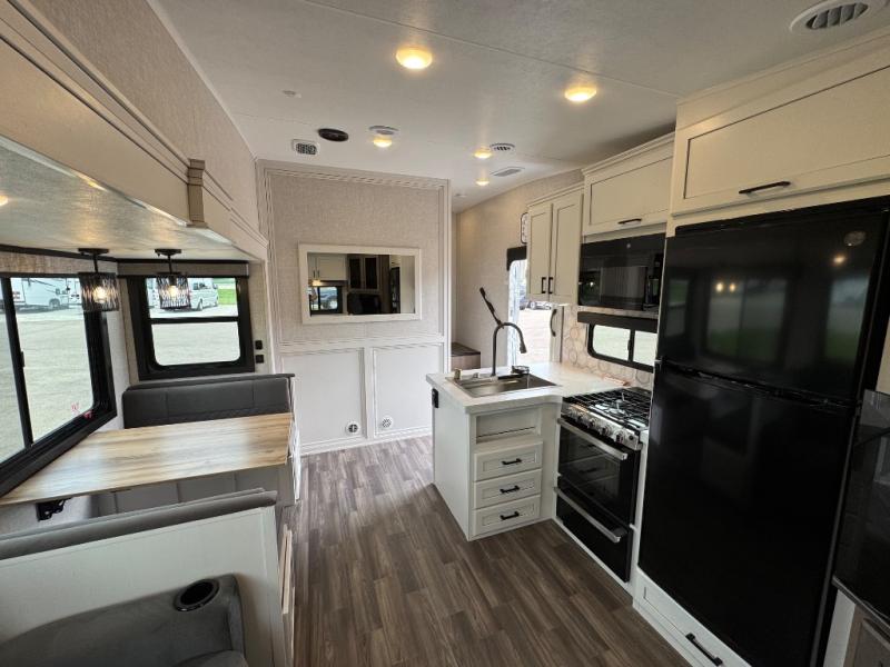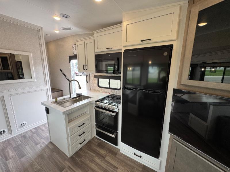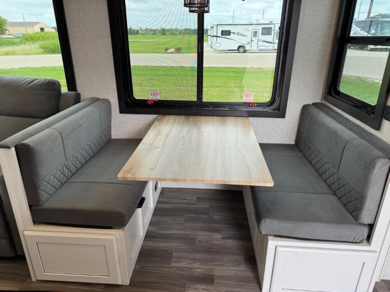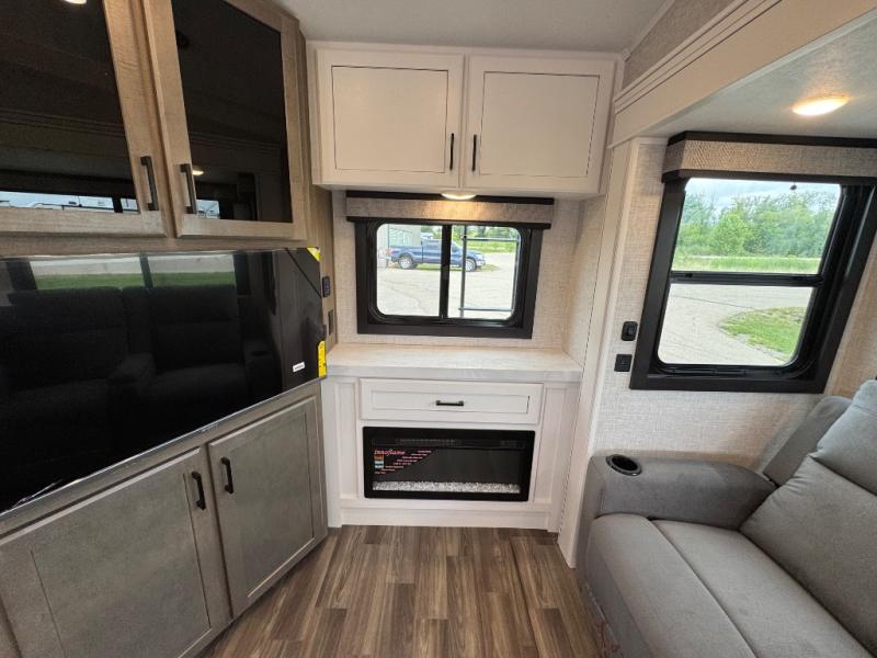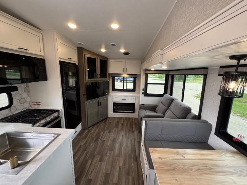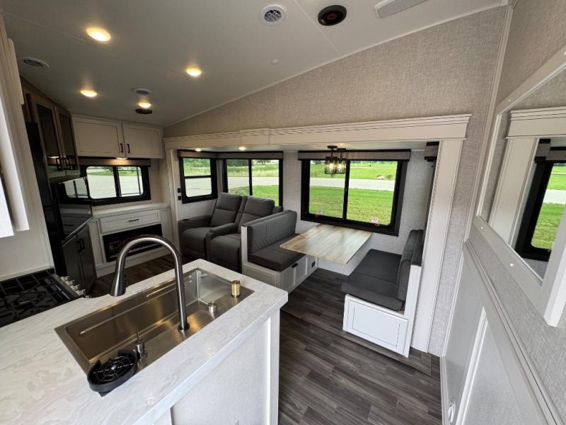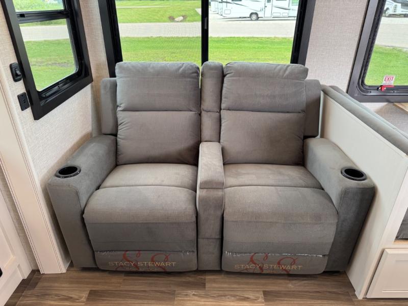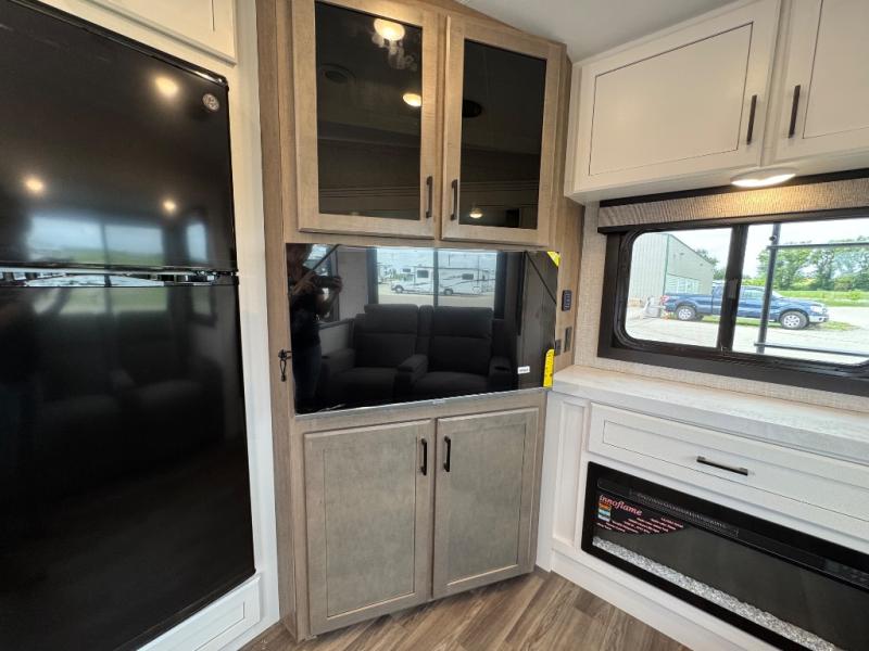 This is the perfect couple's fifth wheel since it features sleeping space for two up front! You can use the dual bedroom wardrobes to store your clothes in, and the full bath is close by so you can get ready each morning. After you've whipped up breakfast in the kitchen, you can dine at the table and chairs with bench seating, then relax with your coffee on the theater seat. There is an entertainment center across from the sofa for convenience, plus a hidden walk-in pantry behind the TV. You might even like to add the fireplace option to make it feel more like home!