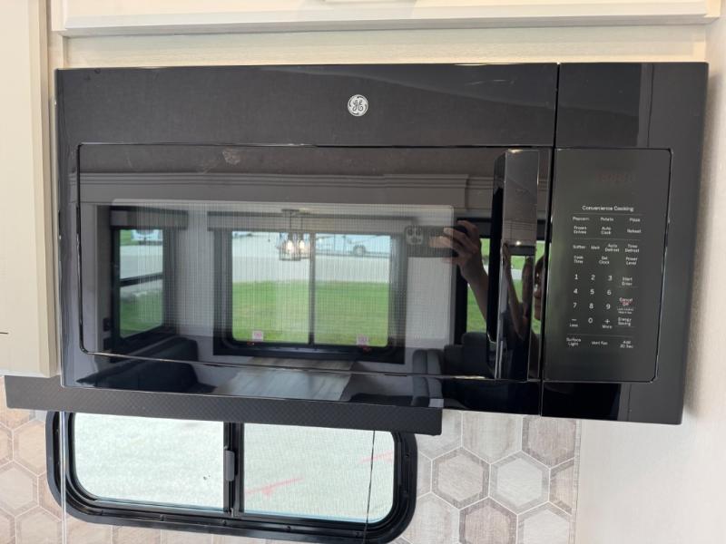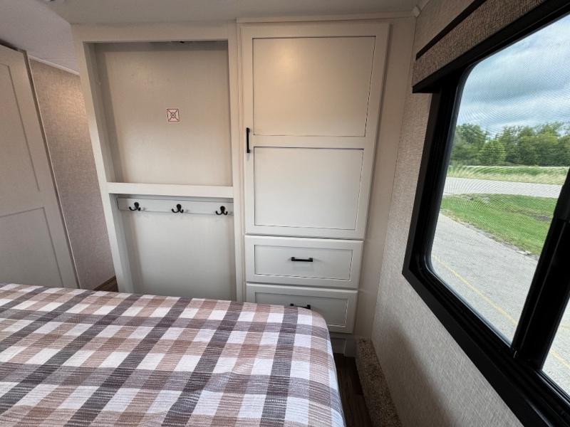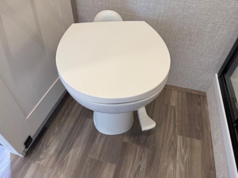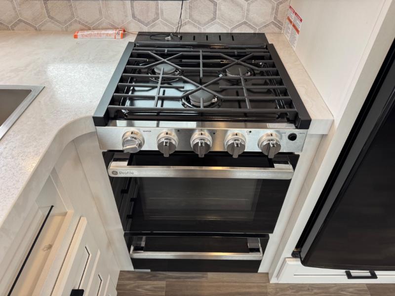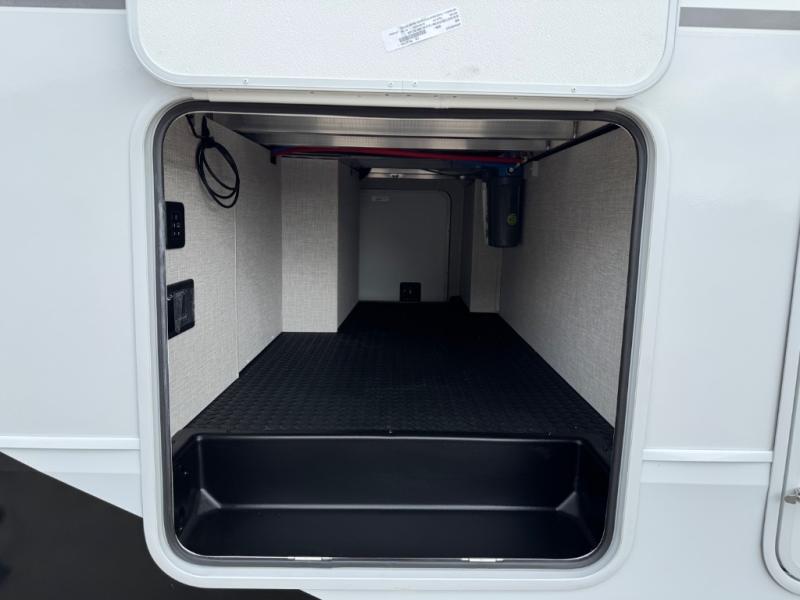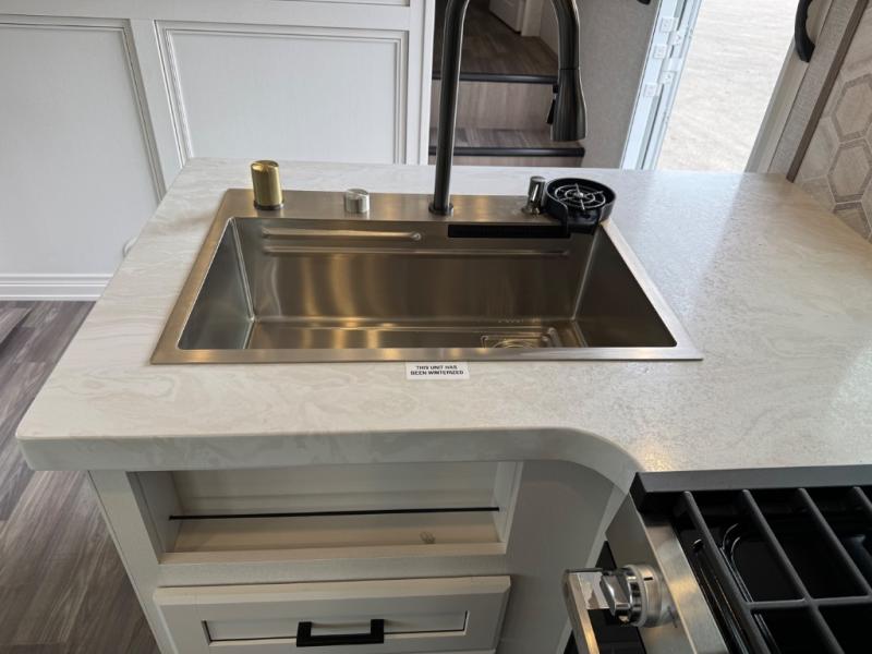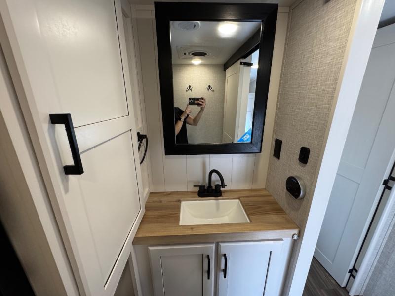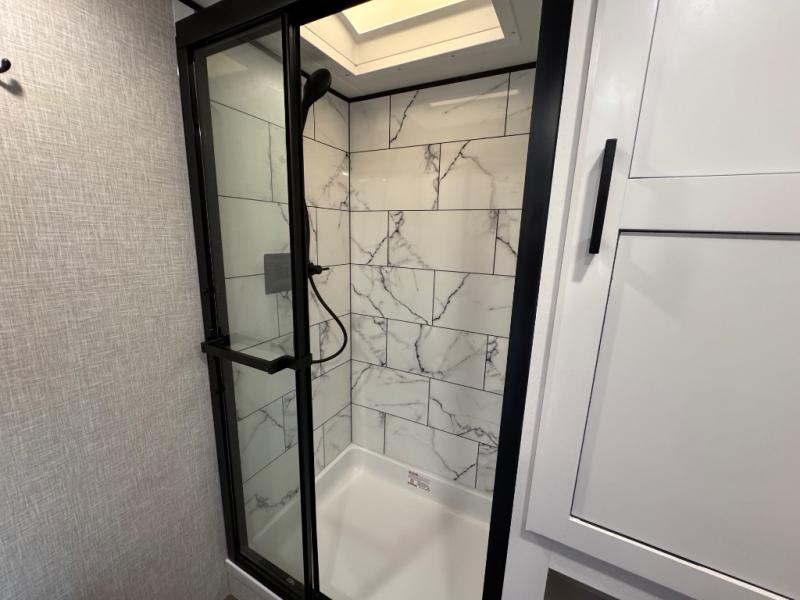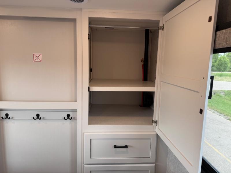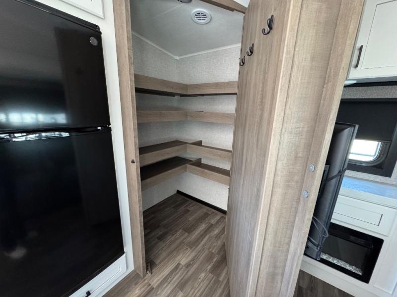 This is the perfect couple's fifth wheel since it features sleeping space for two up front! You can use the dual bedroom wardrobes to store your clothes in, and the full bath is close by so you can get ready each morning. After you've whipped up breakfast in the kitchen, you can dine at the table and chairs with bench seating, then relax with your coffee on the theater seat. There is an entertainment center across from the sofa for convenience, plus a hidden walk-in pantry behind the TV. You might even like to add the fireplace option to make it feel more like home!