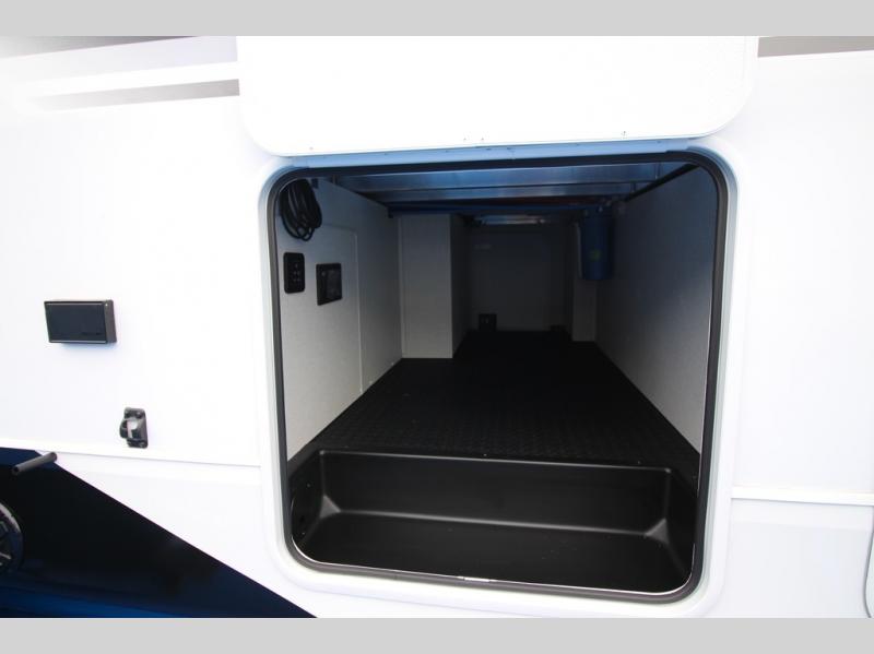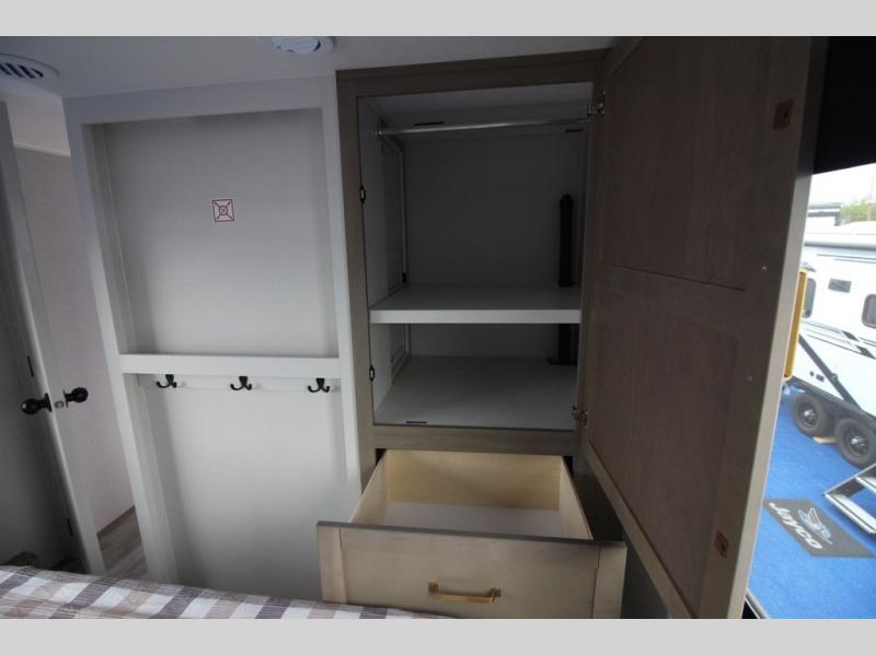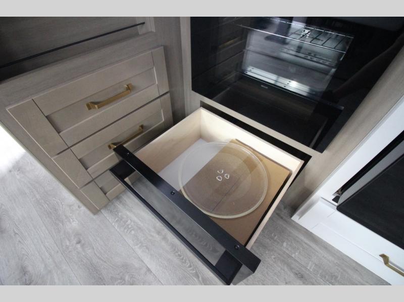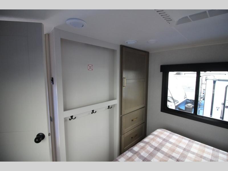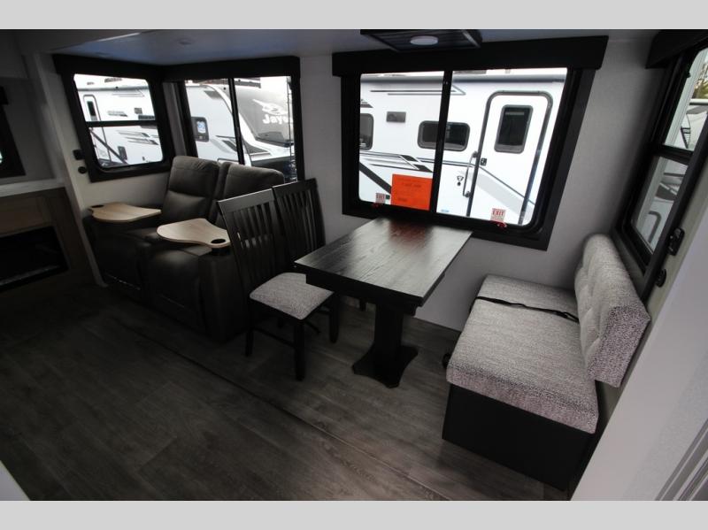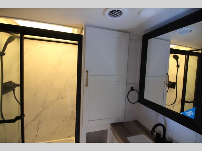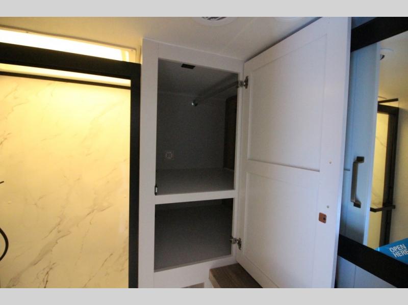 This is the perfect couple's fifth wheel since it features sleeping space for two up front! You can use the dual bedroom wardrobes to store your clothes in, and the full bath is close by so you can get ready each morning. After you've whipped up breakfast in the kitchen, you can dine at the table and chairs with bench seating, then relax with your coffee on the theater seat. There is an entertainment center across from the sofa for convenience, plus a hidden walk-in pantry behind the TV. You might even like to add the fireplace option to make it feel more like home!