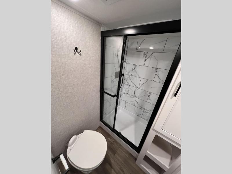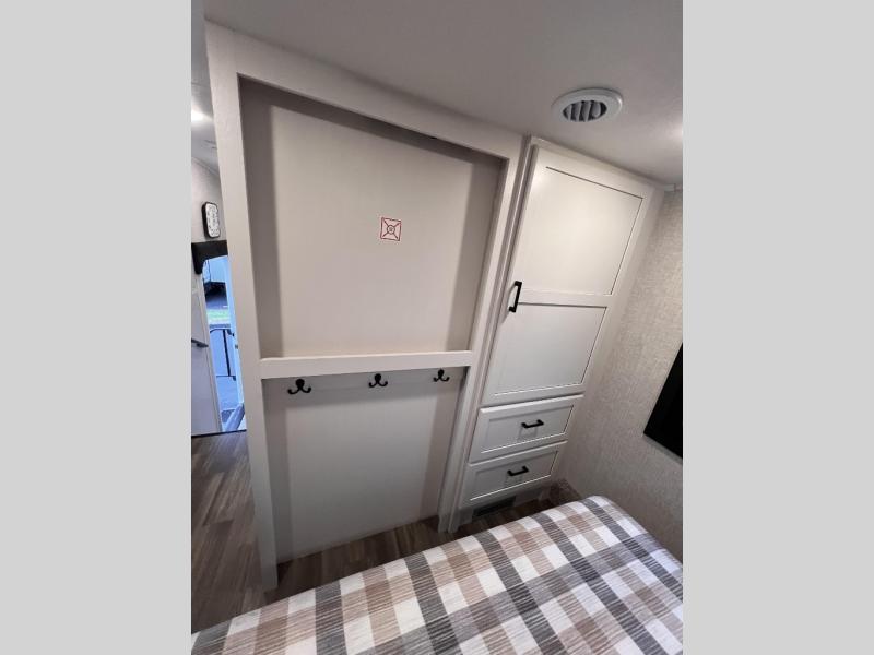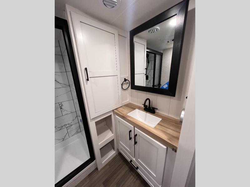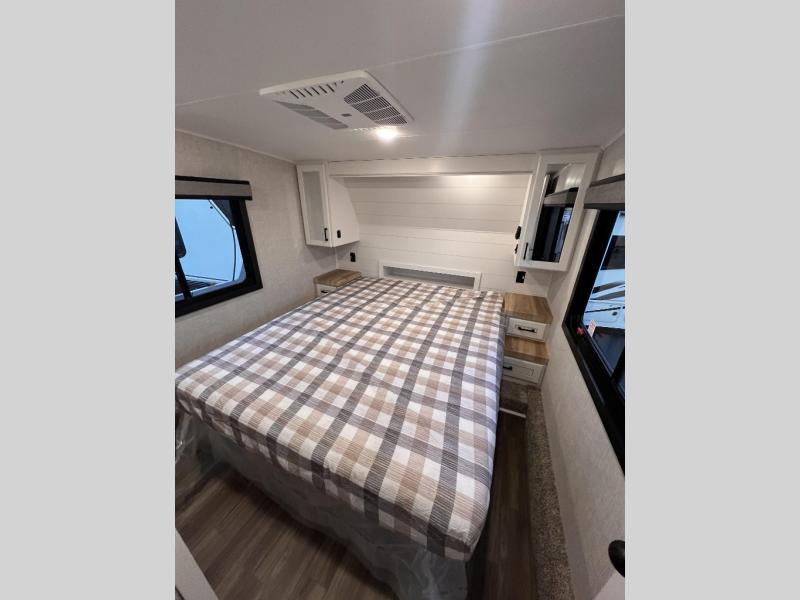 Thanks to inverter pre-wiring, USB ports are always 12V powered, making dry camping easy and reducing power outages. Other amenities that make life in the RV easier include flush floor linoleum flooring throughout the entire fifth wheel. There’s no need to step up or down and it allows for a lower bed height. This user-friendly layout will prevent you from tripping over raises or dips in the floor during the night. Speaking of which, with more overall windows used in the bedroom, more natural lights floods the space, creating a cross breeze, and an open, airy feel; making you feel almost outdoors while enjoying the indoors. Outside, the JayPort hot/cold quick connect and sink provide an excellent space for preparing meals.