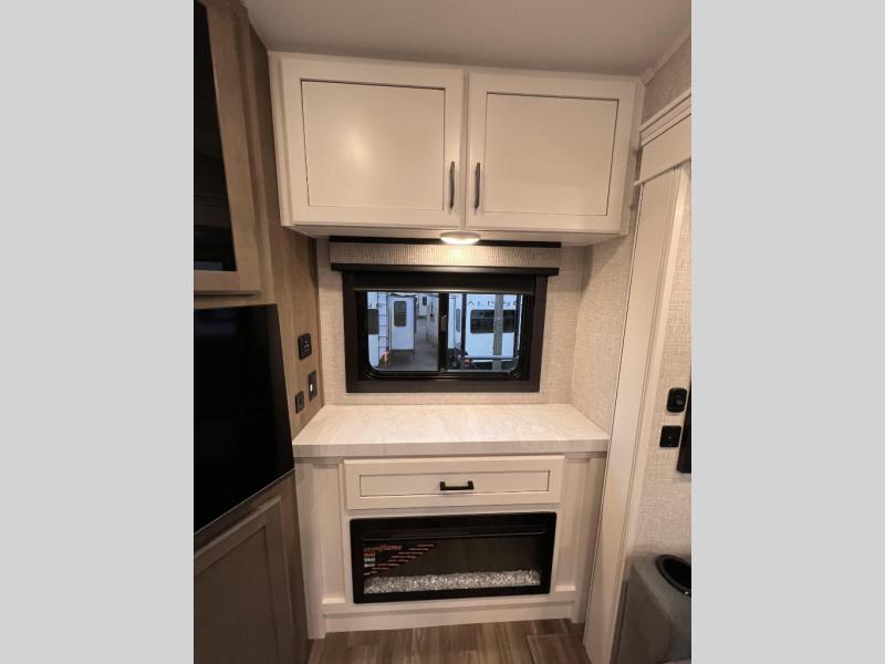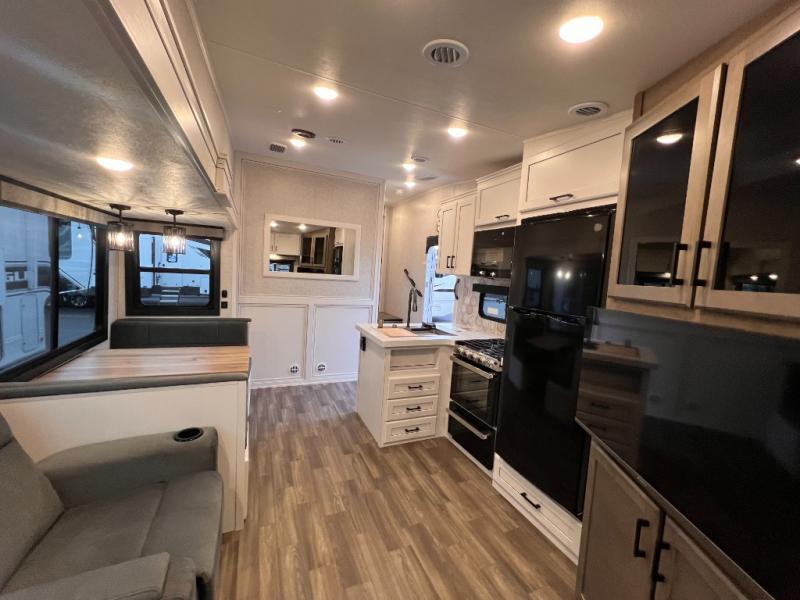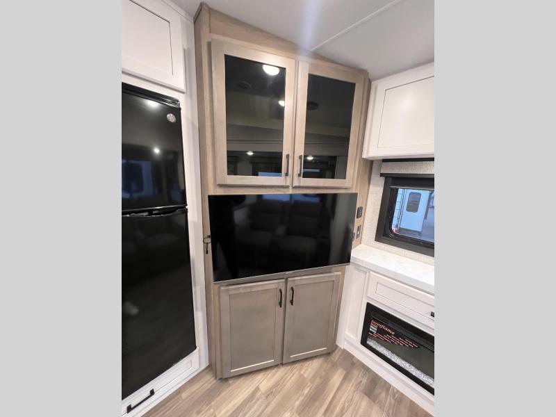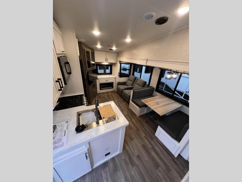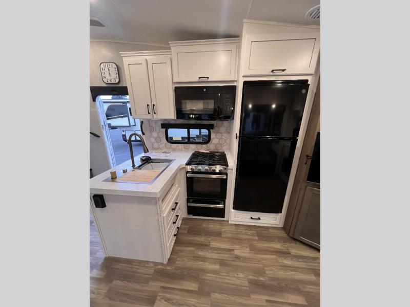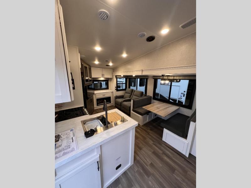 Just like its bigger fifth wheel siblings, the Eagle HT Fifth Wheel it's warrantied for full-time RV use and has our 2+3 warranty. It also has HELIX ducting with Whisper Quiet technology. This improved vent design, a curved, helix-shaped system, maximizes air flow and efficiency, while Whisper Quiet technology provides a quieter cool than traditional RV A/C systems. Additionally, the Eagle HT Fifth Wheel has GE Appliances, including a 12V refrigerator that cools quicker, is 10-13% more efficient on battery, and has a freezer that is five degrees colder freezer than the competition. Finding larger, brand name appliances with an edge-to-edge grates and easy-to-clean oven in a smaller fifth wheel speaks to the luxury found in every Jayco product.